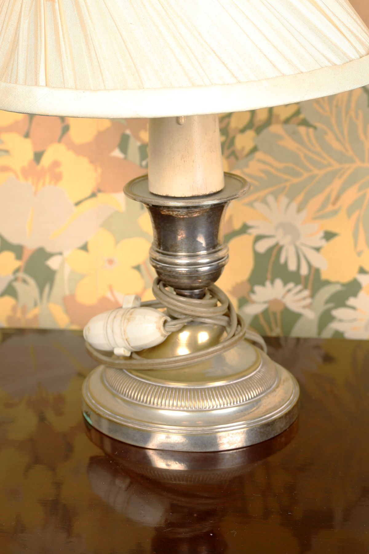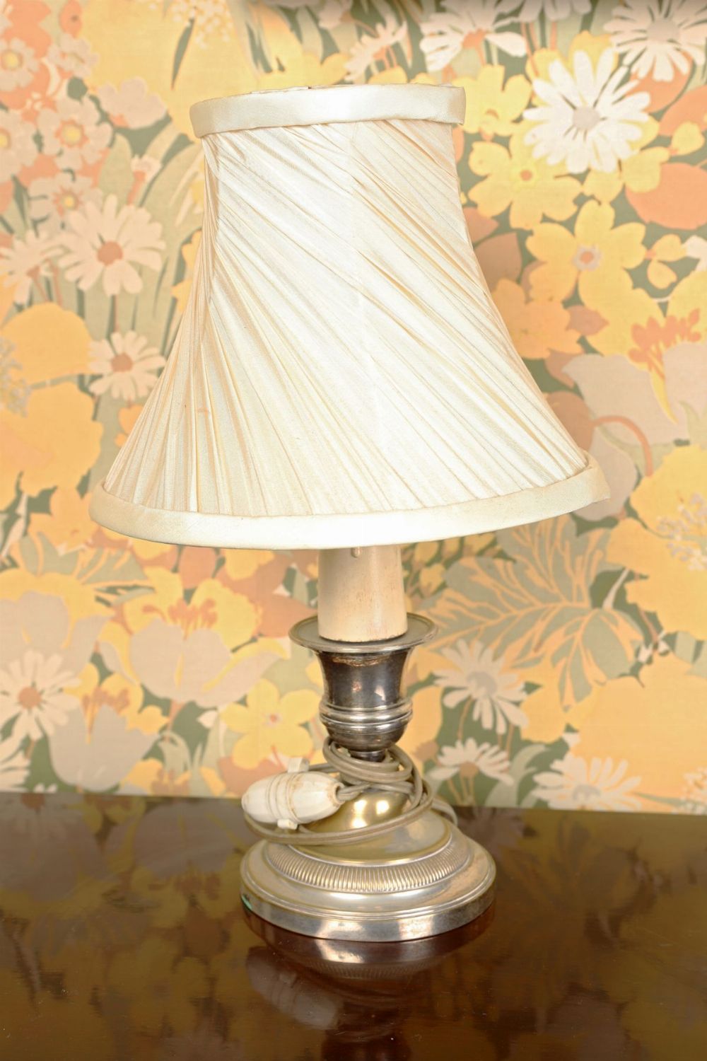 The silver-plated candlestick-form column on a shaped base, converted for electricity and fitted with a shade.