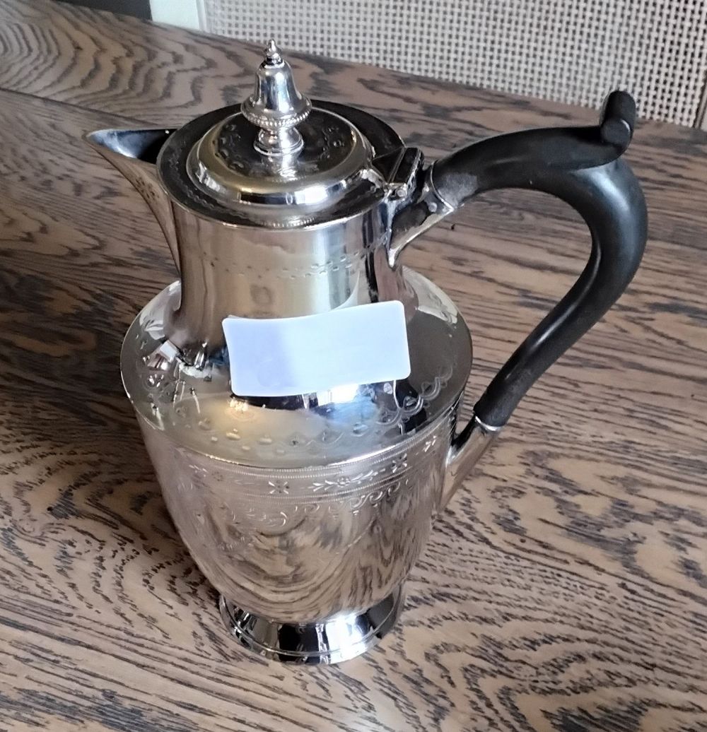 Classical silver-plated coffee pot with scrolling black composite handle and finial, engraved with neoclassical motifs to the body.