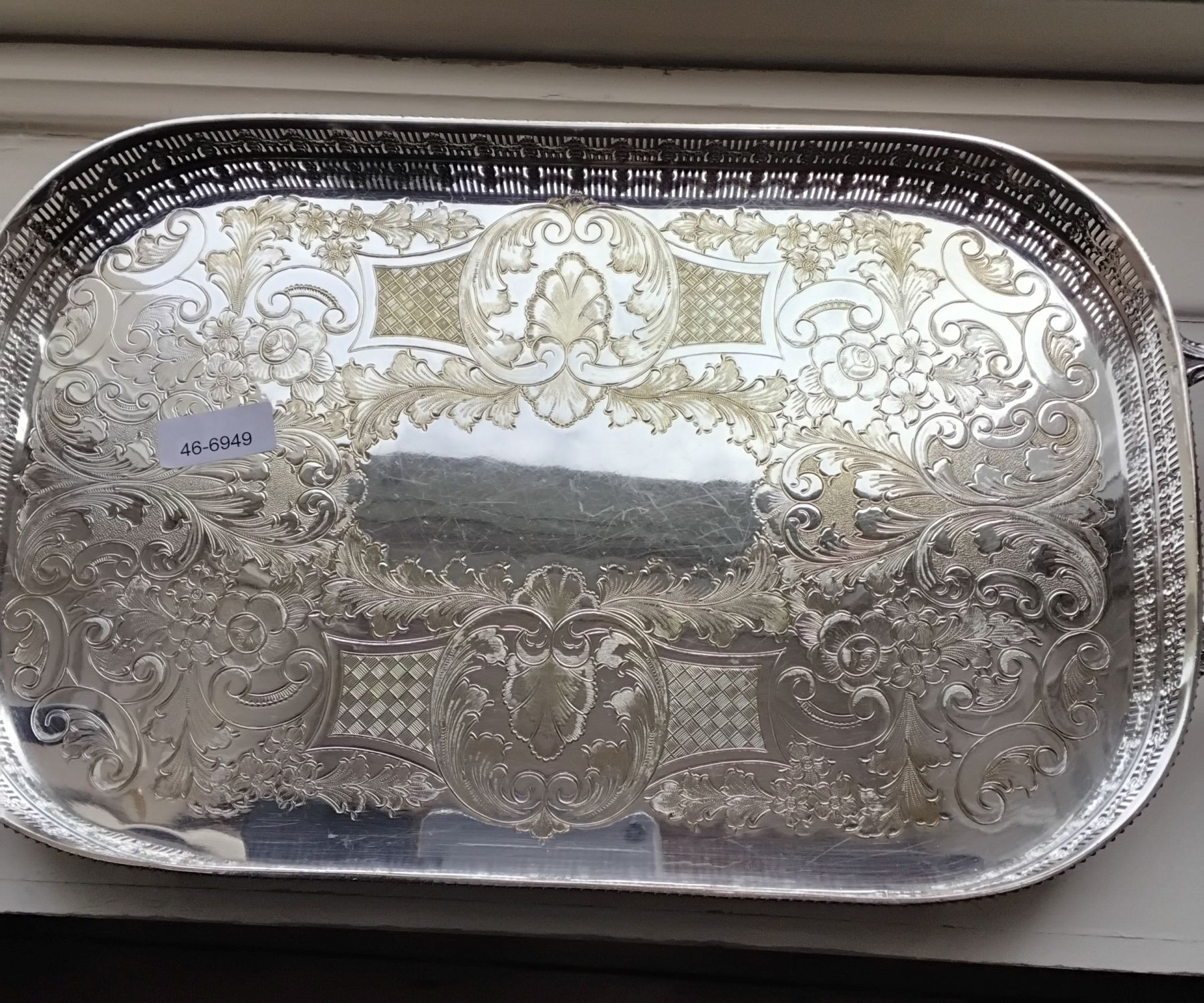Large silver-plated rectangular tray with pierced gallery sides, scrolled handles, and engraved rococo-style decoration to the base. Raised on bun feet.