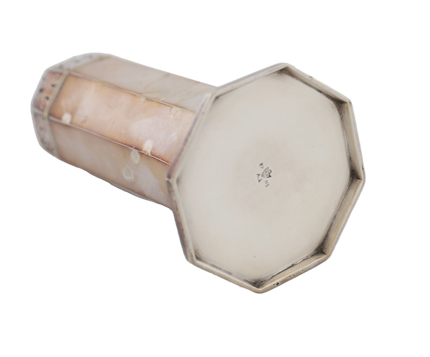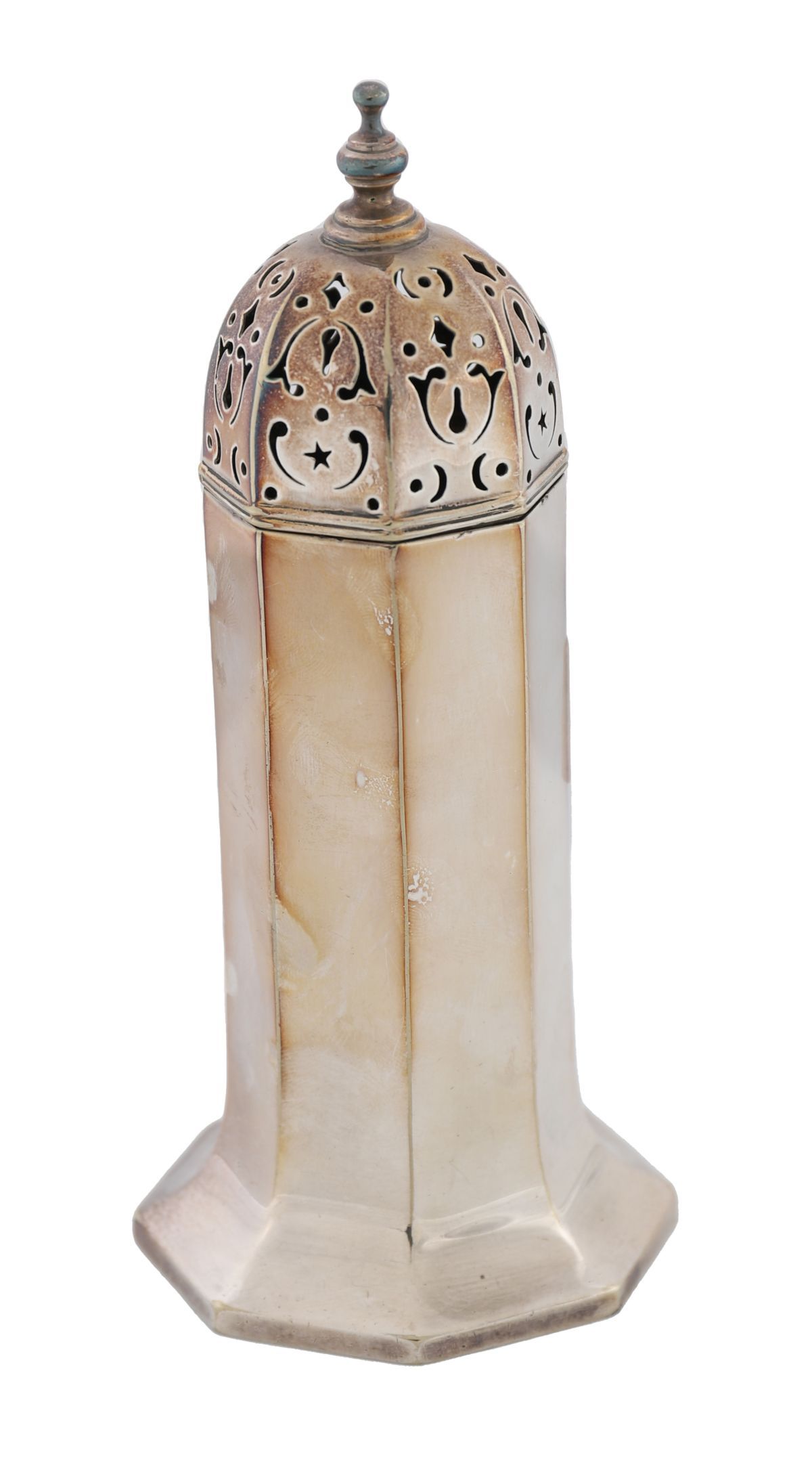 Octagonal form with pierced domed cover.