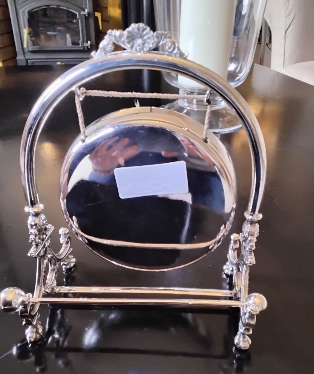 Decorative silver-plated table gong with circular striker and cast supports in the form of figures and foliage, suspended on a shaped arched frame.