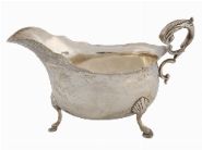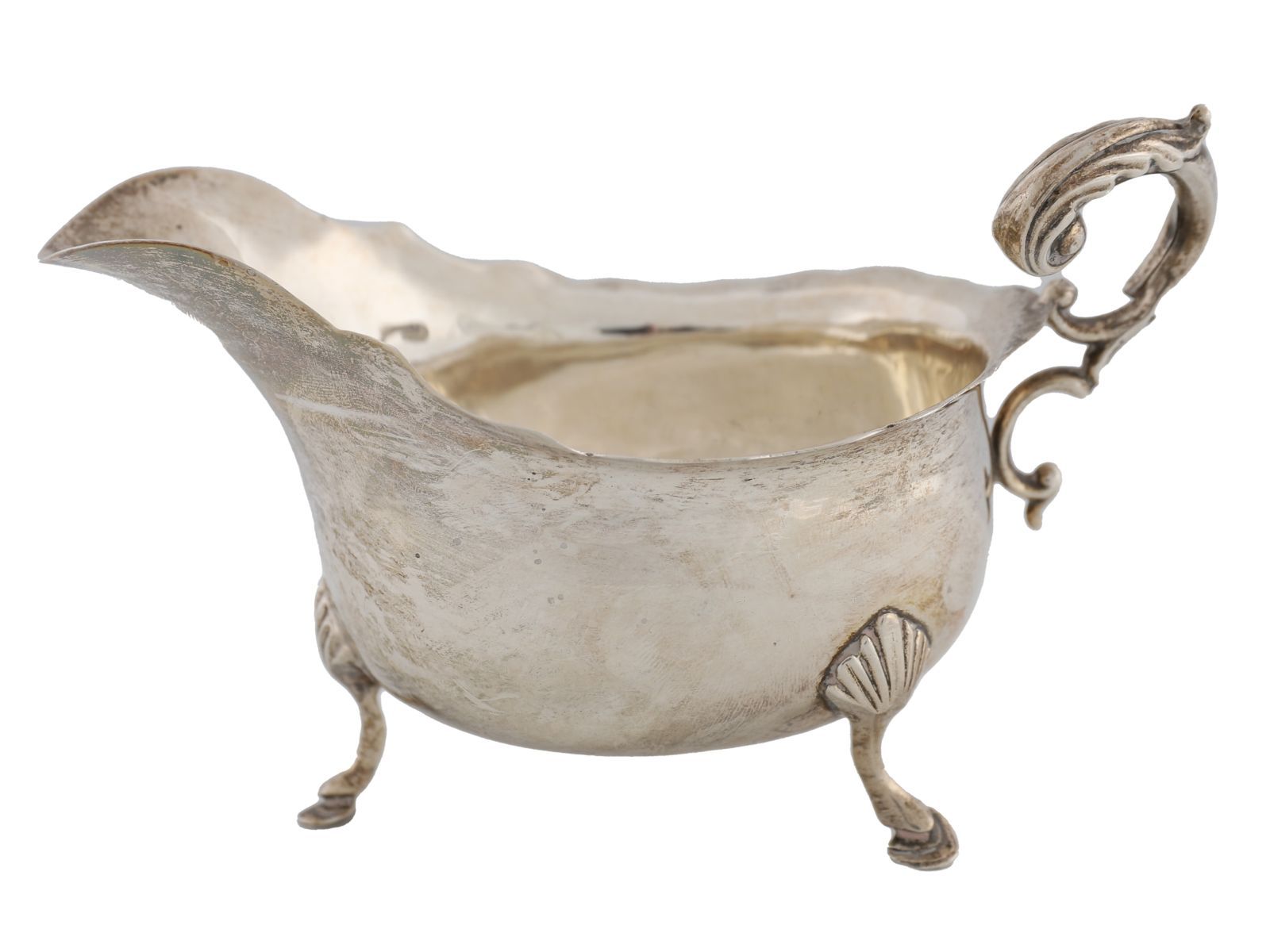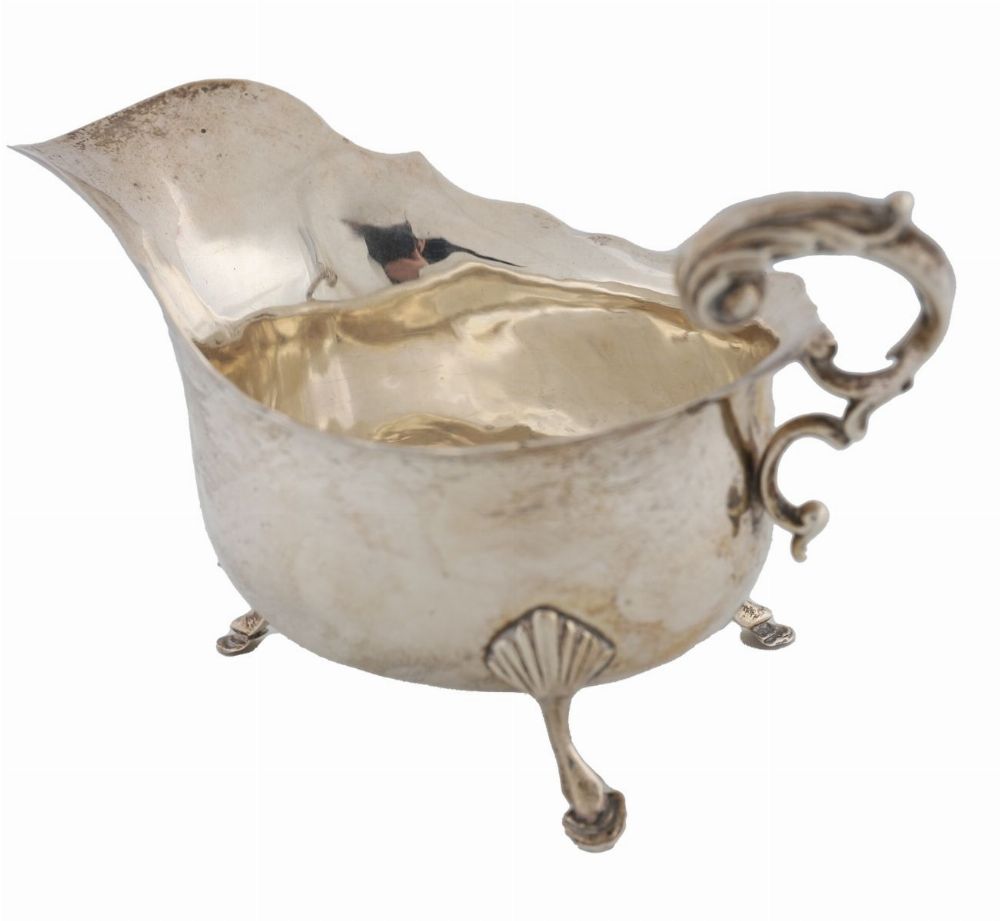 Birmingham, 1925. Of compact form with shaped lip, scroll handle, and raised on three hoof-style feet.