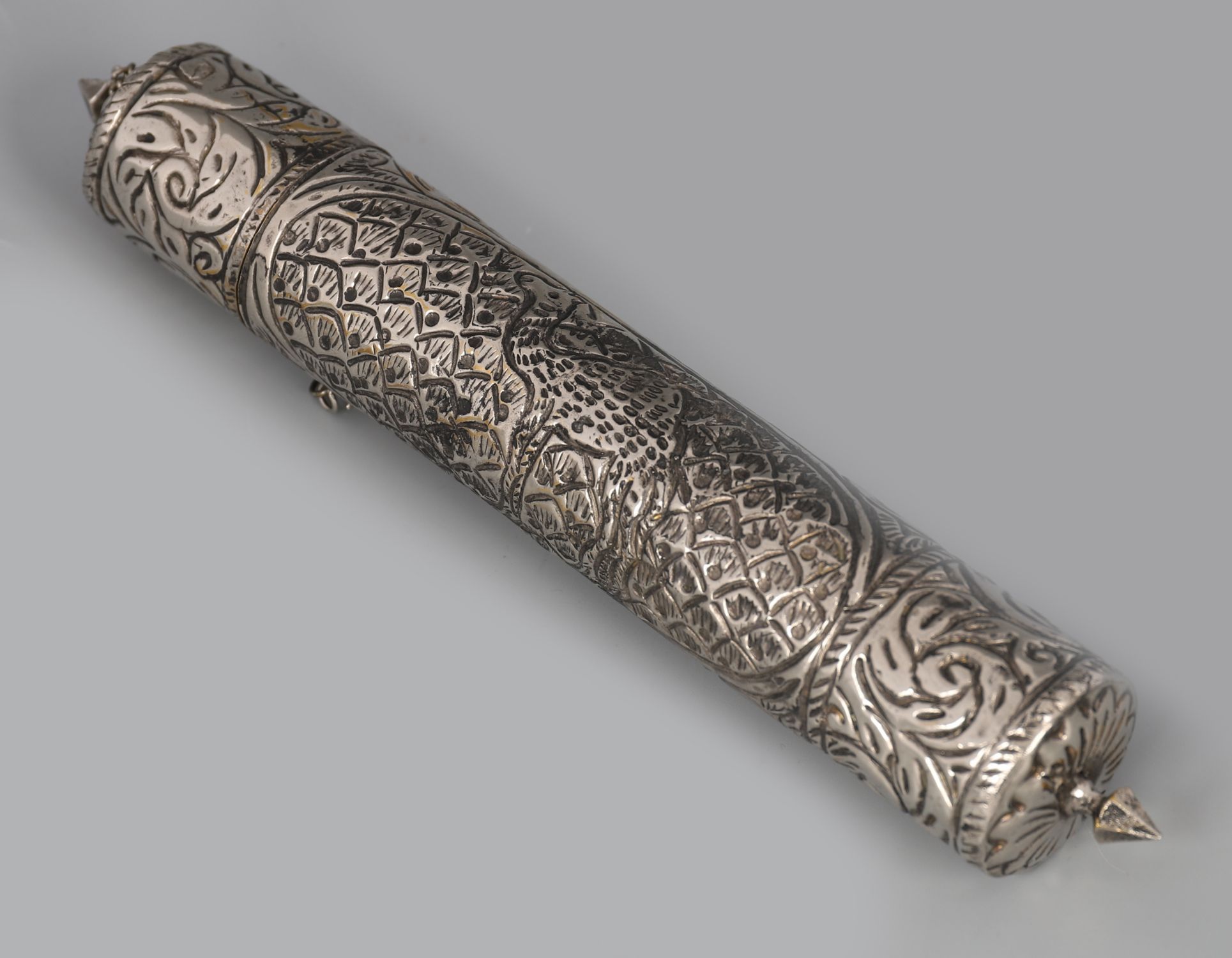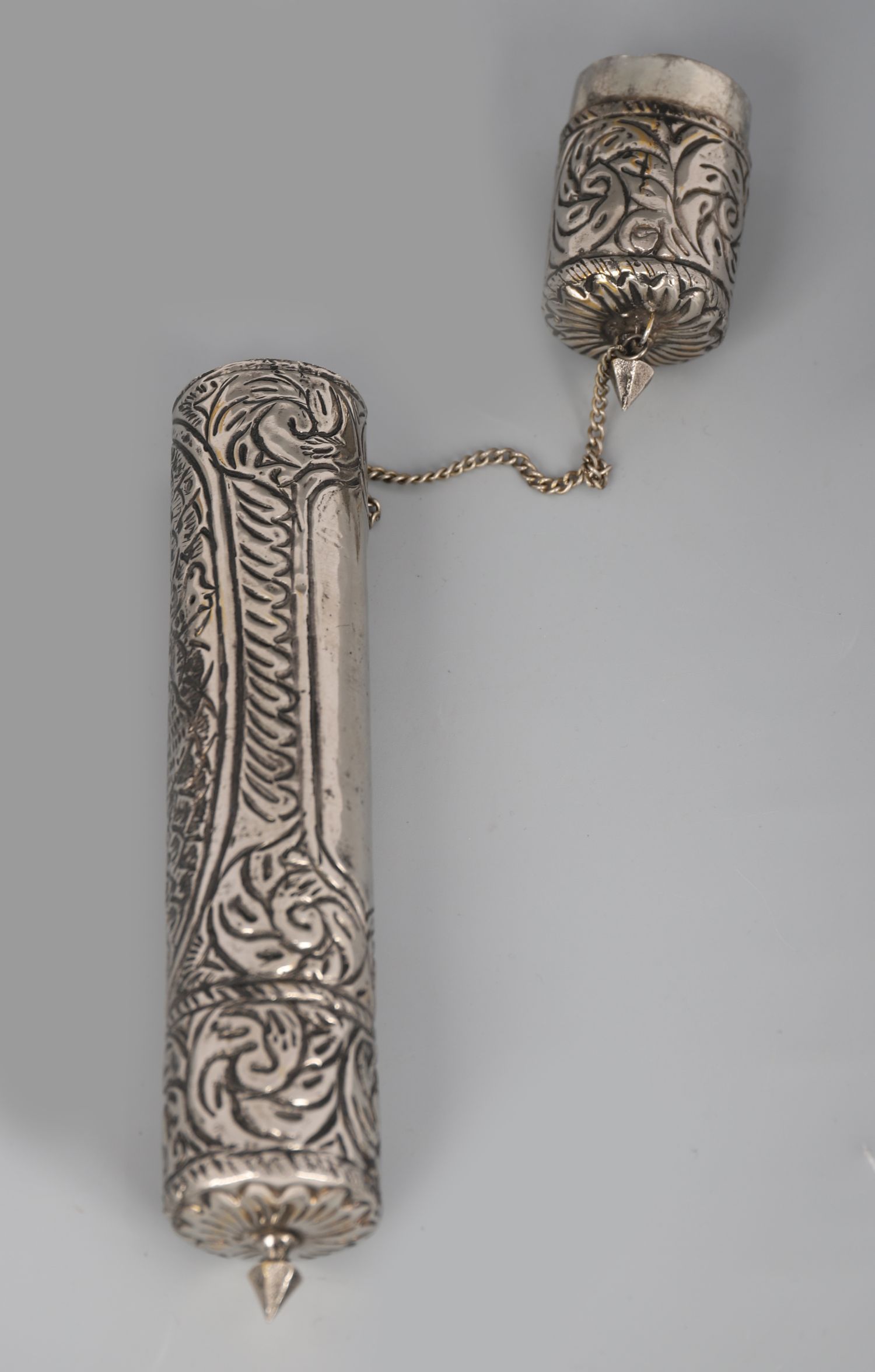 A 19th century silver scroll holder, cylindrical with chased foliate designs and detachable ends.