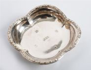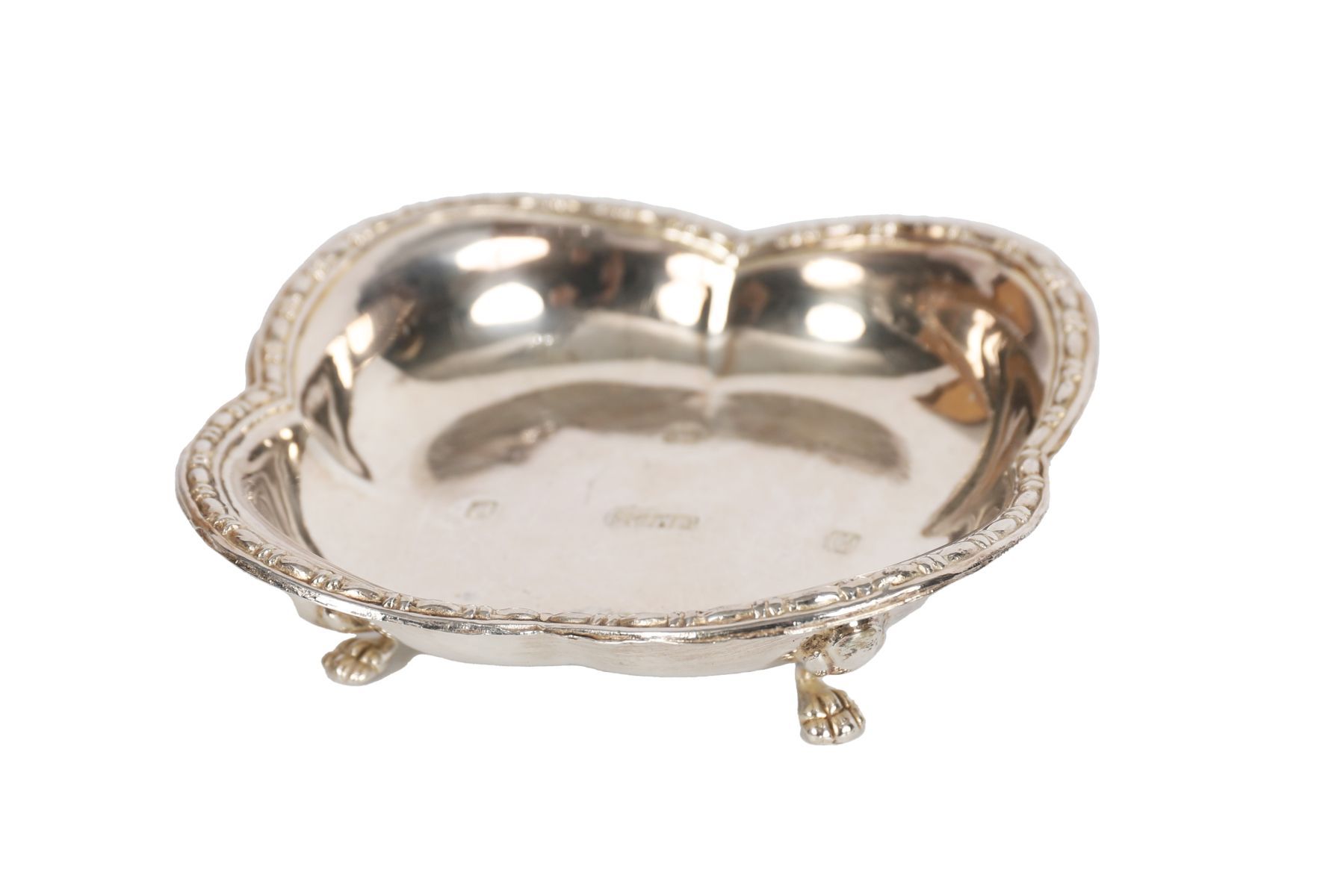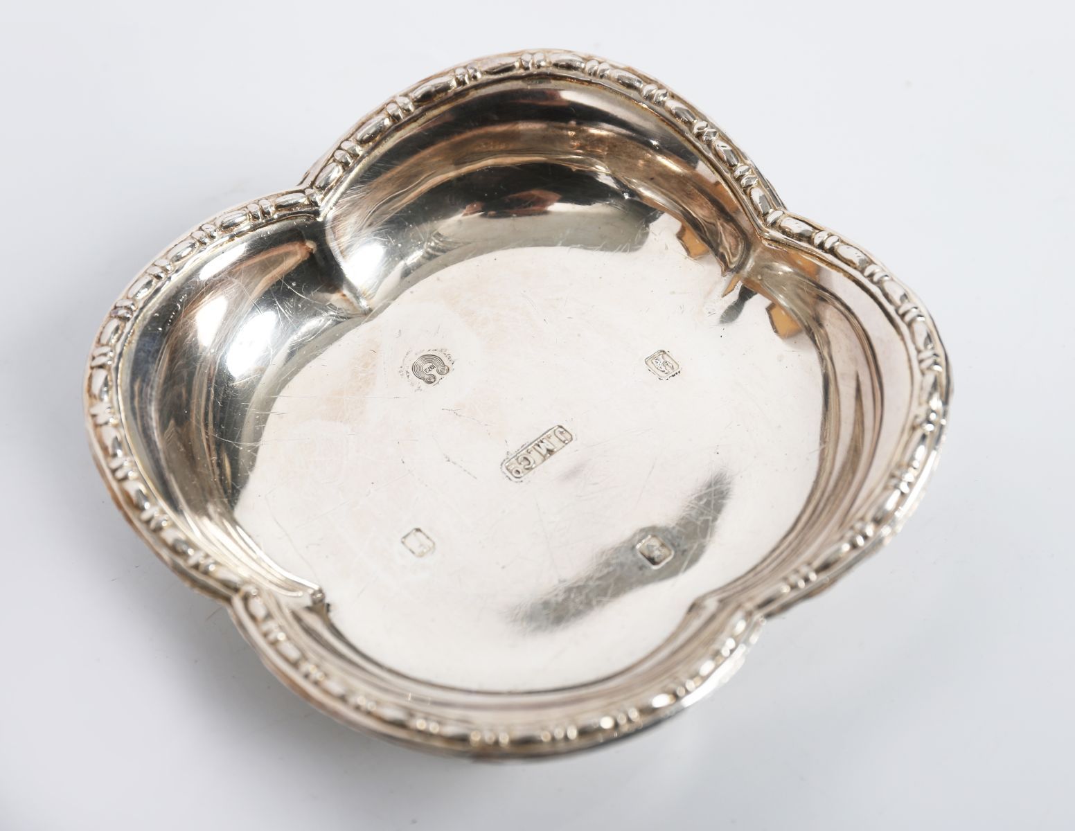 A small, hallmarked silver trinket or pin dish of quatrefoil form with beaded border, Dublin 1973.
