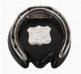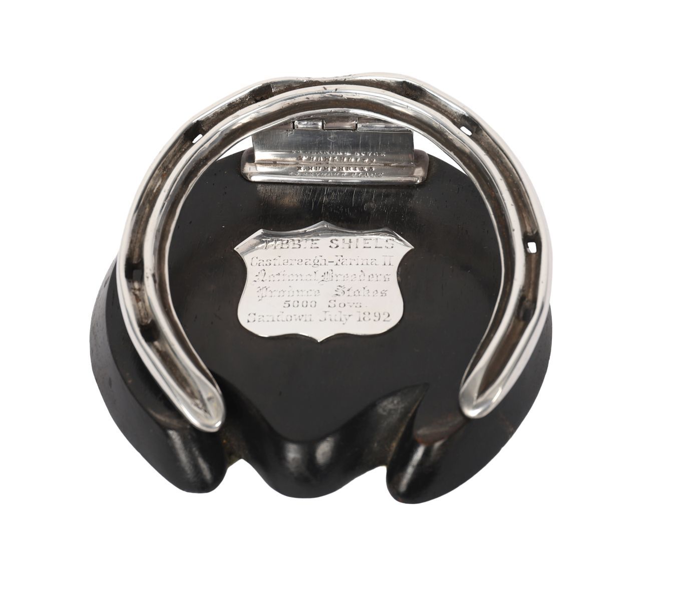 A silver-mounted hoof ashtray inscribed “Tibbie Shiels, Castlereagh – Farina II, National Breeders Produce Stakes, 5000 Sovs, Sandown July 1892.” Late 19th century.