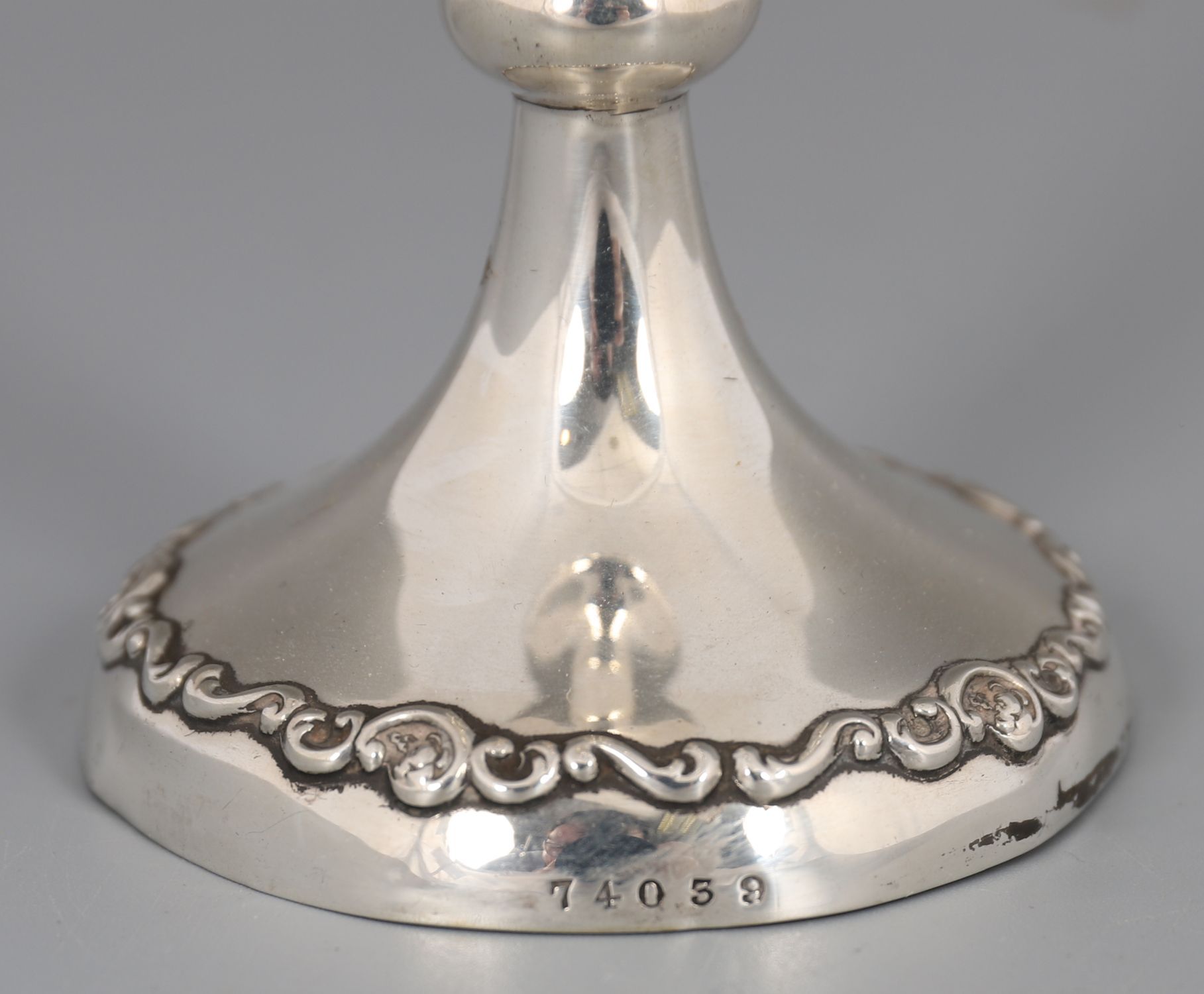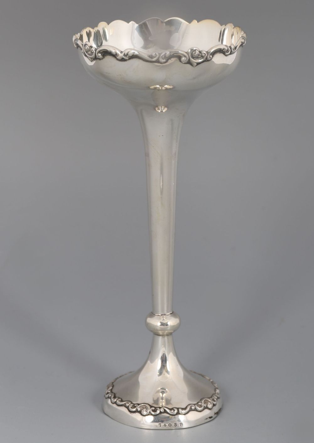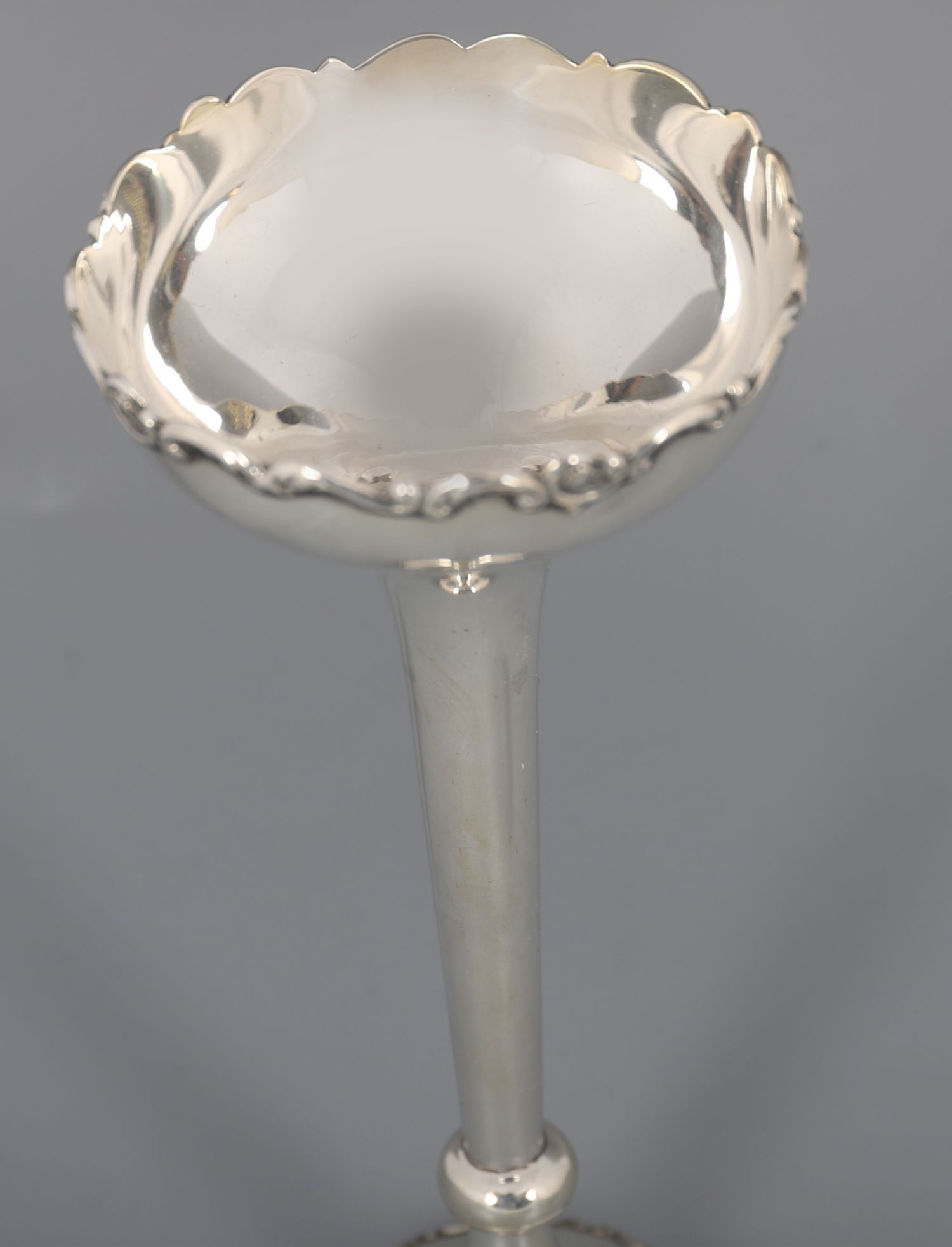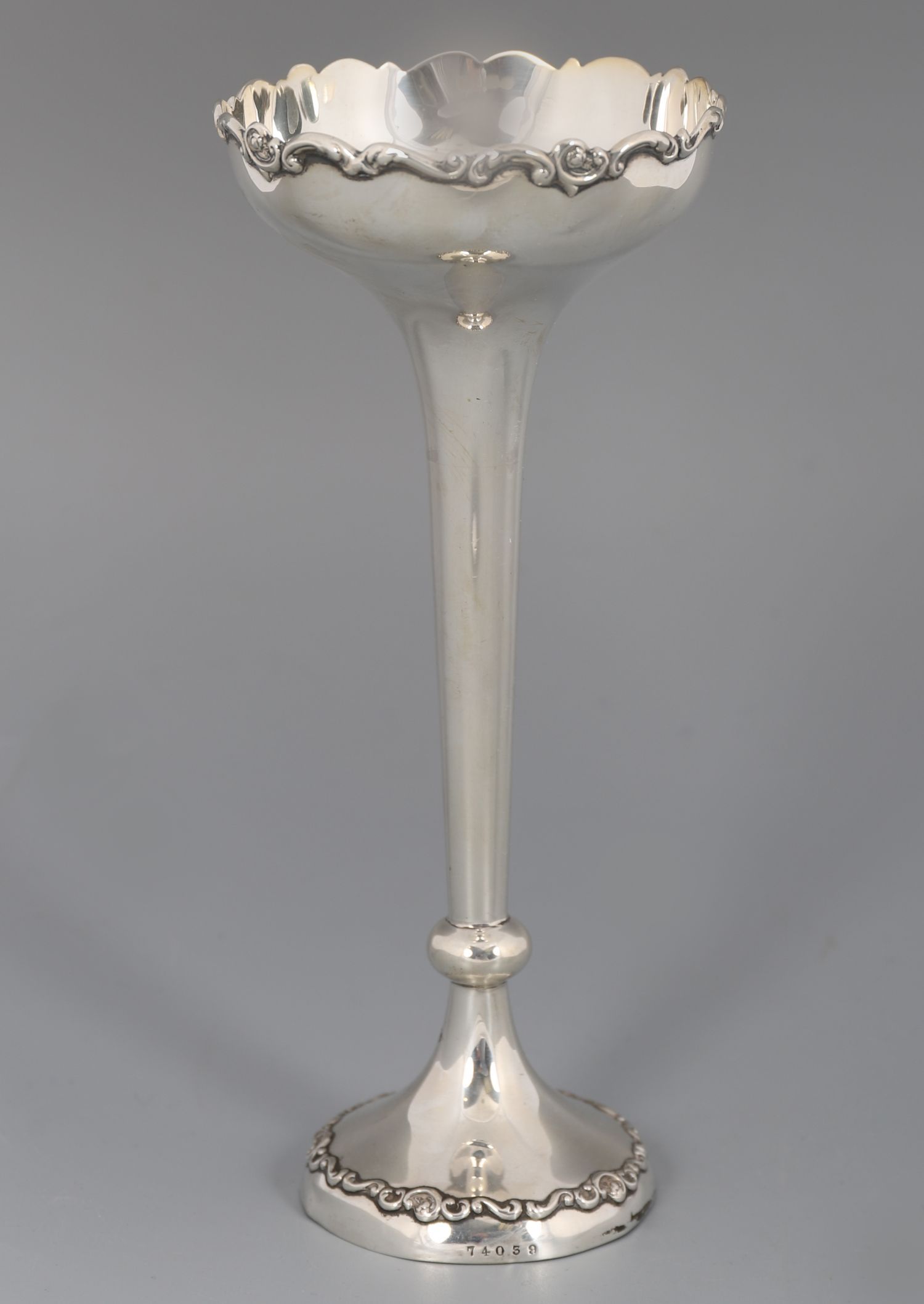 A silver bud vase with shaped scroll rim and embossed decoration to base and lip, hallmarked London 1902.