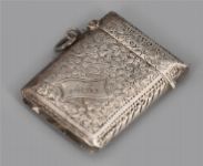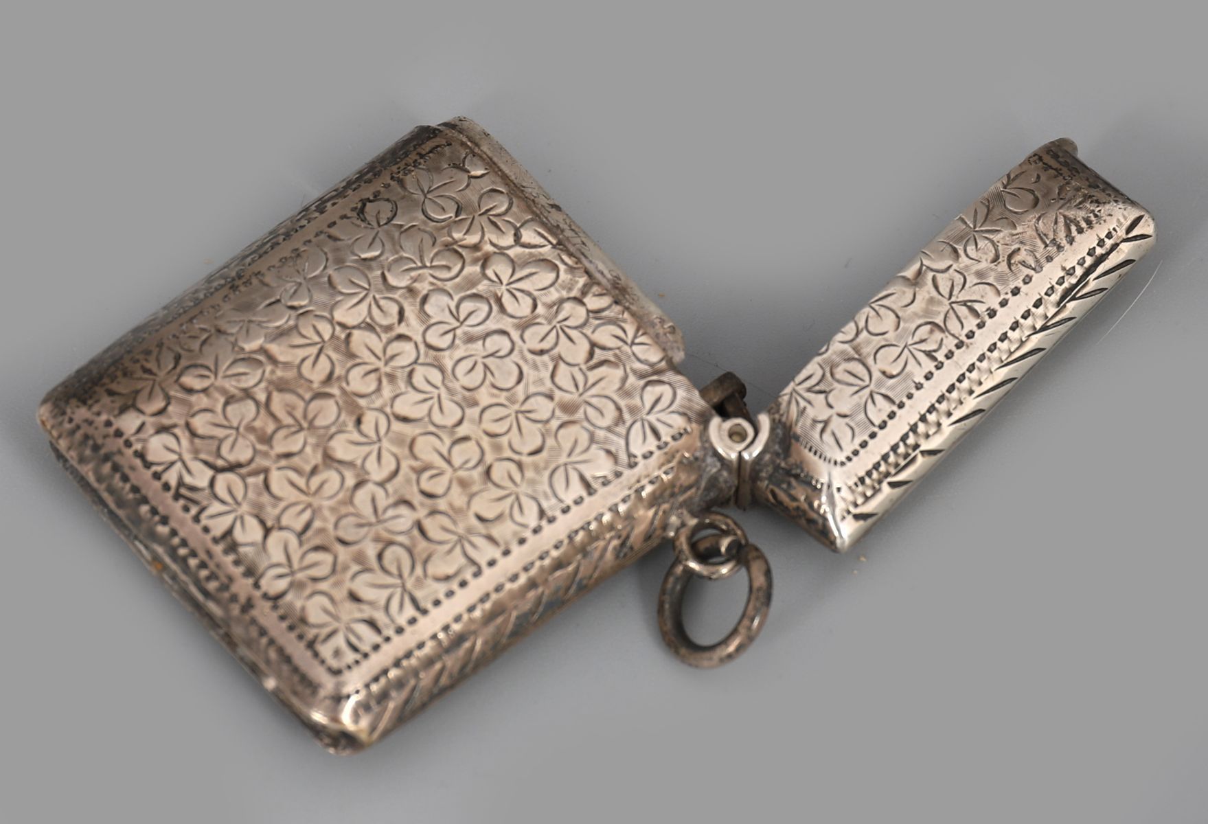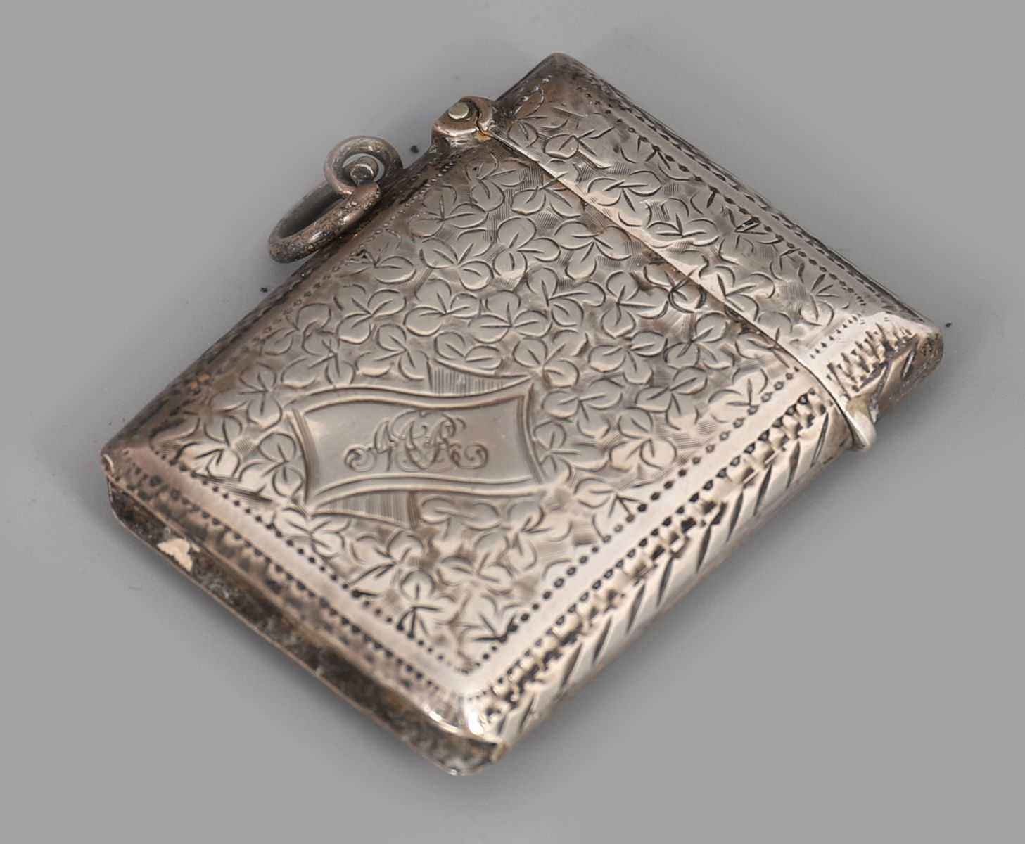 A silver vesta case with hinged cover, decorated with foliate scroll and clover engraving, striker to base.