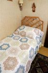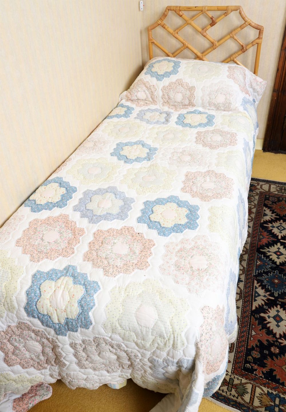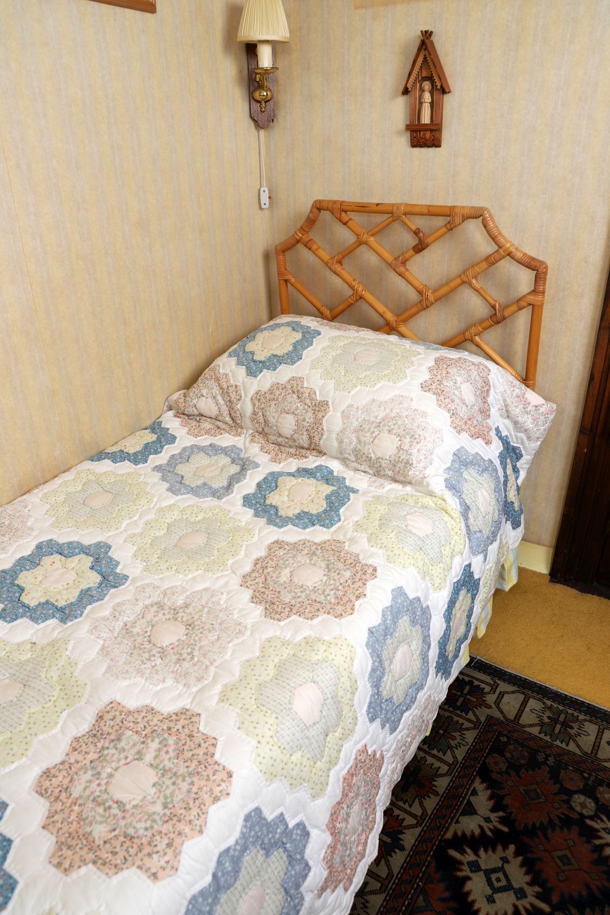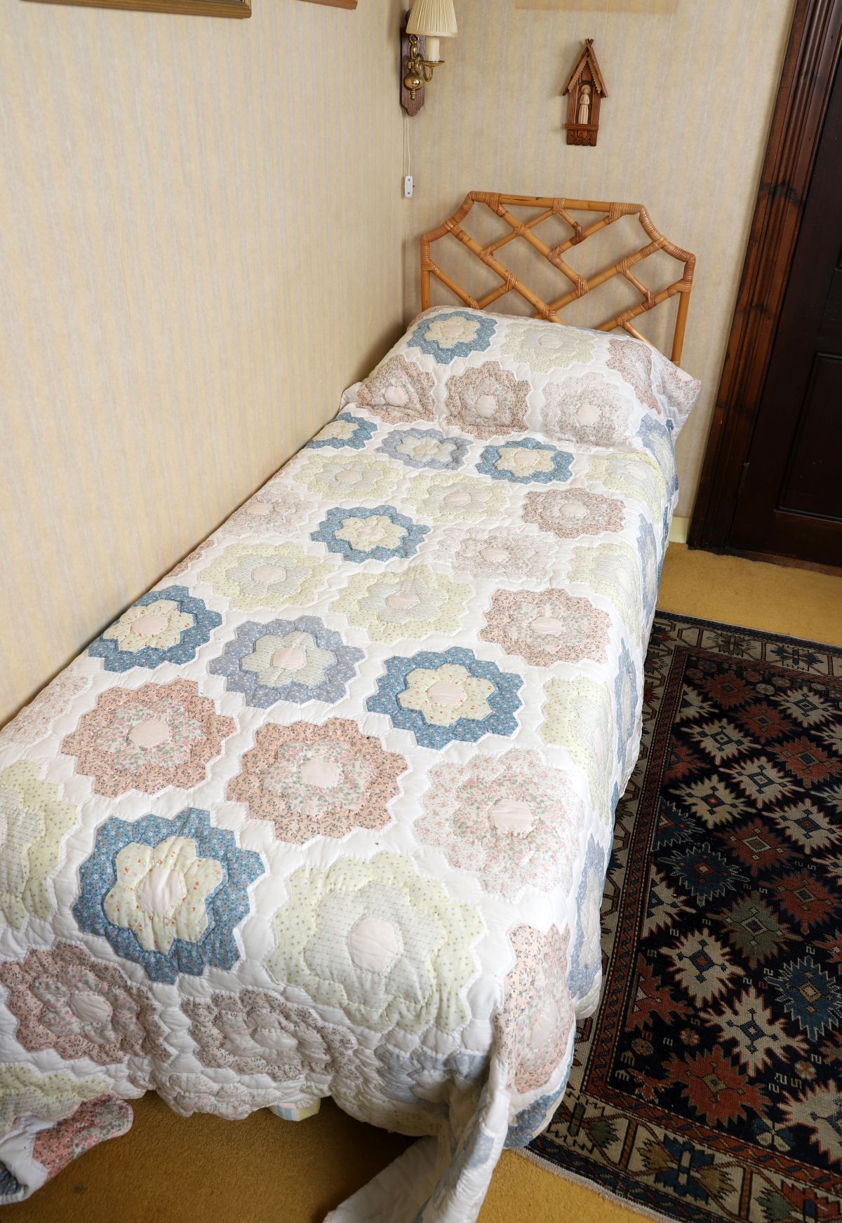 A single bed fitted with a bamboo-framed headboard of geometric lattice design.