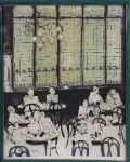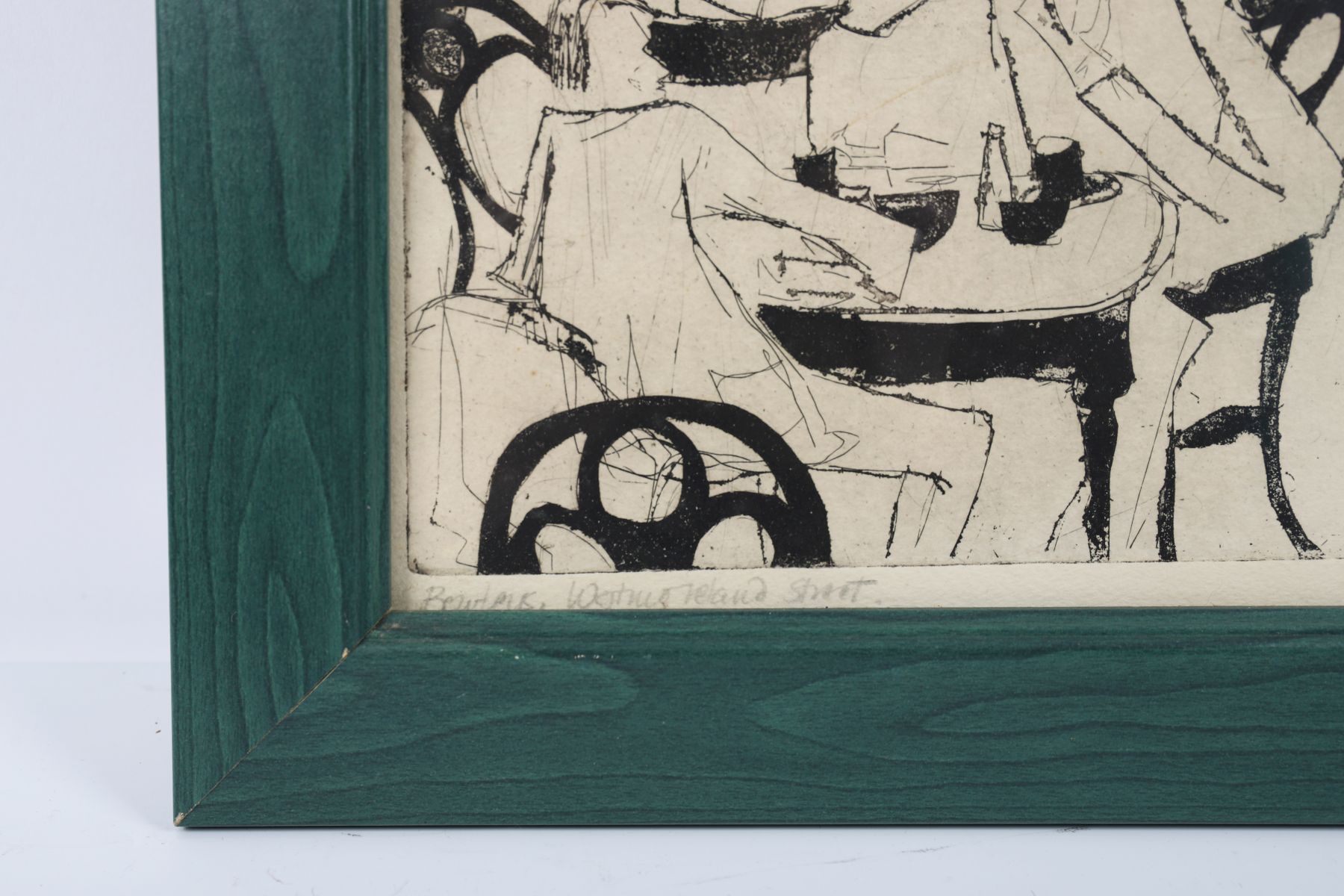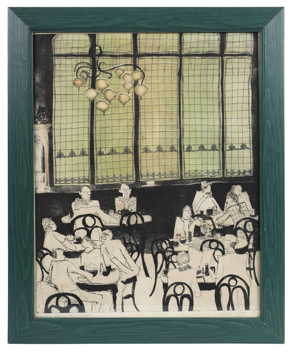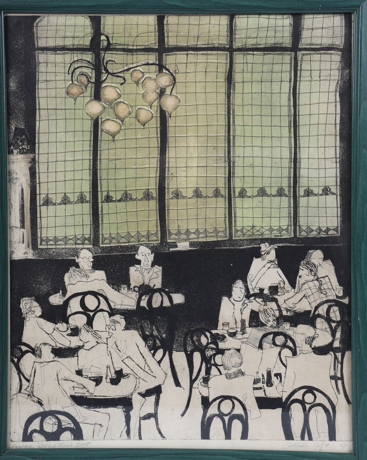 Lithograph depicting the interior of Bewley’s Café, with seated patrons and distinctive stained-glass windows. Signed and inscribed Artist’s Proof by the artist.