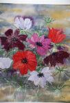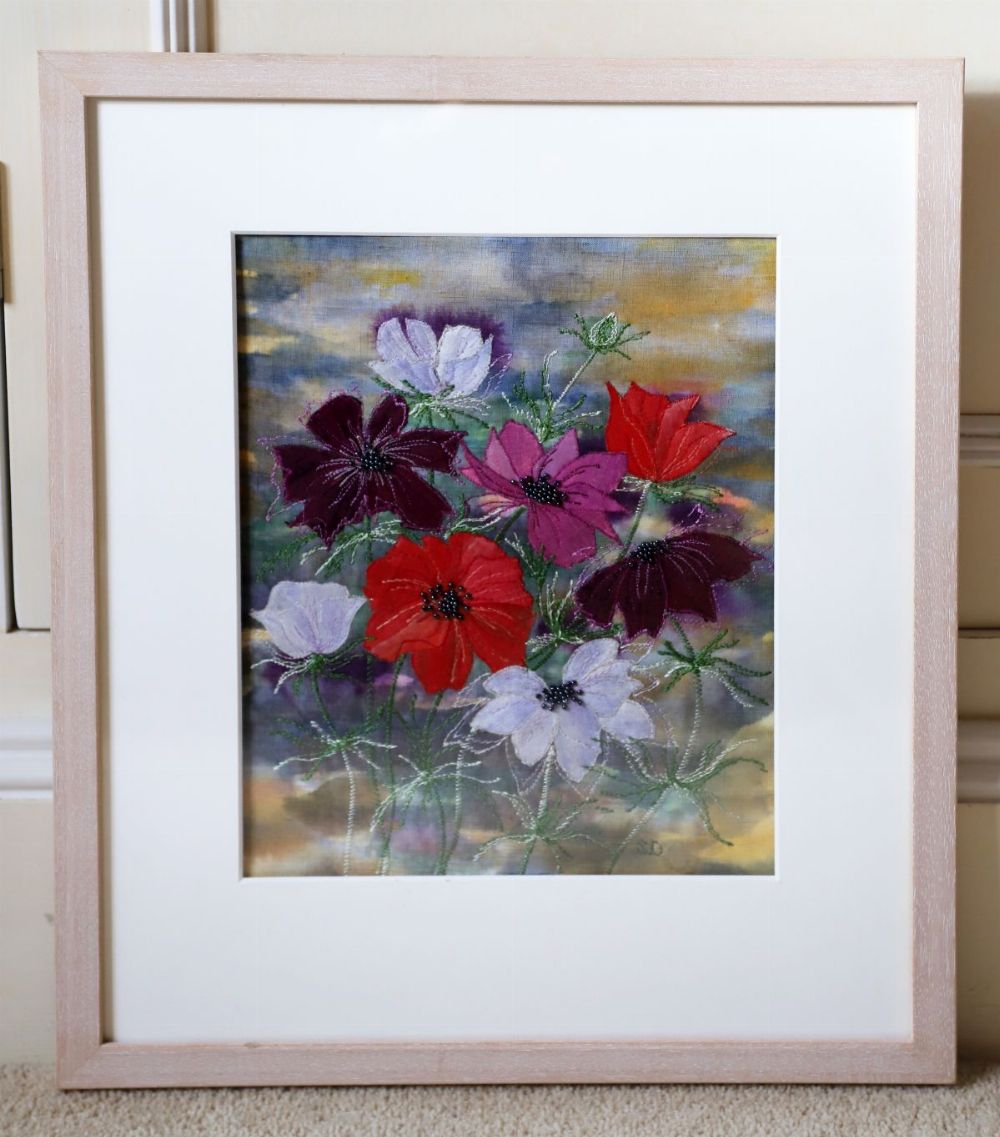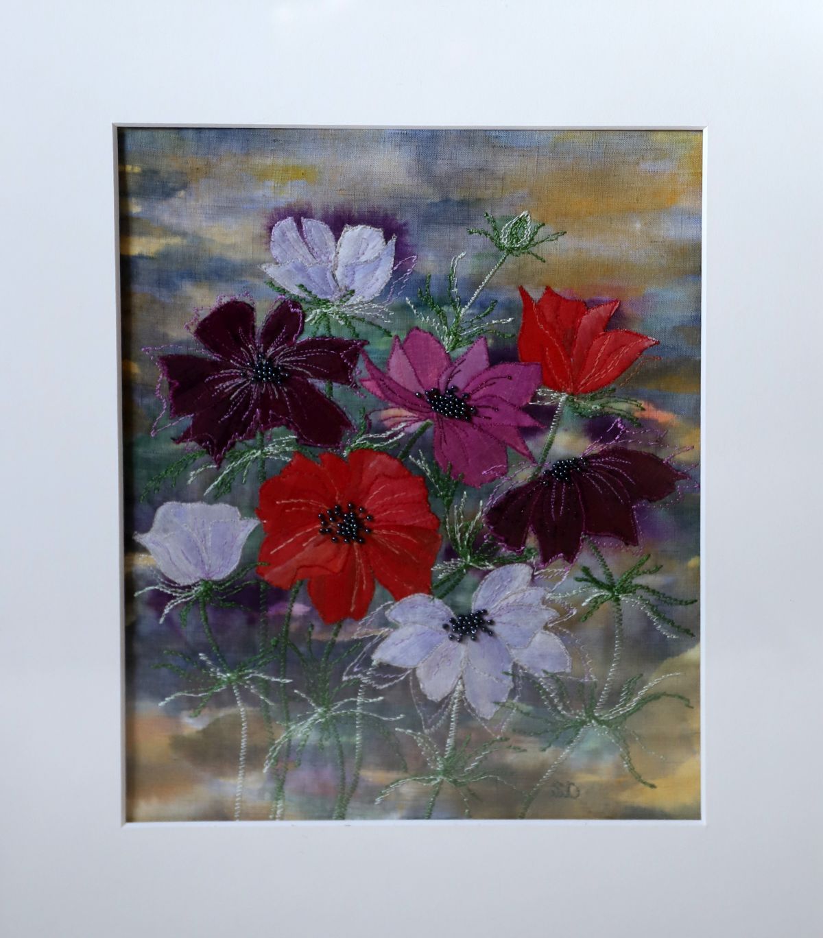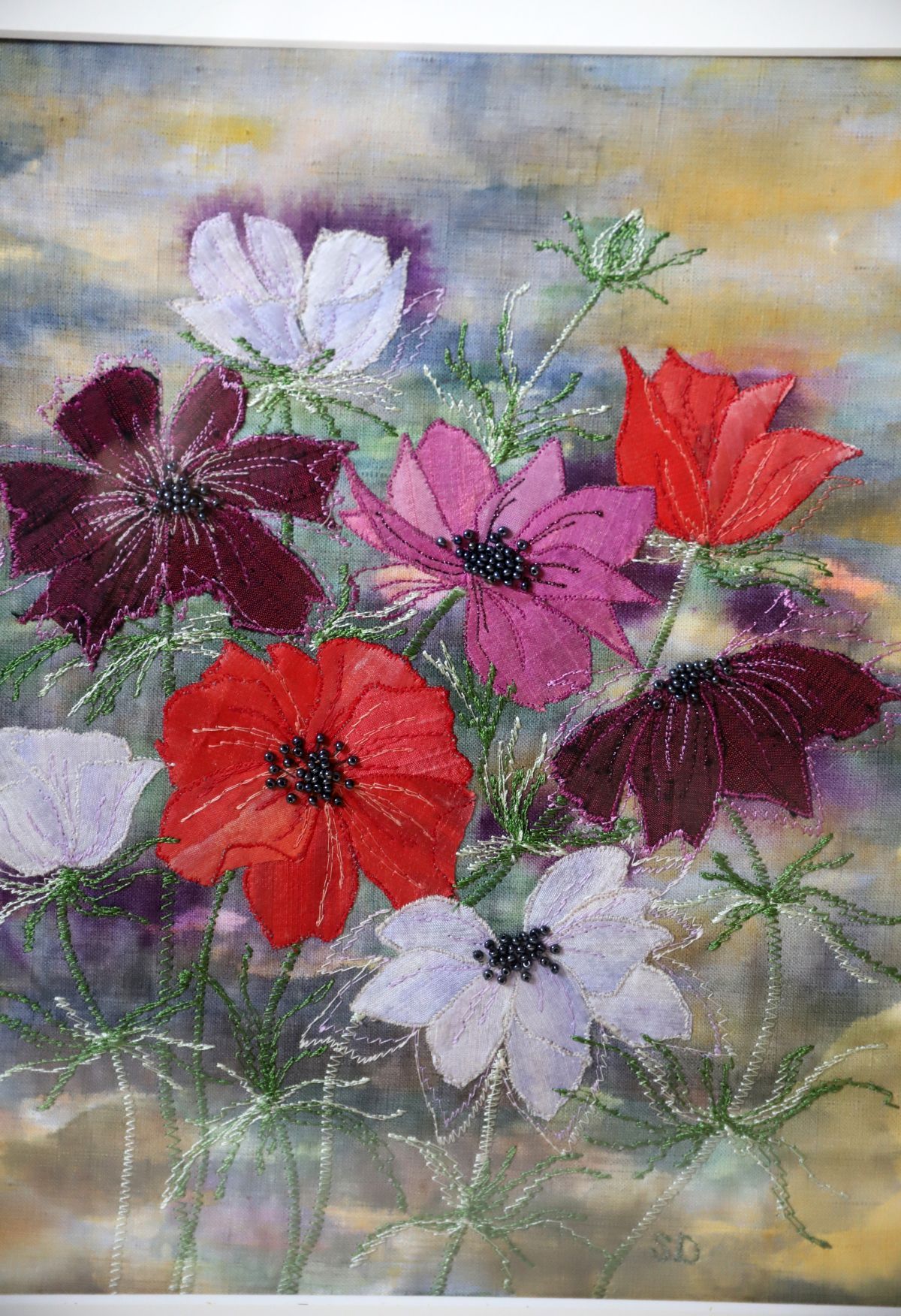 Painted and embroidered silk on linen depicting an arrangement of anemones, worked in coloured threads with beaded detailing. Framed and glazed.