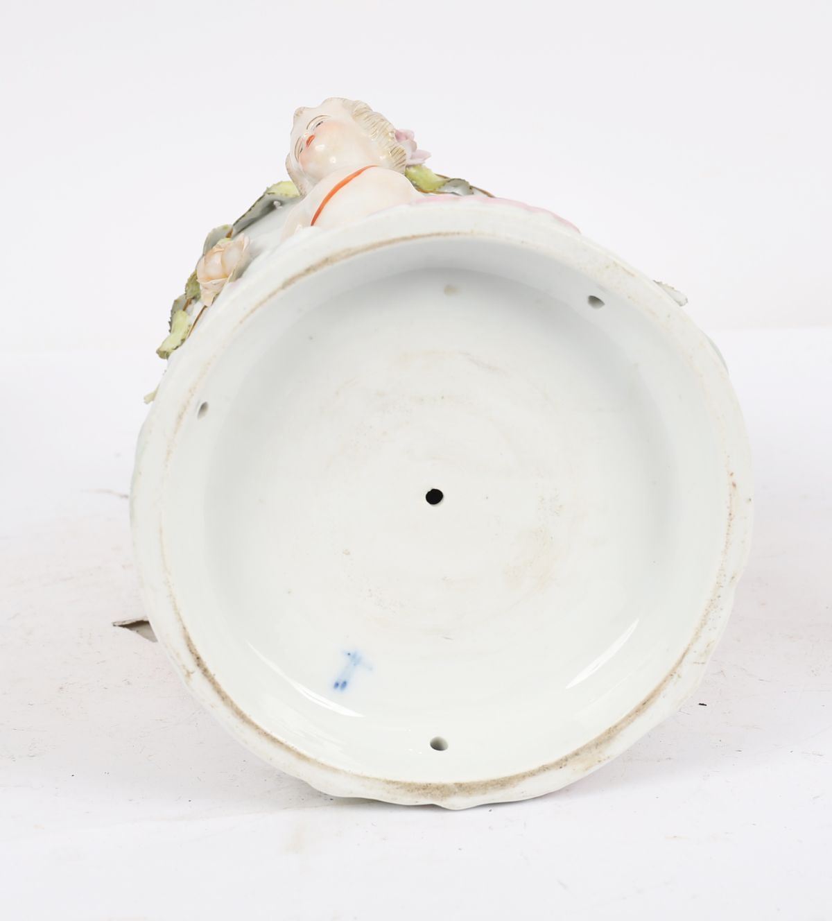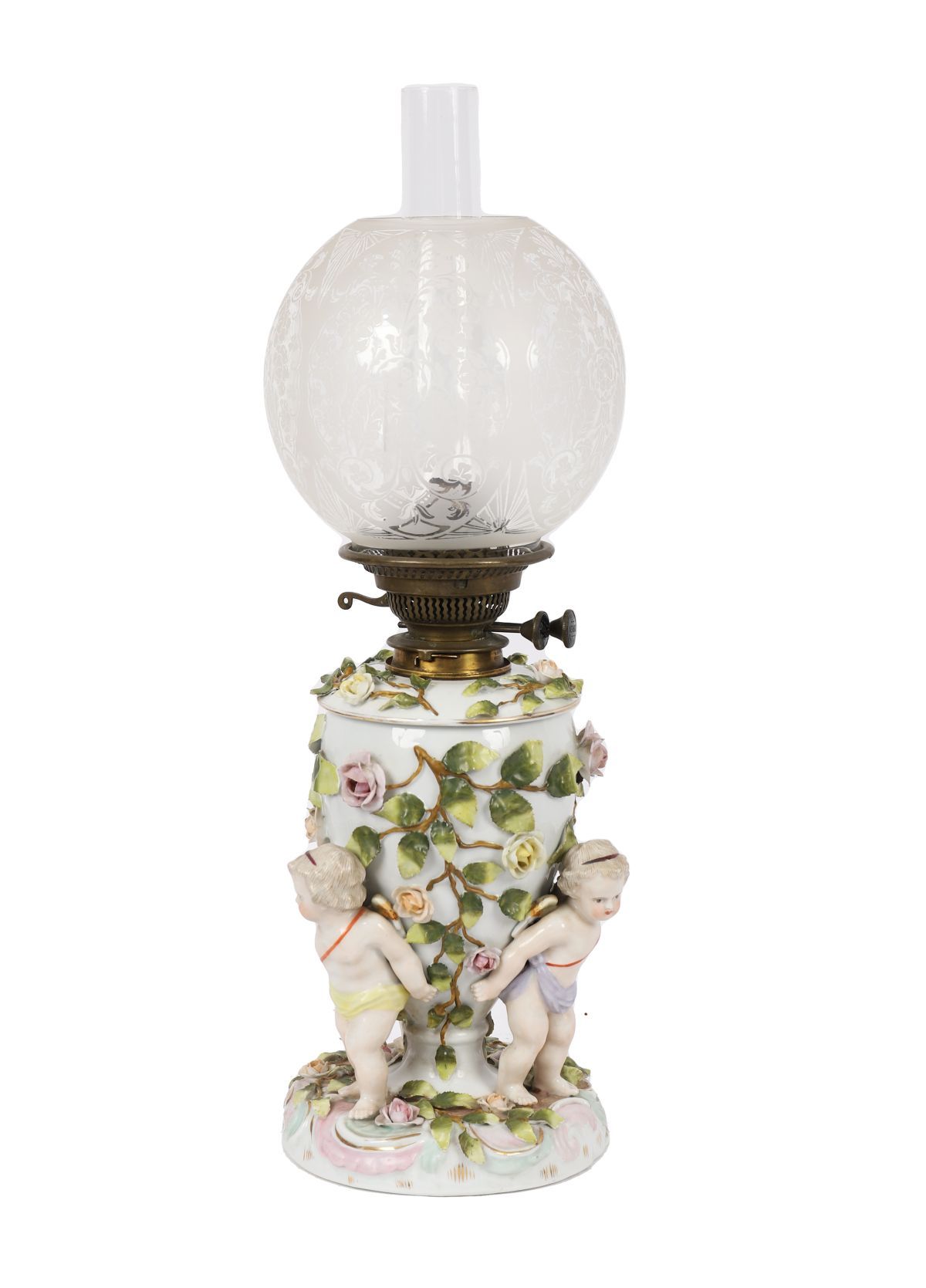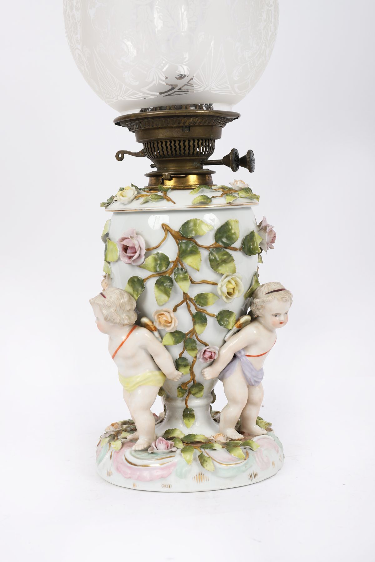 Elaborate Sitzendorf porcelain oil lamp modelled with cherubs among floral garlands, with etched glass globe shade. Late 19th century.