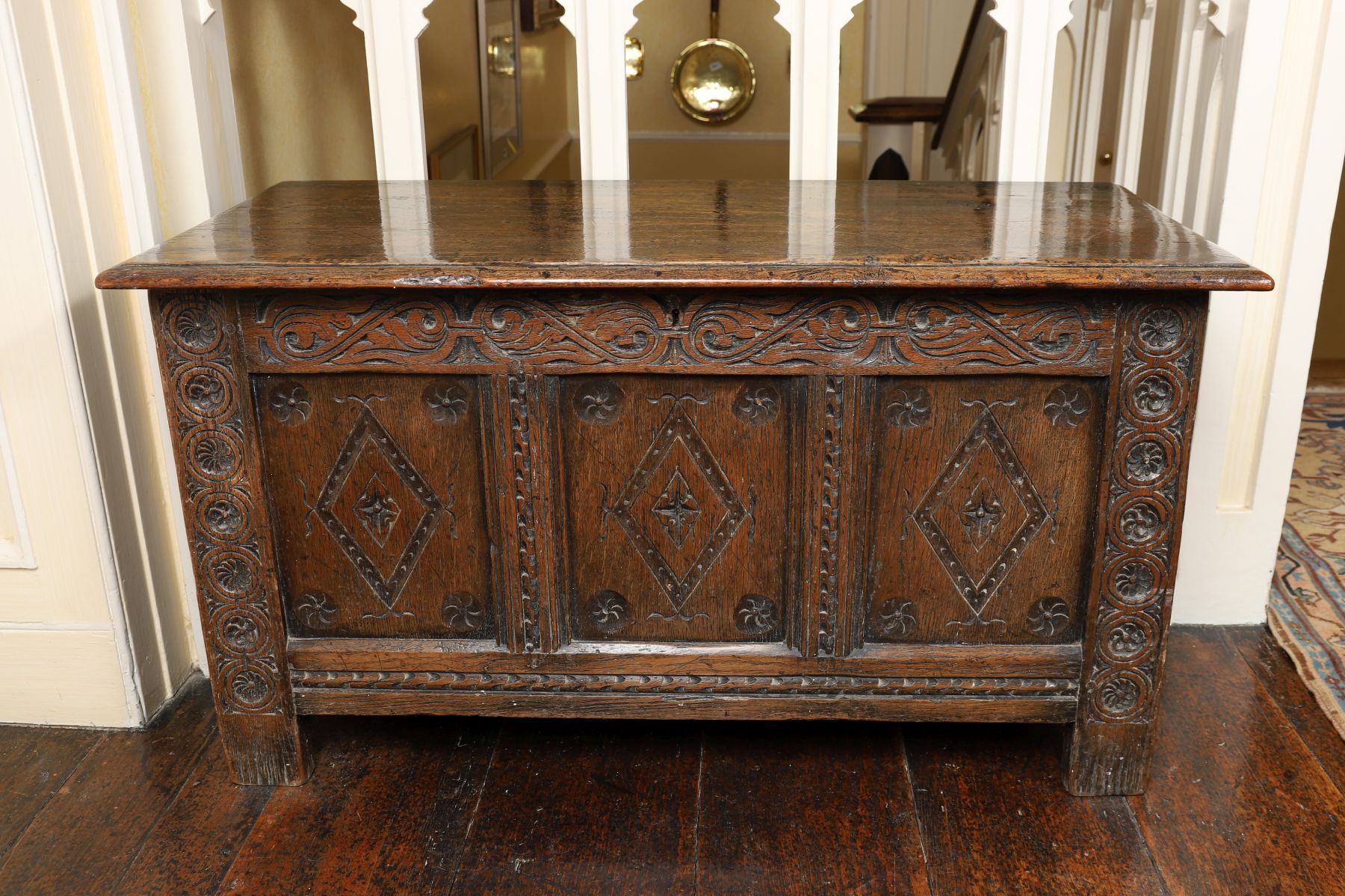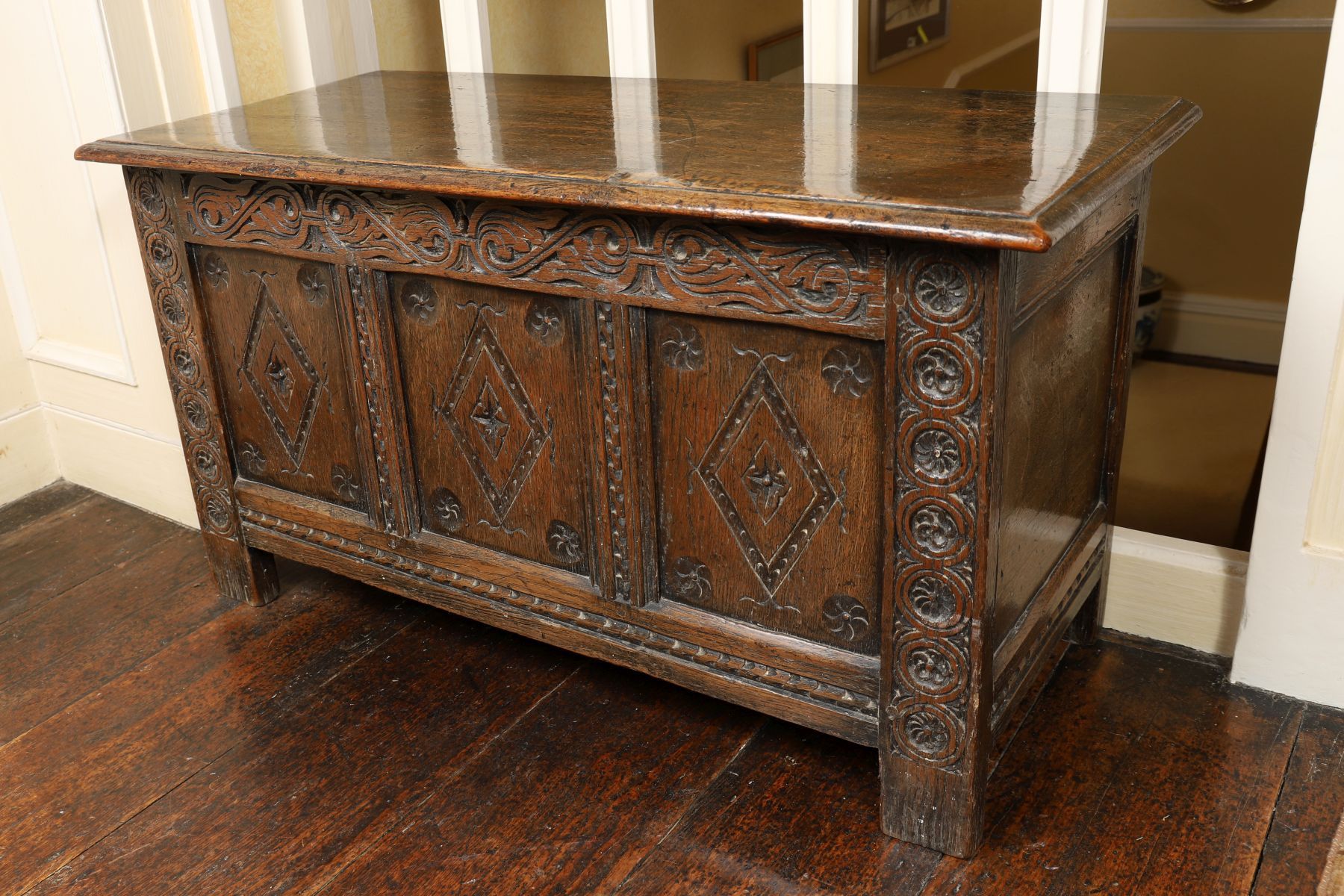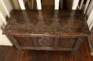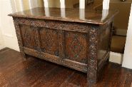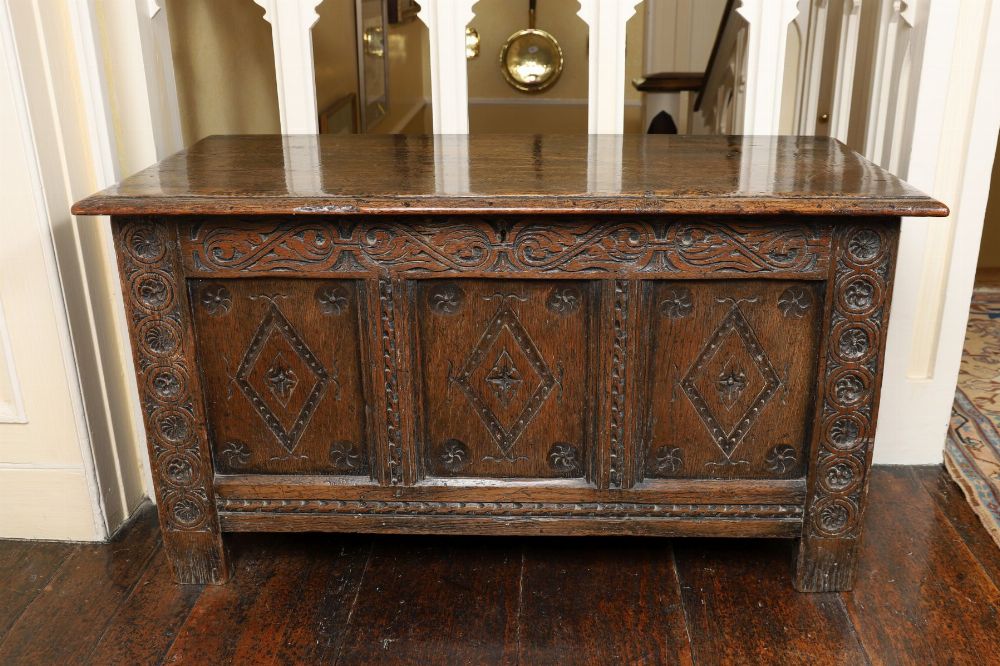 Lot 1243 SMALL 18TH-CENTURY CARVED OAK PANELLED TRUNK