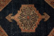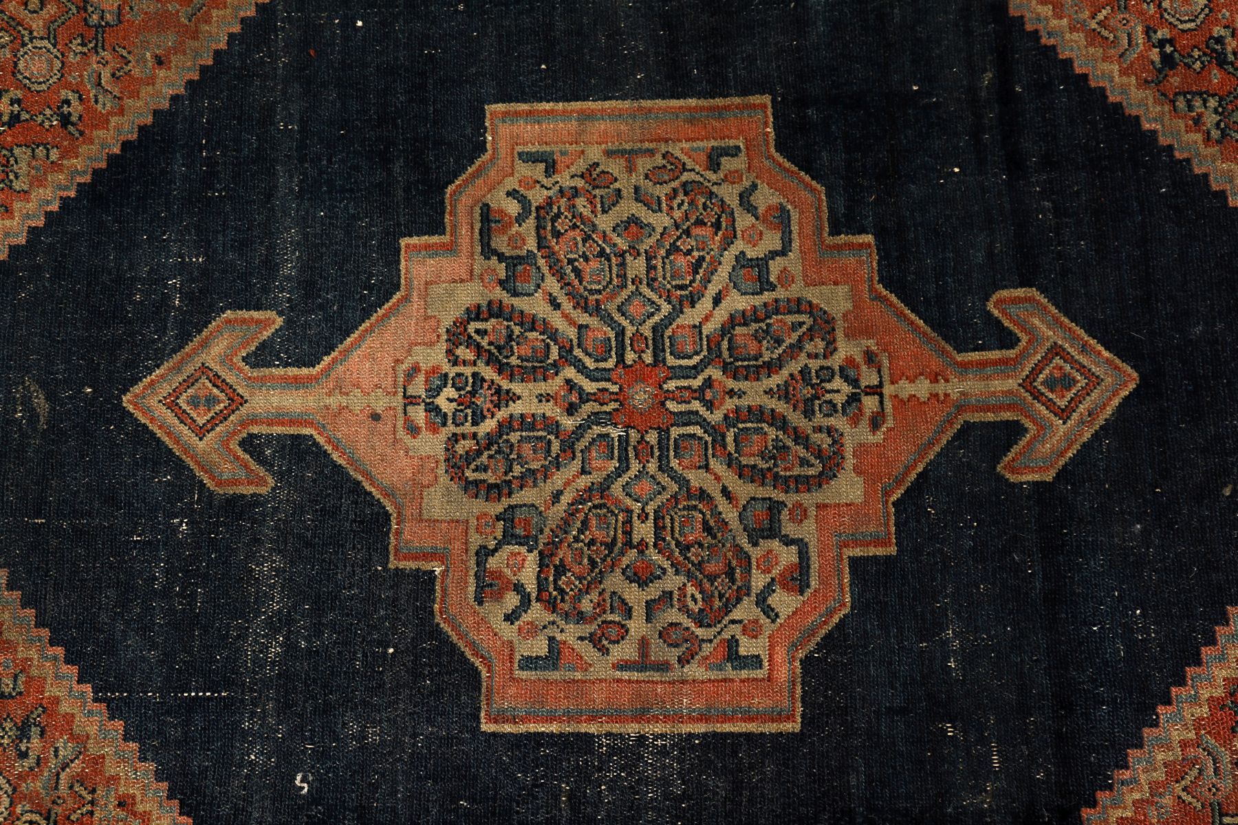 A small-format Persian rug with a central medallion and geometric spandrels, enclosed by a patterned border, in shades of blue, terracotta, and beige.