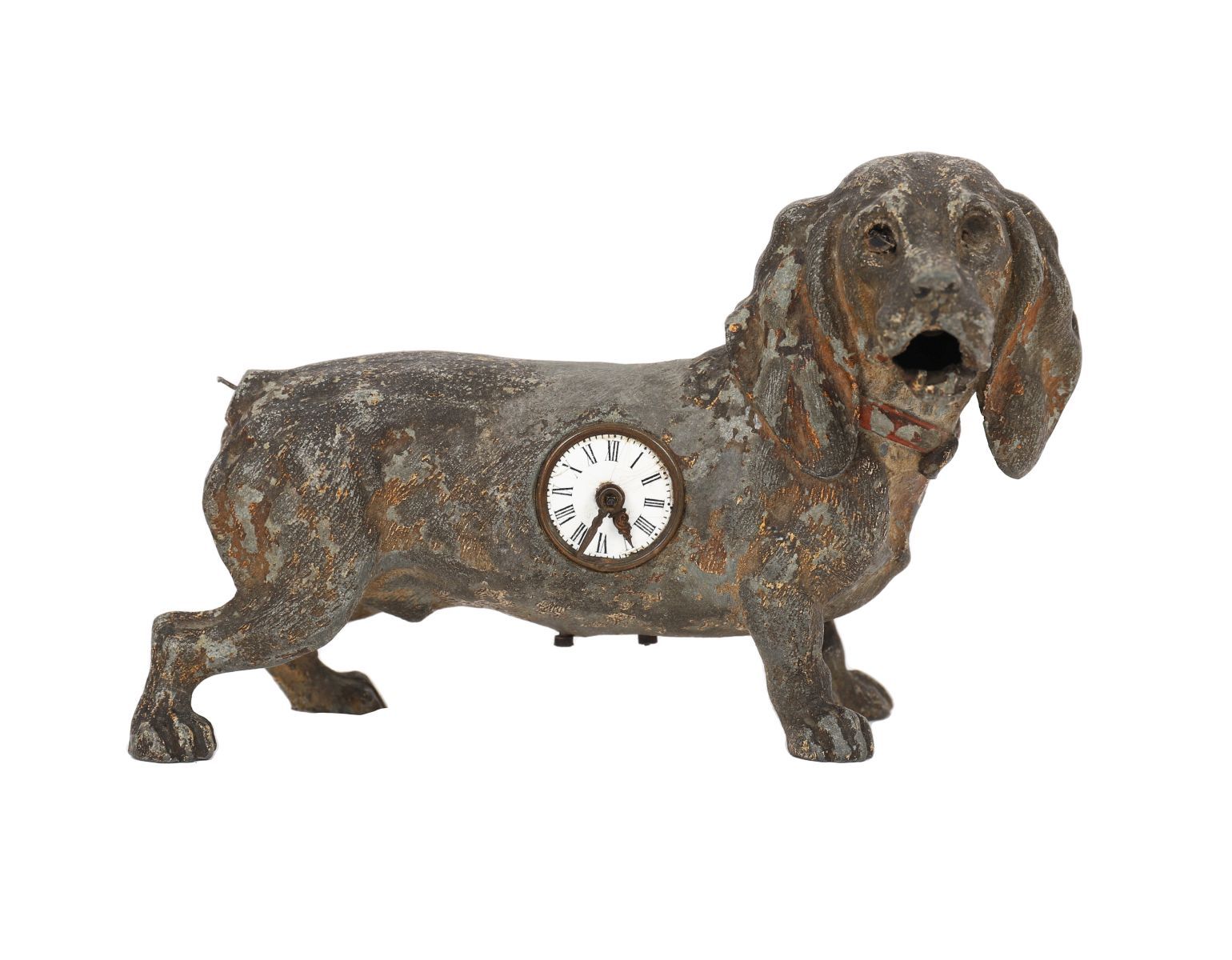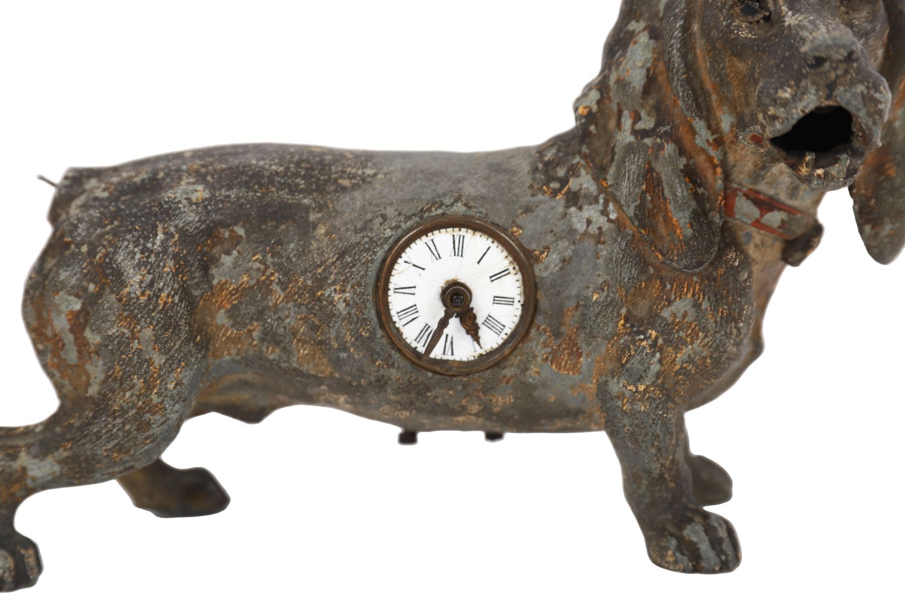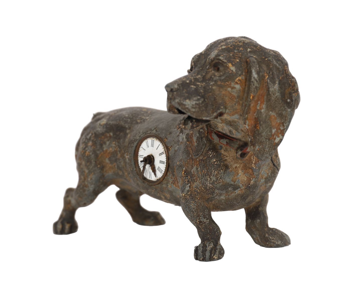 A novelty cast metal clock formed as a standing dog with inset enamel dial to the body. The surface retaining traces of gilt and patination.