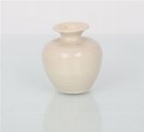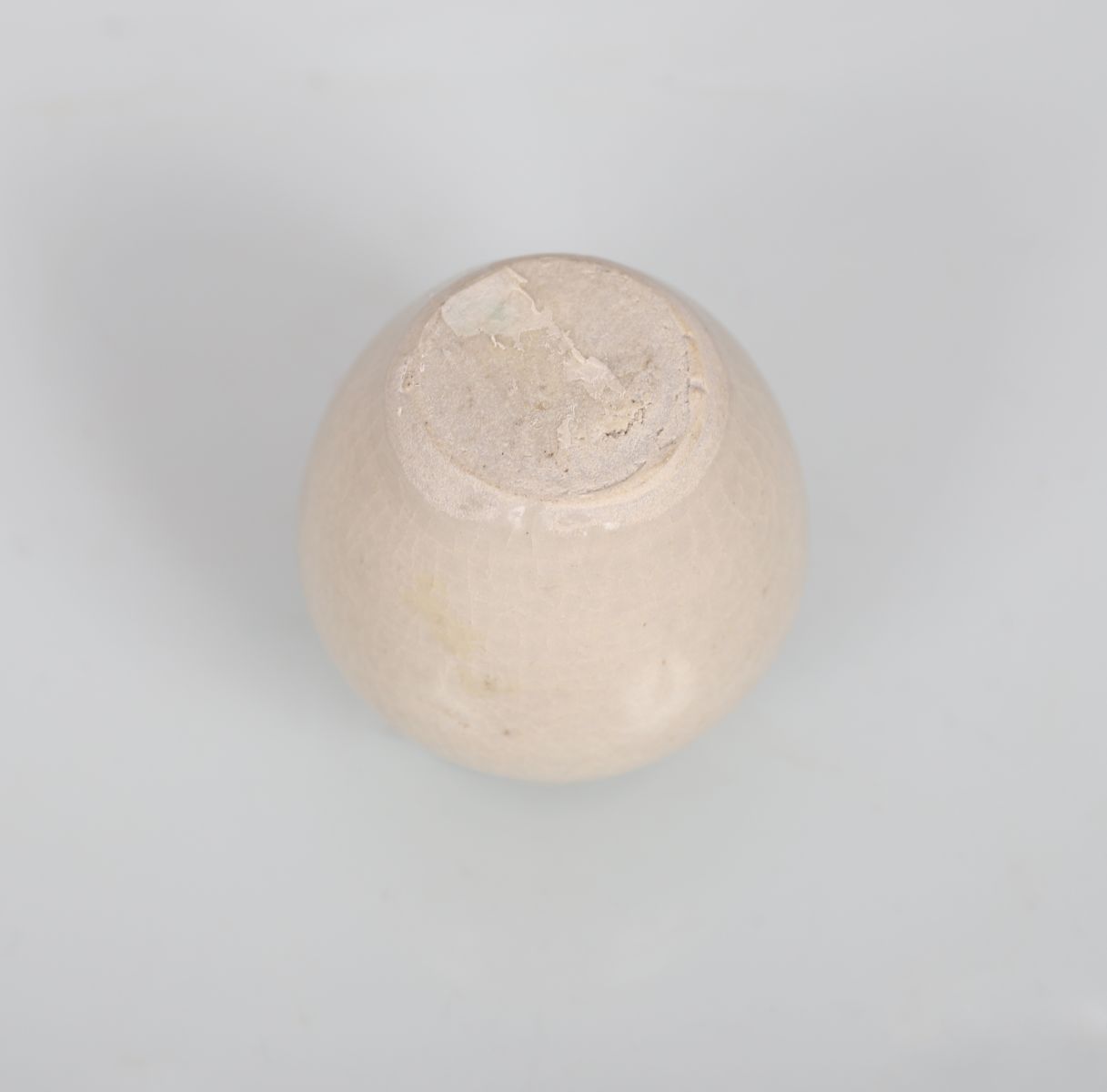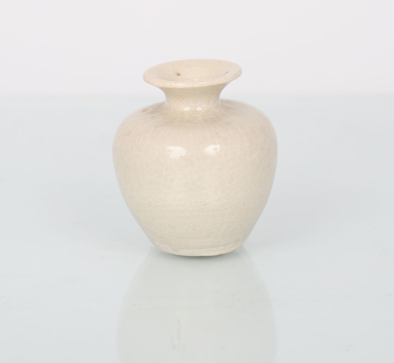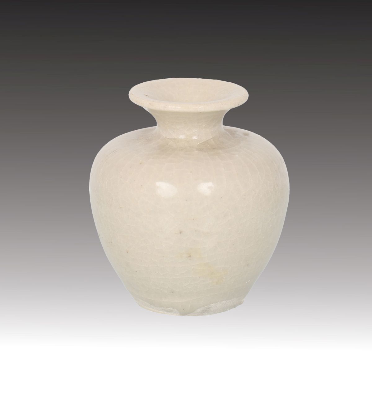 A diminutive Chinese porcelain vase of globular form with short waisted neck and flared rim, covered in a pale greyish crackle glaze with fine network of crazing throughout. The foot unglazed, showing characteristic firing remnants and spur marks.
