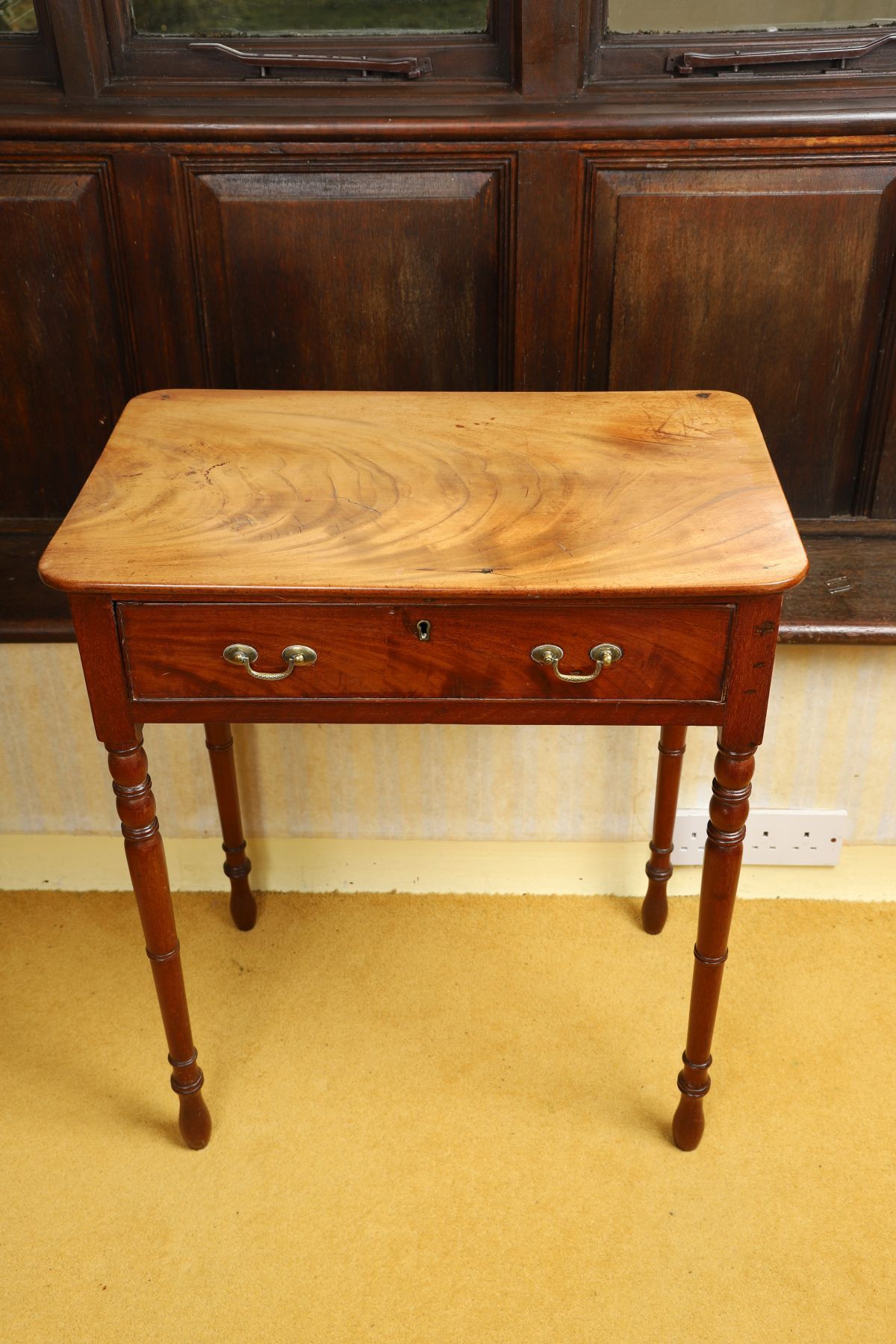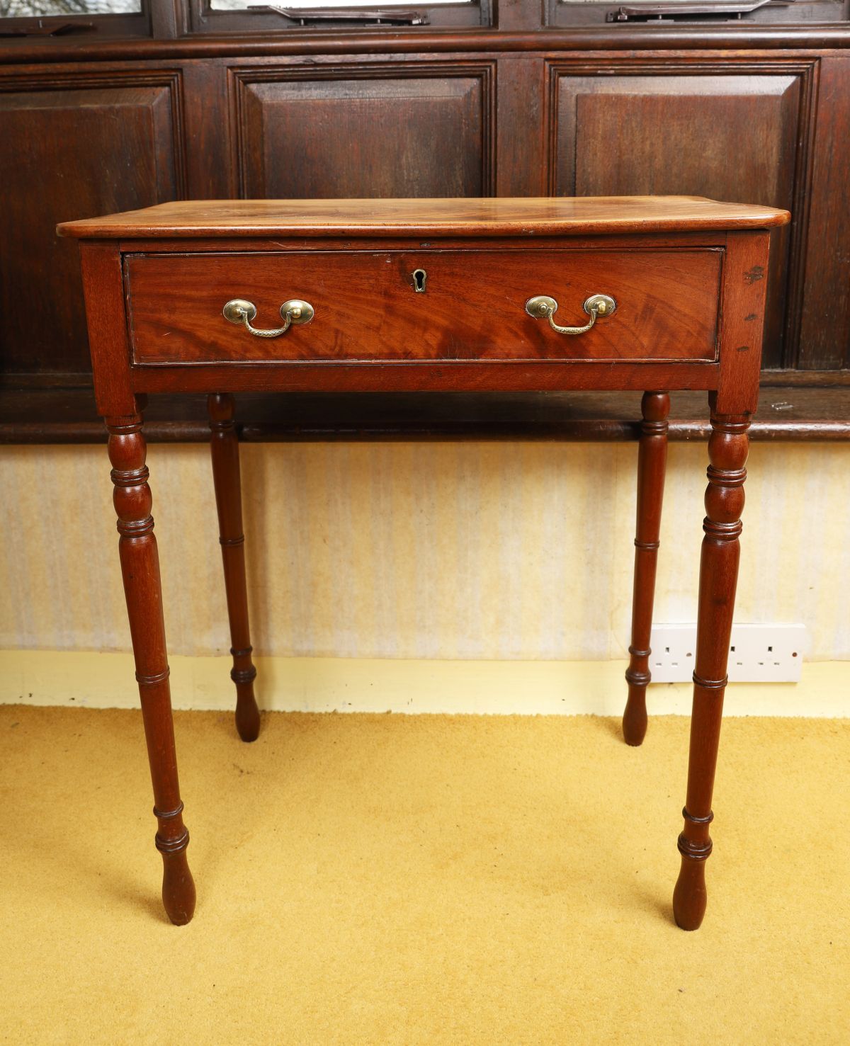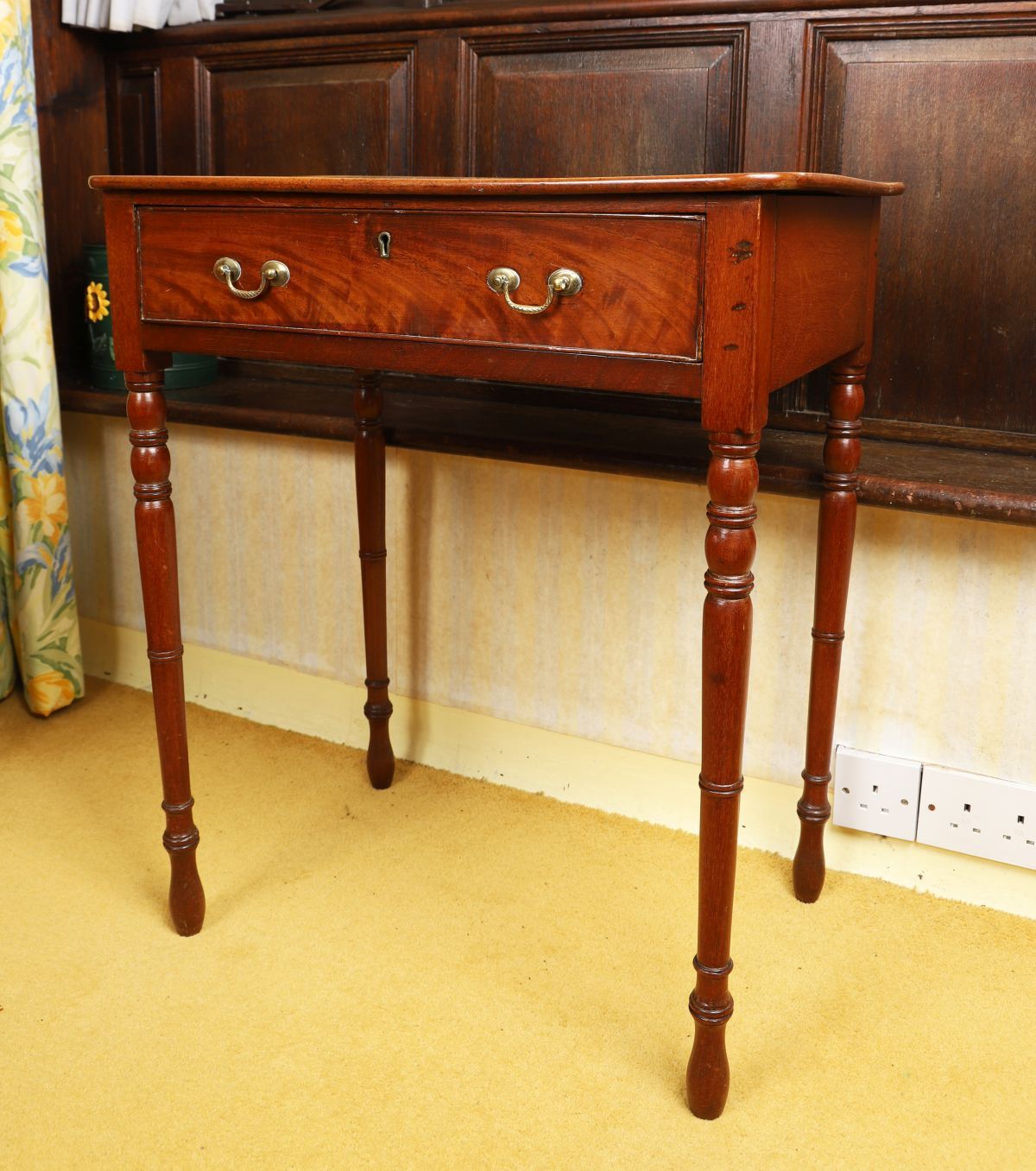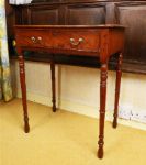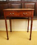 A small Regency mahogany writing table, fitted with a single drawer and raised on turned legs terminating in castors.