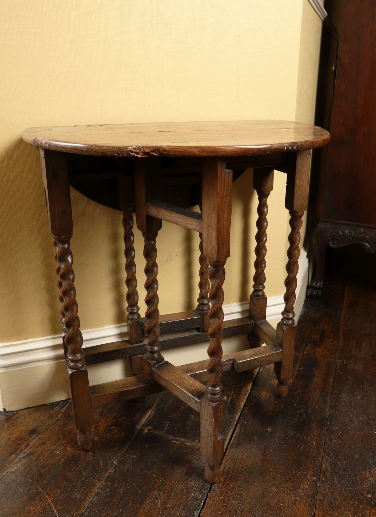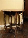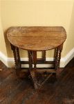 A small 19th-century oak gate-leg table with oval top, turned supports, and hinged drop leaves.