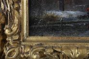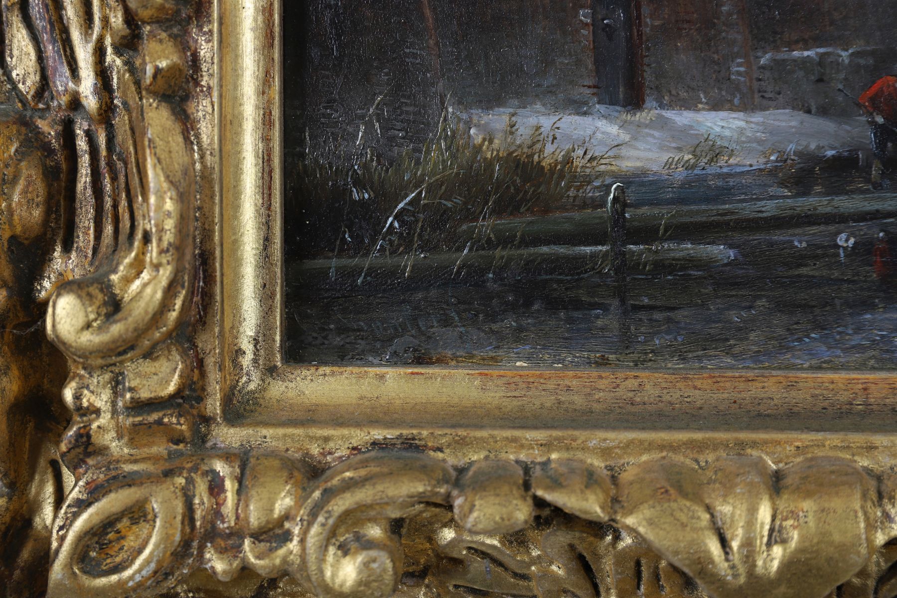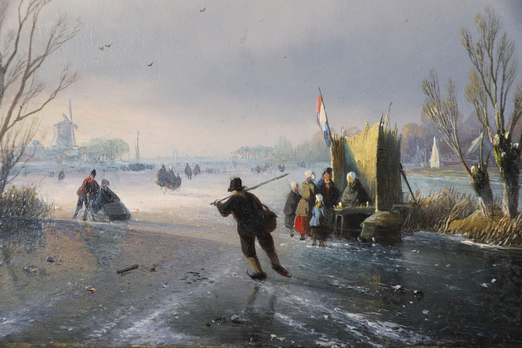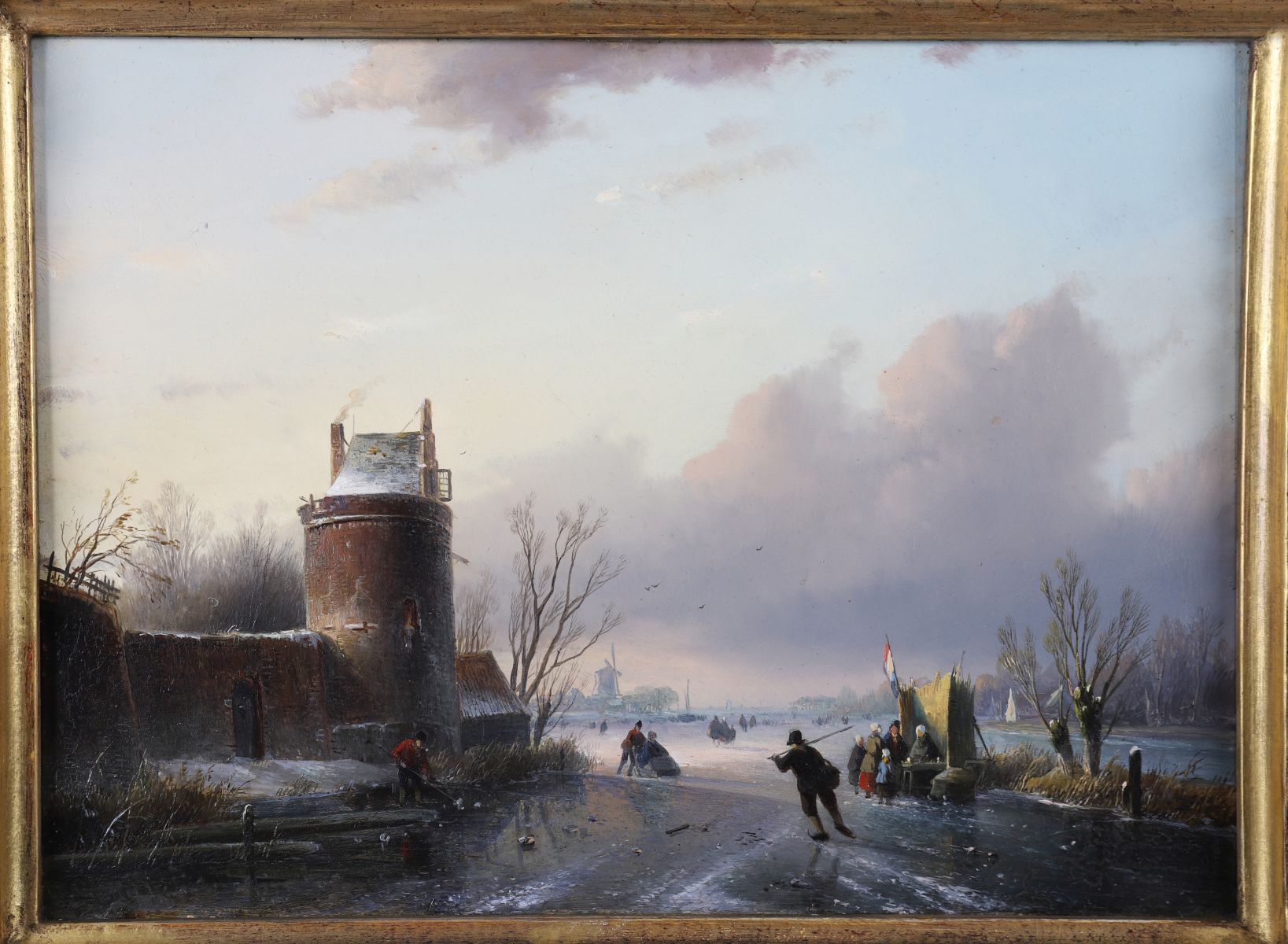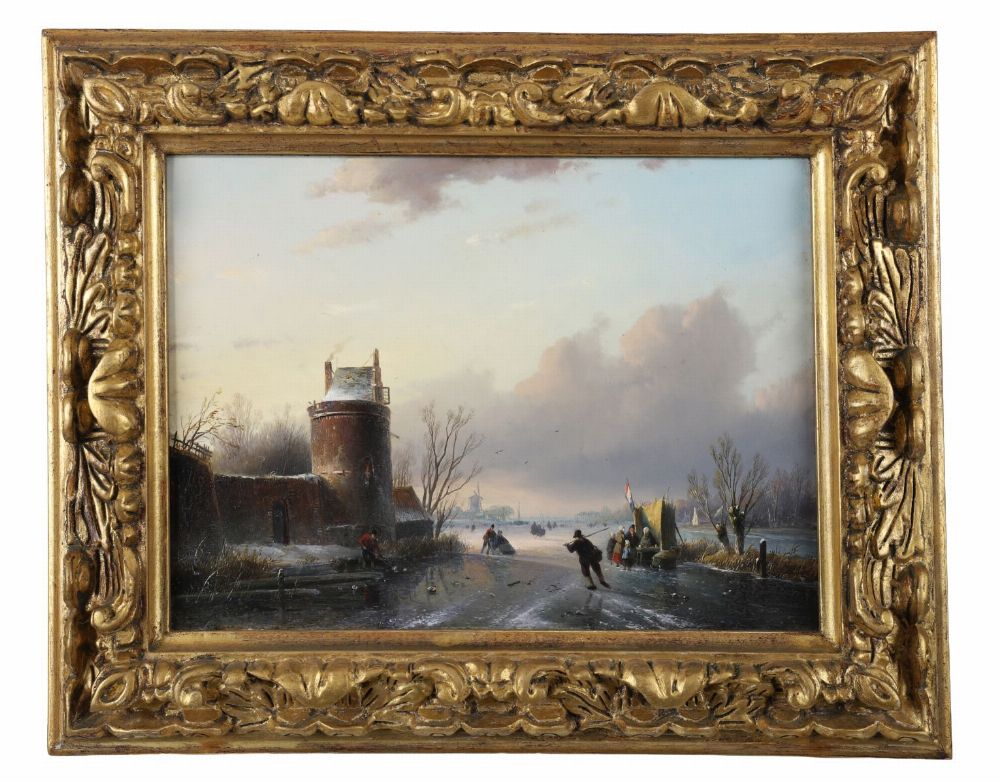 A lively winter scene depicting villagers skating and socialising near a riverside inn and tower at sunset. Oil on panel, signed lower left. Enclosed in a gilt frame.
