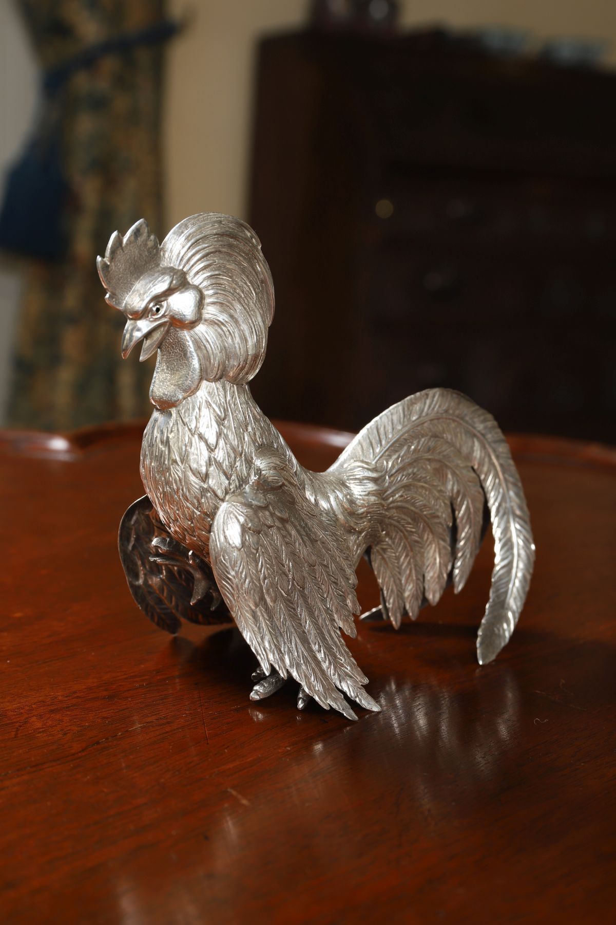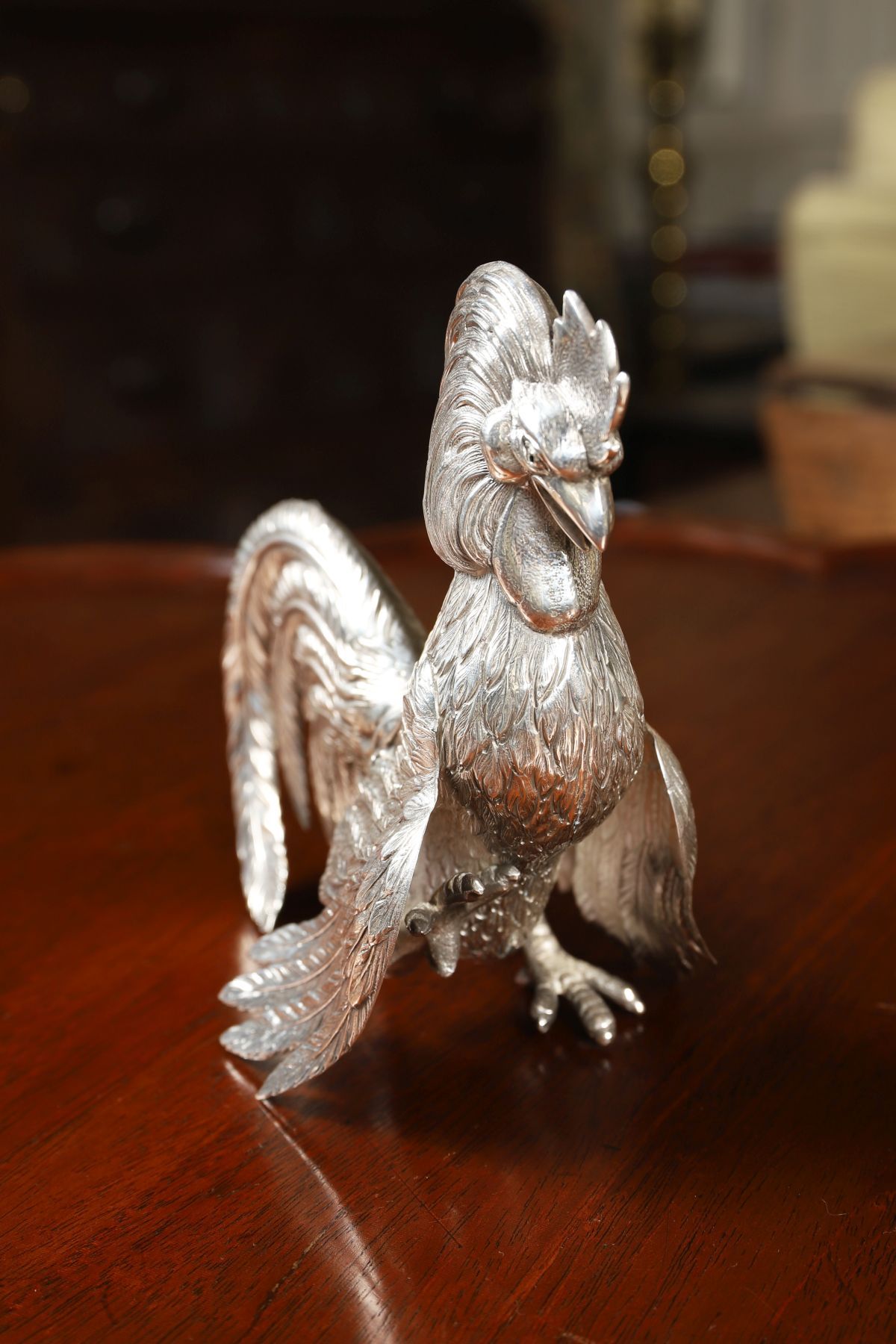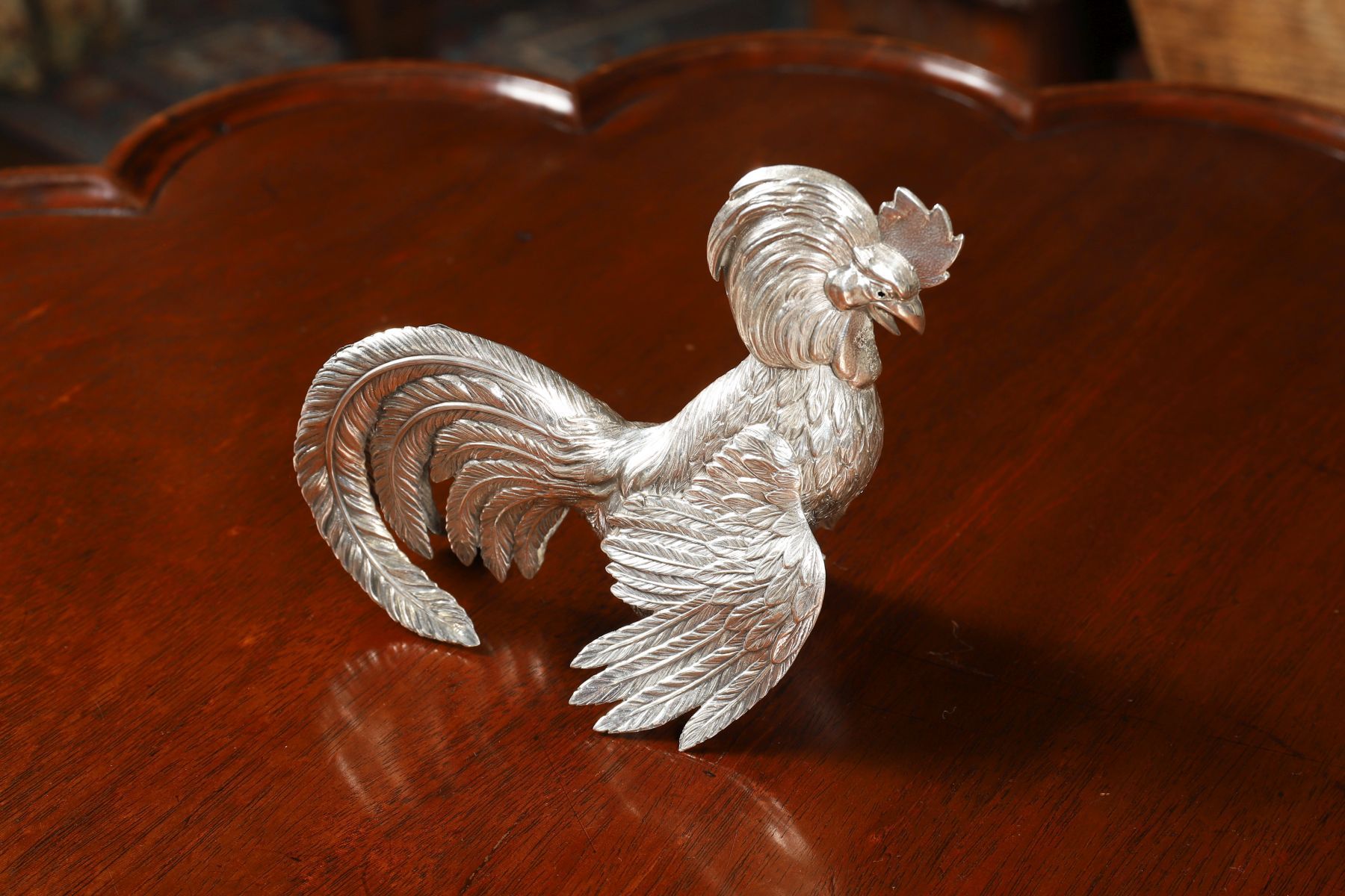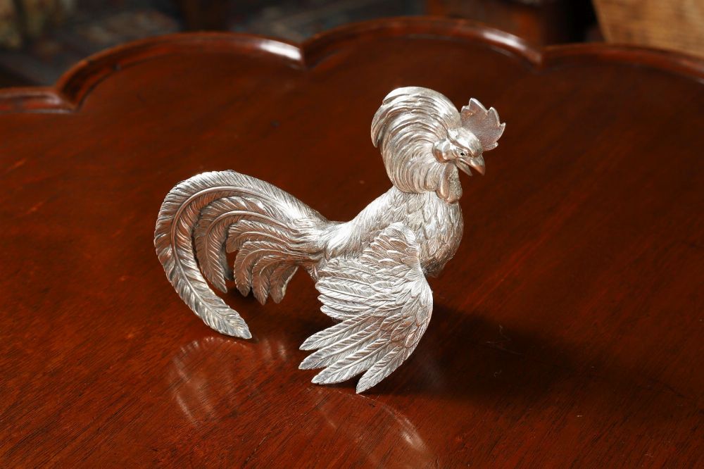 Model of a cockerel cast and chased in sterling silver, realistically detailed plumage and tail feathers. 175 grams.