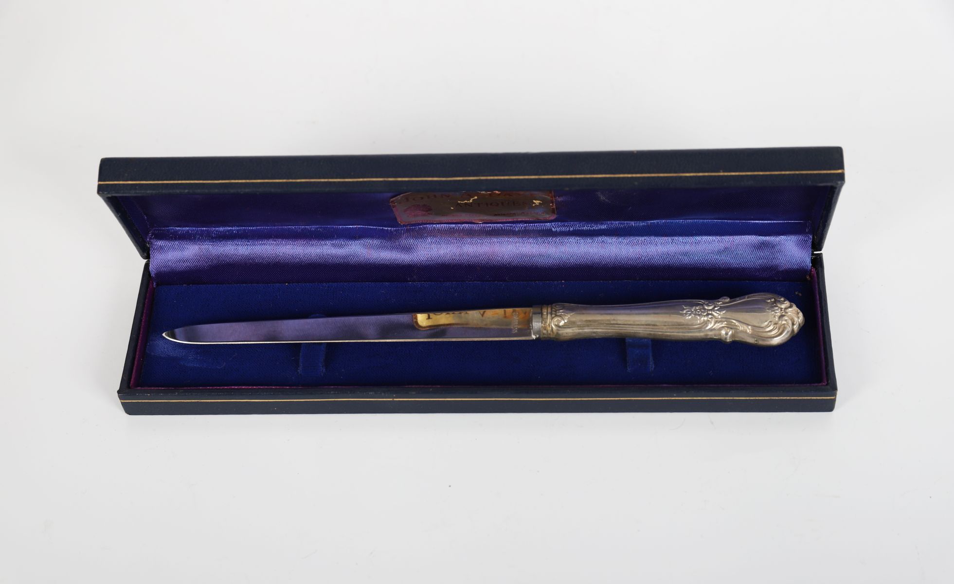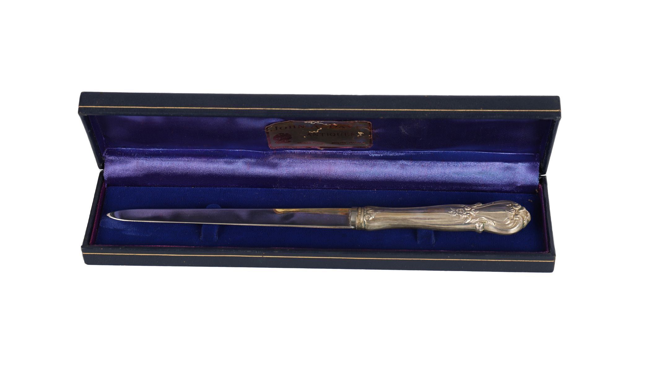 A cased sterling silver-handled letter opener with shaped handle decorated with foliate scrolls, the blade of polished steel, in original fitted case.