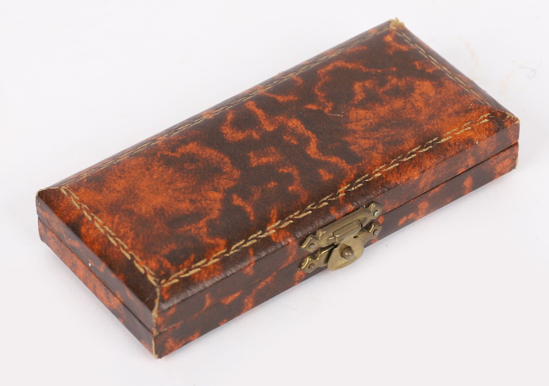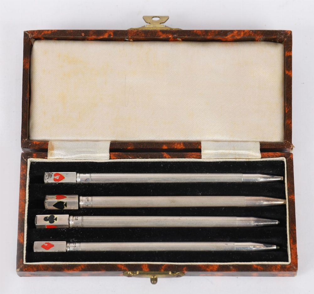 A cased set of four sterling silver propelling pencils, each with engine-turned barrels and enamelled playing card suit finials.