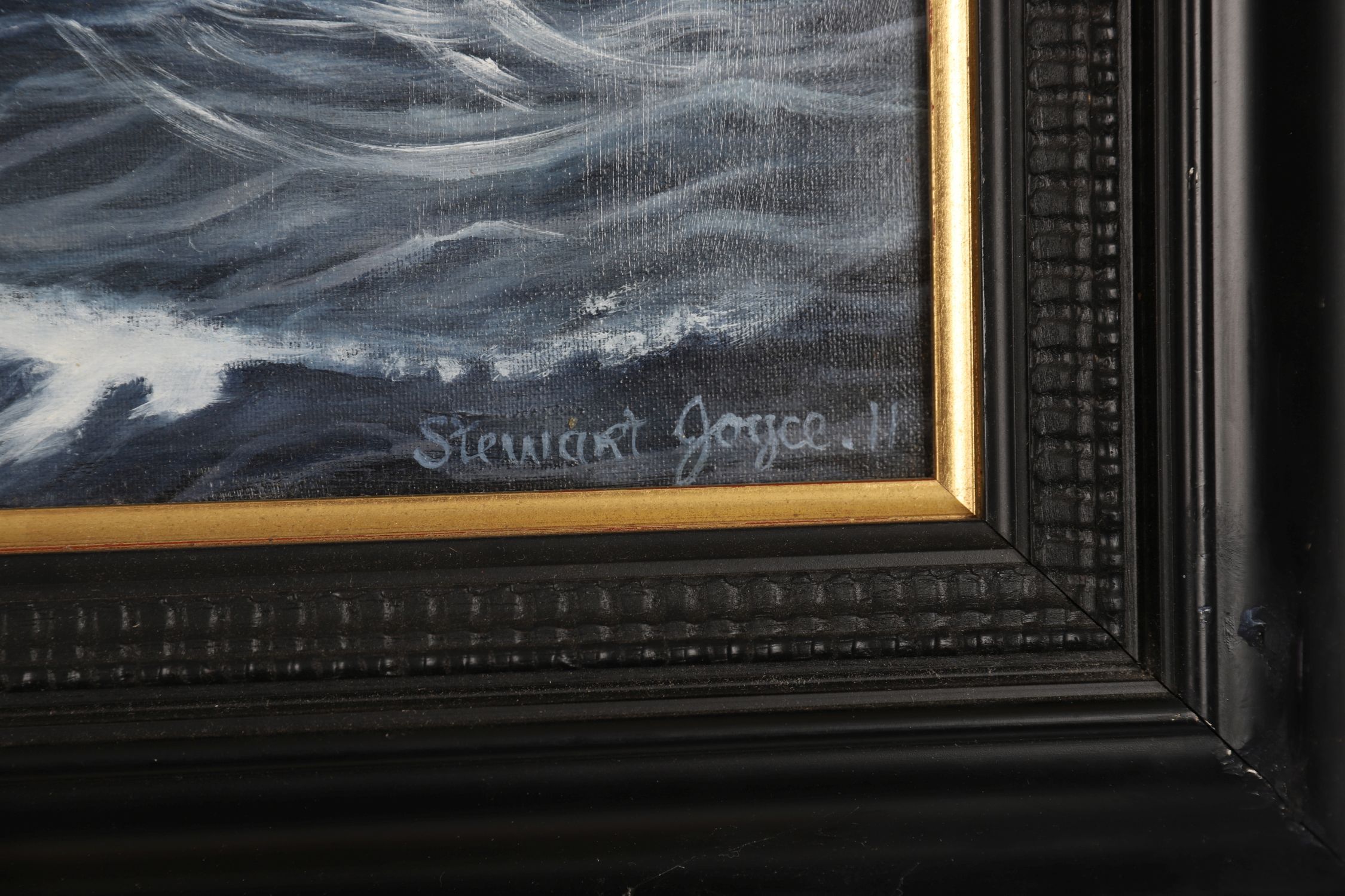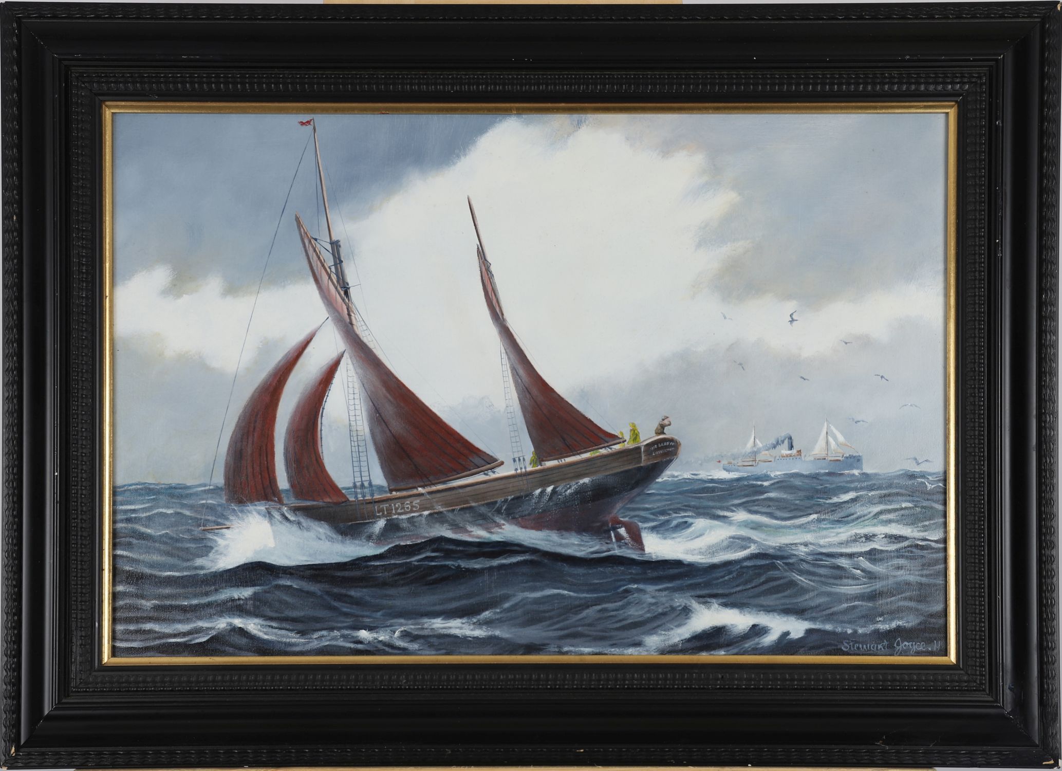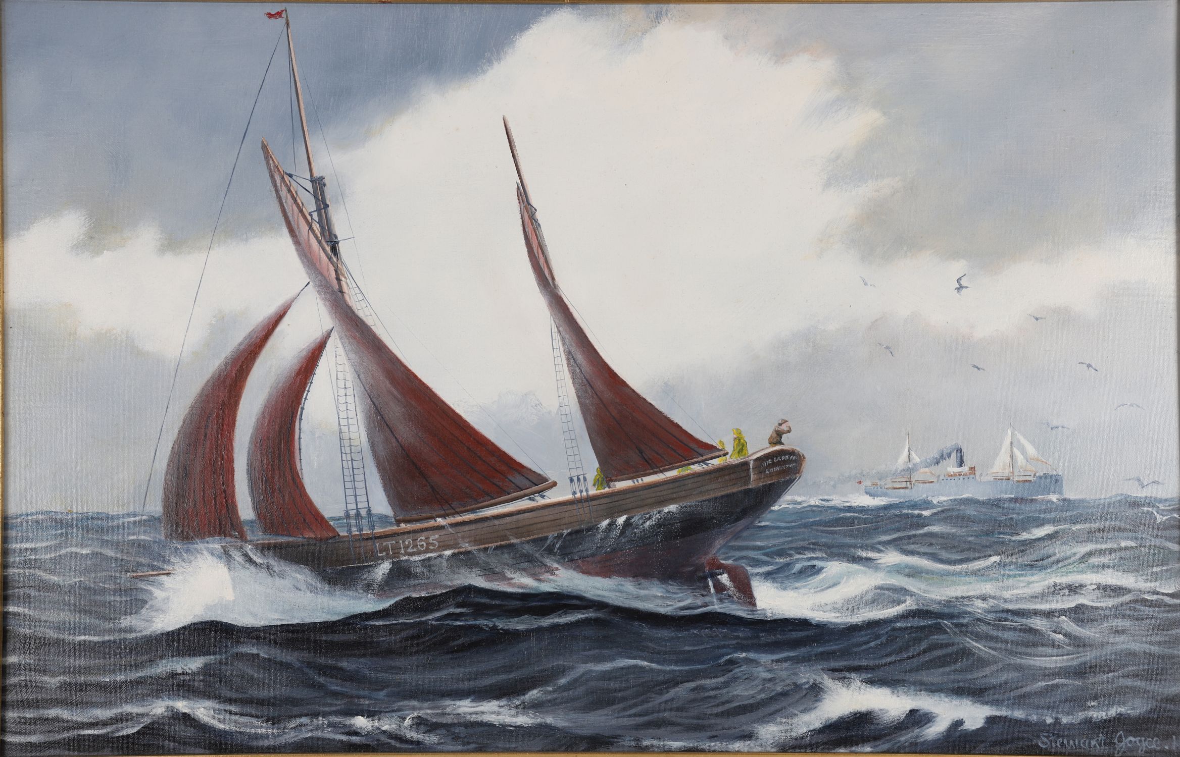 Stewart Joyce — a striking marine oil on canvas depicting the Lowestoft fishing trawler Our Laddie, LT265, under full sail in open seas with richly painted red sails and dramatic wave action. The vessel is shown heeling into the wind, with a crewman on deck and additional trawlers visible in the background. Signed lower right Stewart Joyce. Framed in a moulded black and gilt frame.