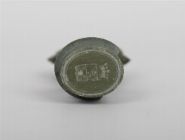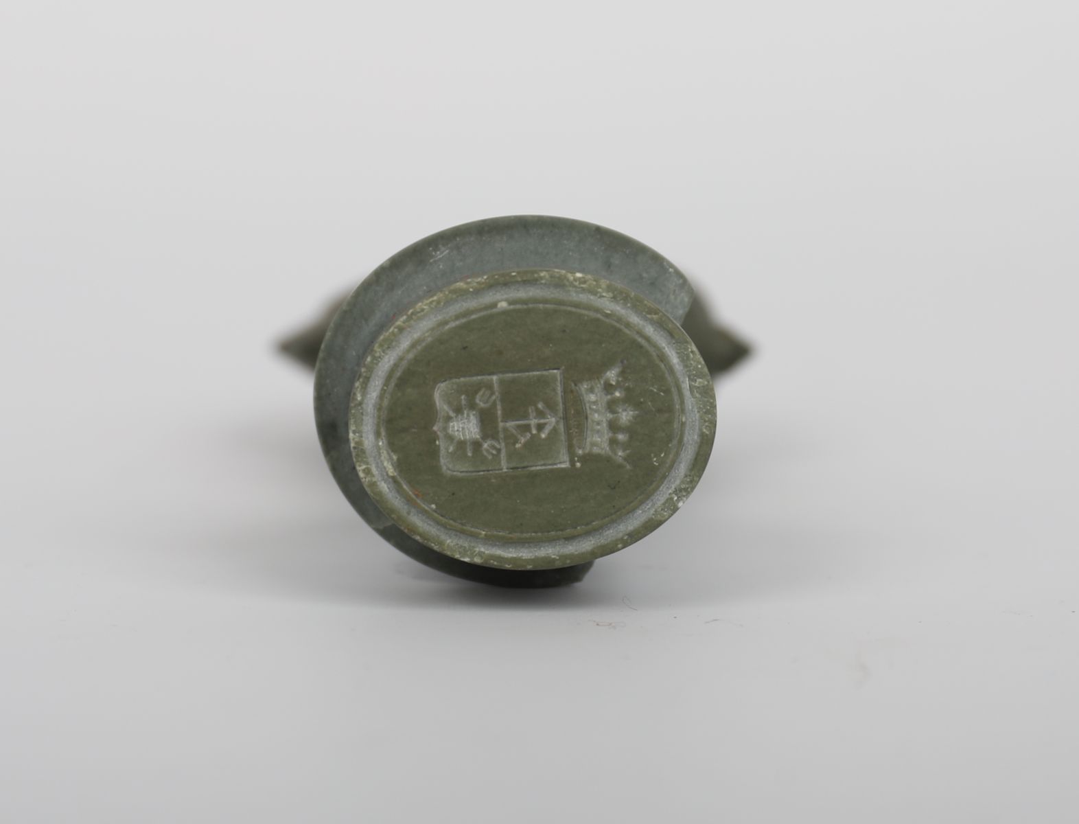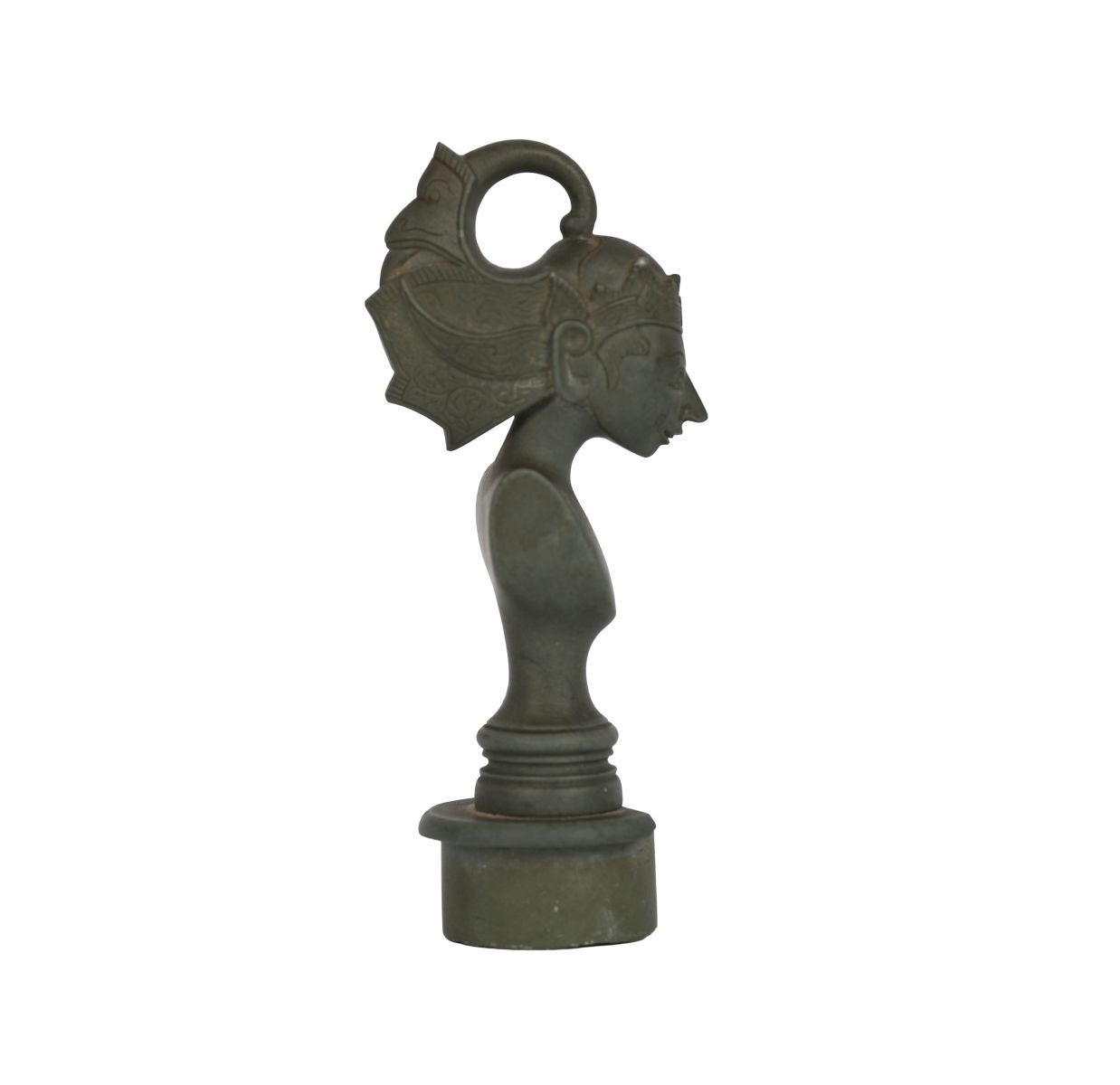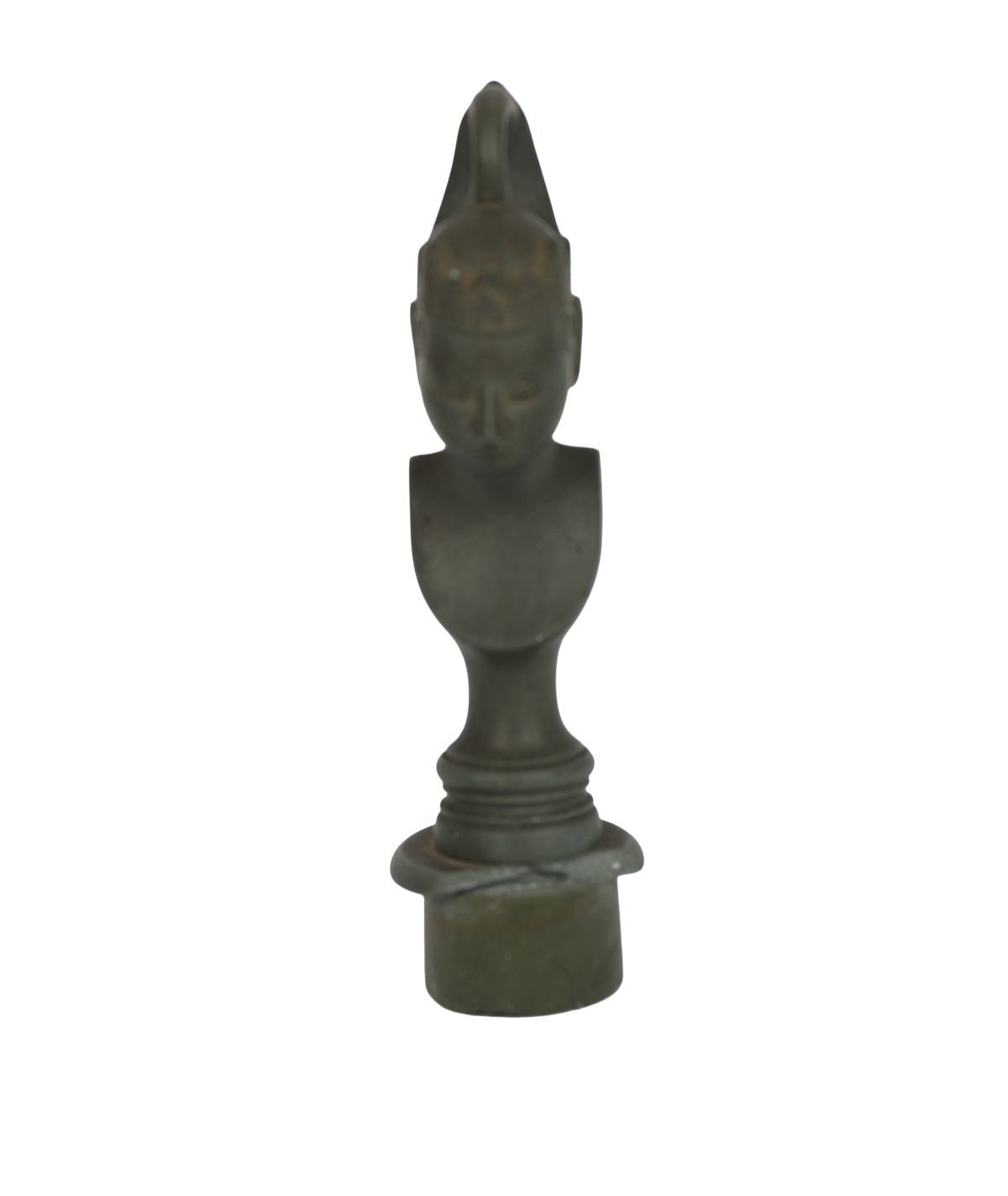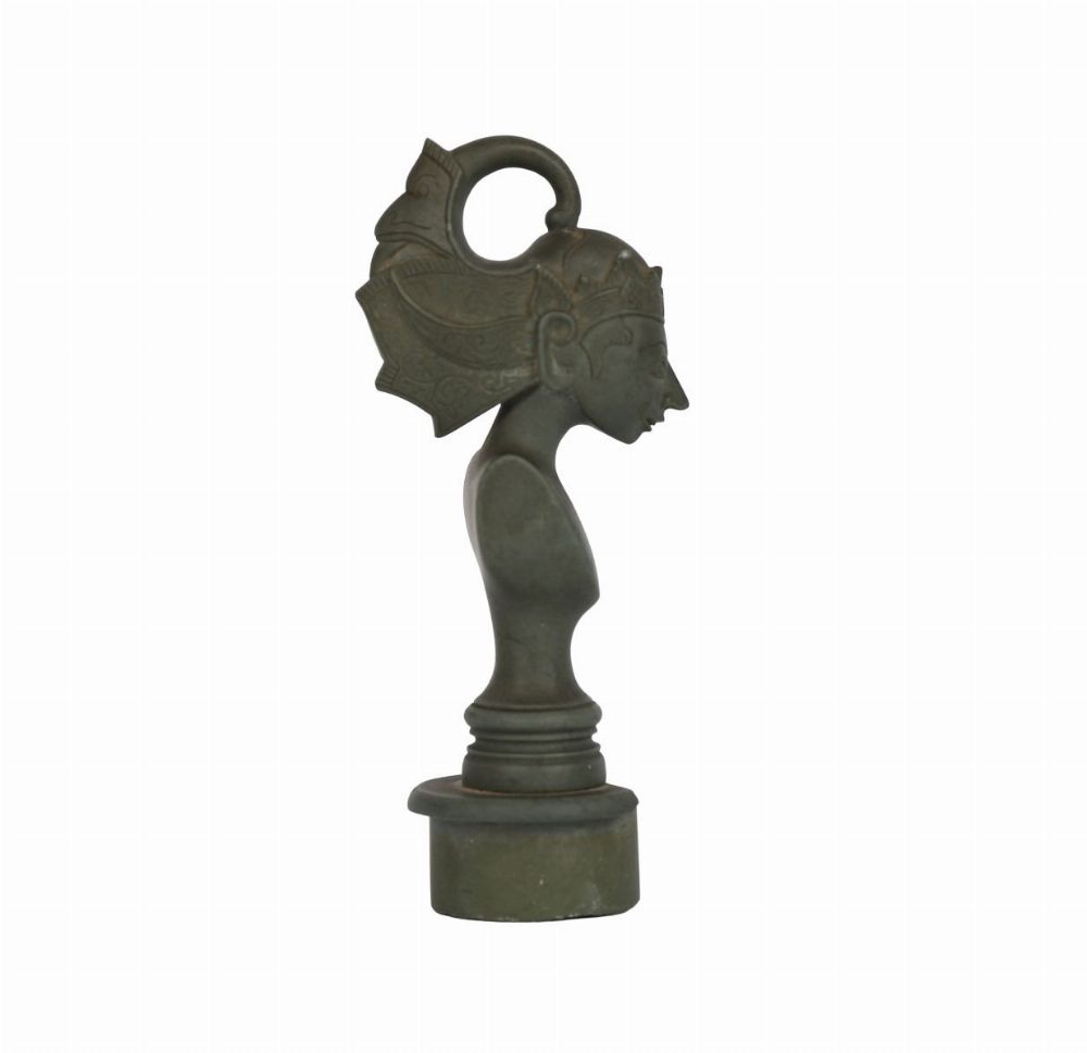 An old carved stone seal, possibly Asian, featuring a finely modelled bust with headdress and loop finial, with a crowned emblem to the seal base.