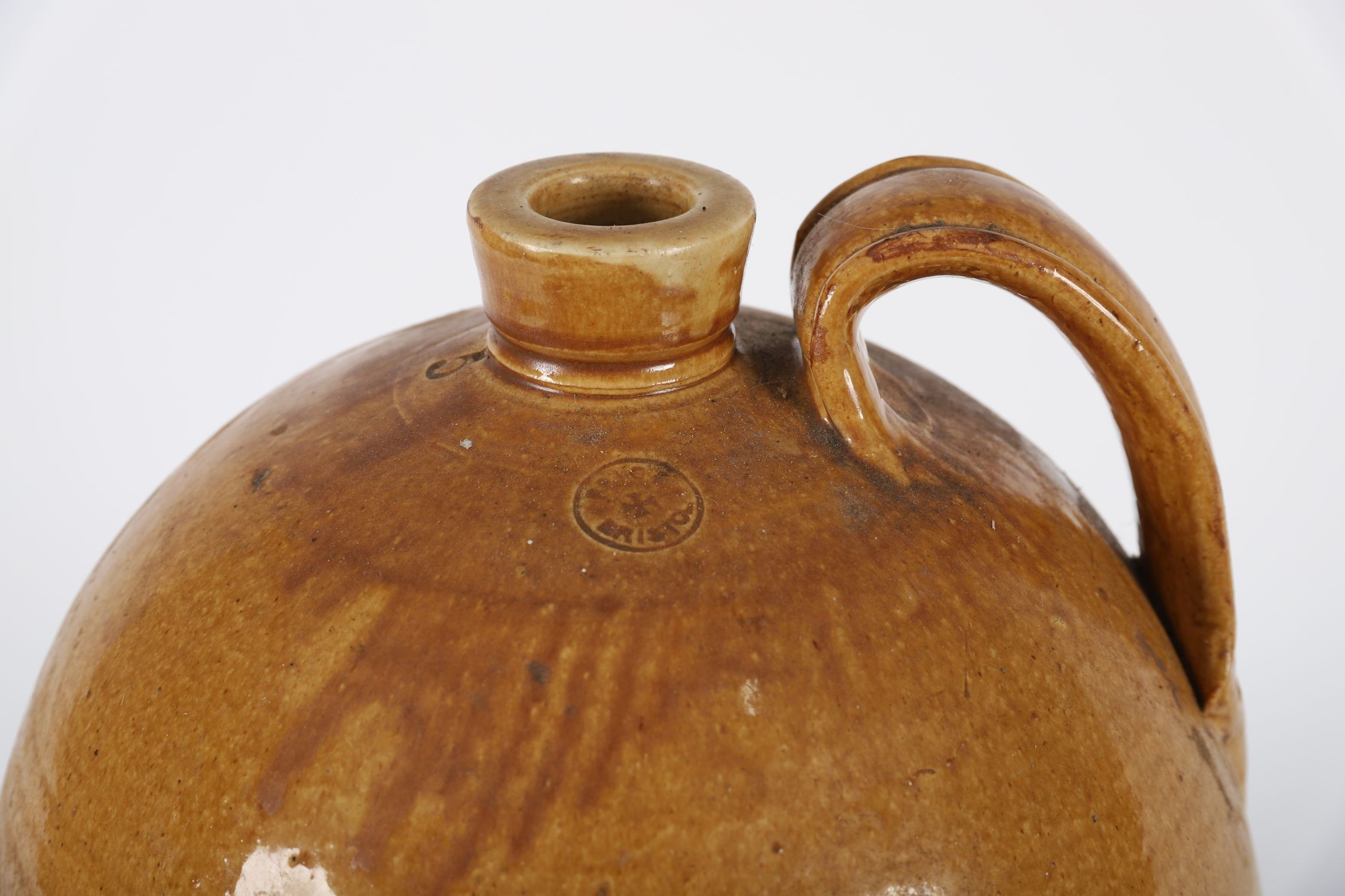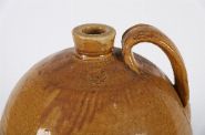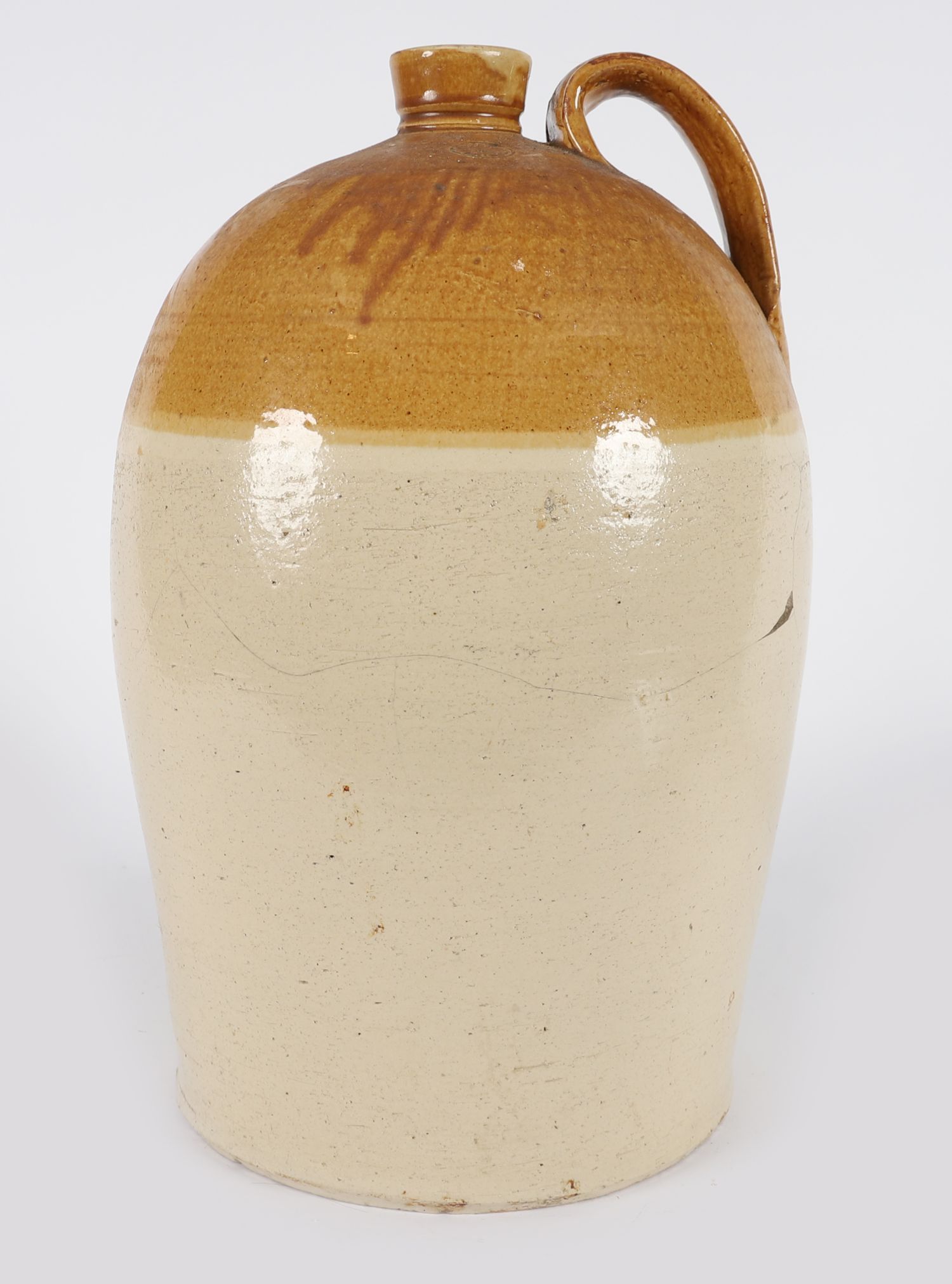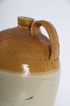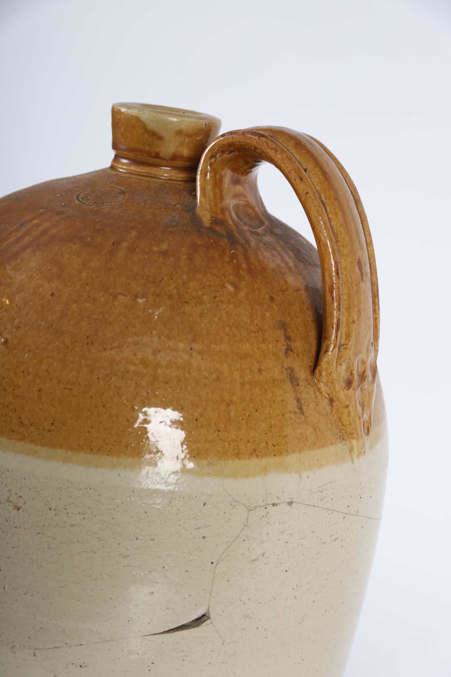 of traditional baluster form, with applied side handle and short neck. The body finished in a cream glaze below a rich ochre-brown shoulder and neck.