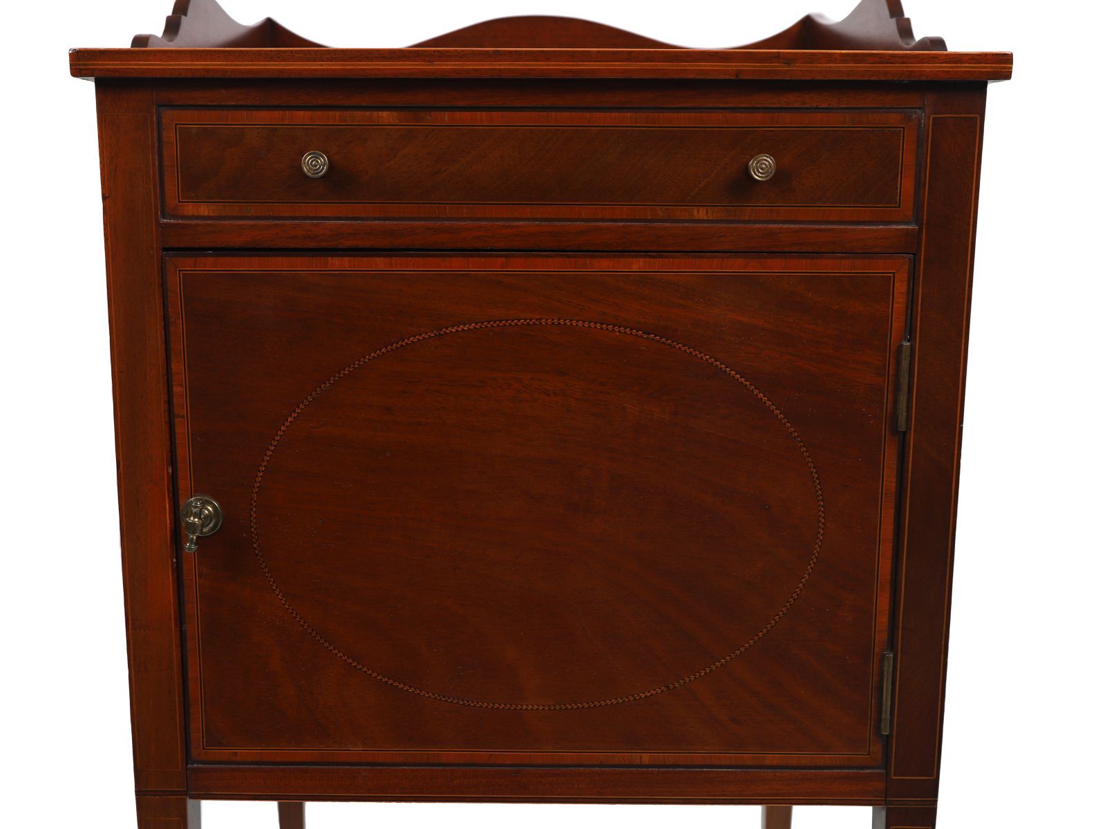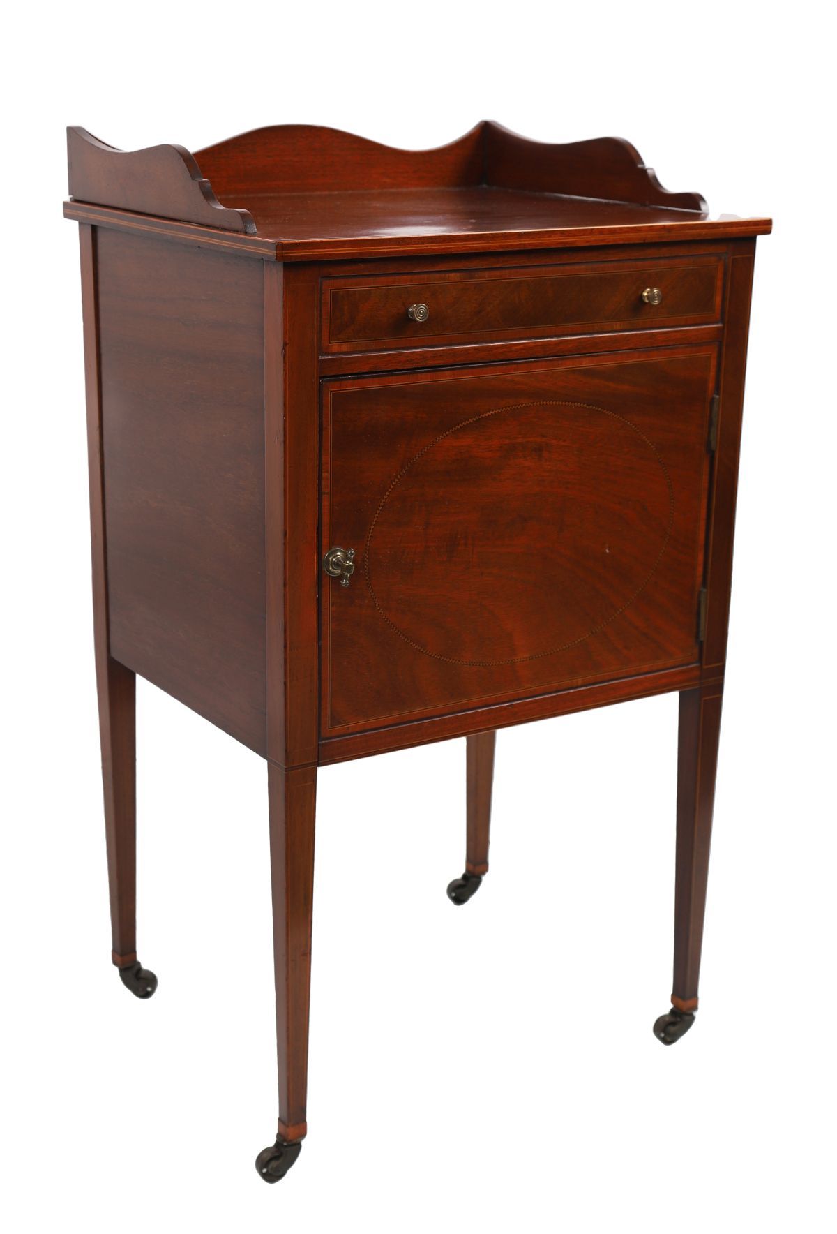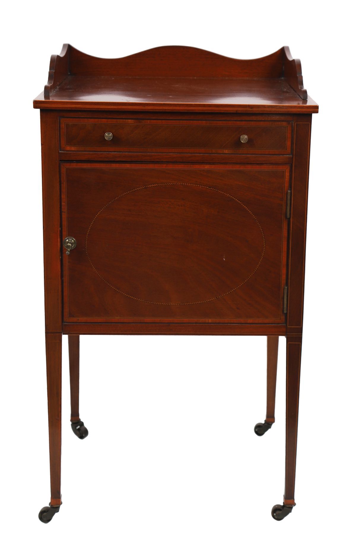 The square-shaped top below a serpentine three-quarter gallery rail, above a faux drawer and panel door, raised on square tapered legs terminating on castors.