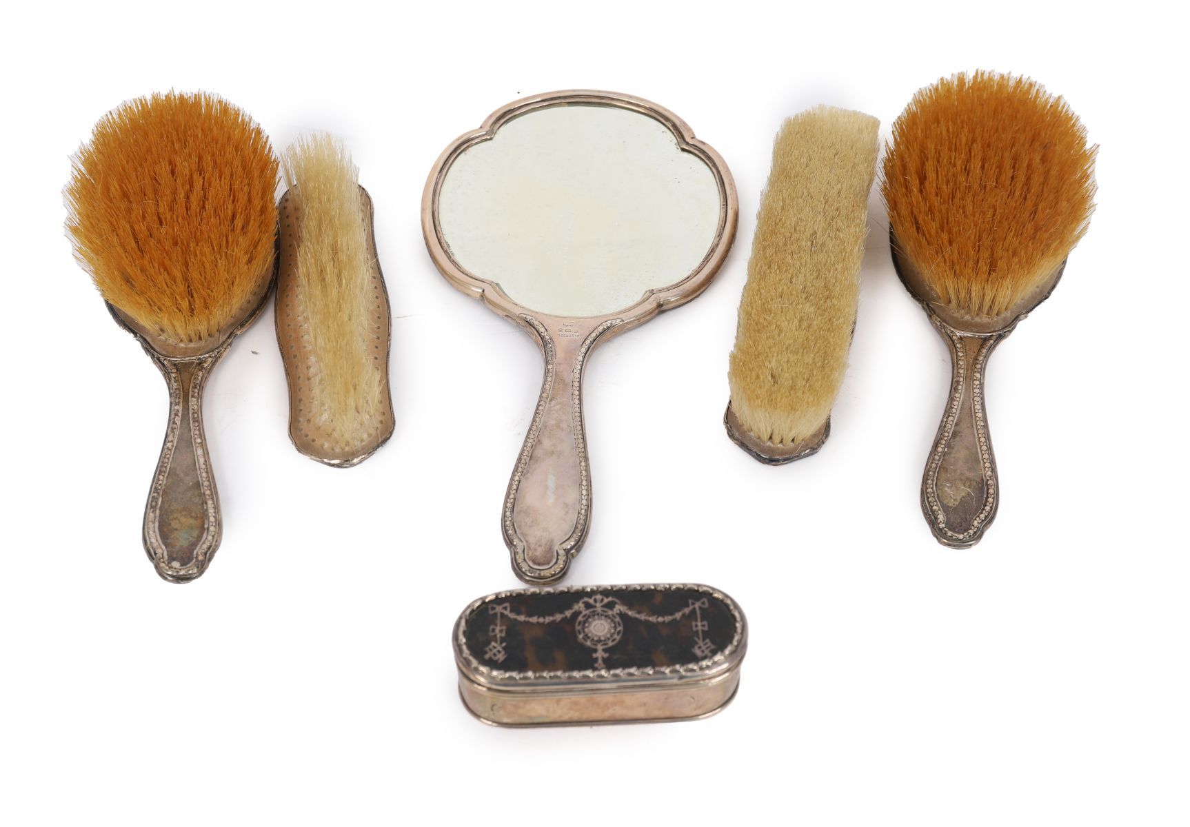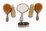 Comprising of hairbrushes, clothes brushes, and vanity unit. London 1908.