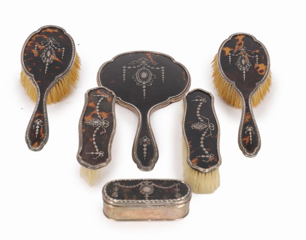 Lot 571 SUPERB TORTOISESHELL AND SILVER-INLAID VANITY SET