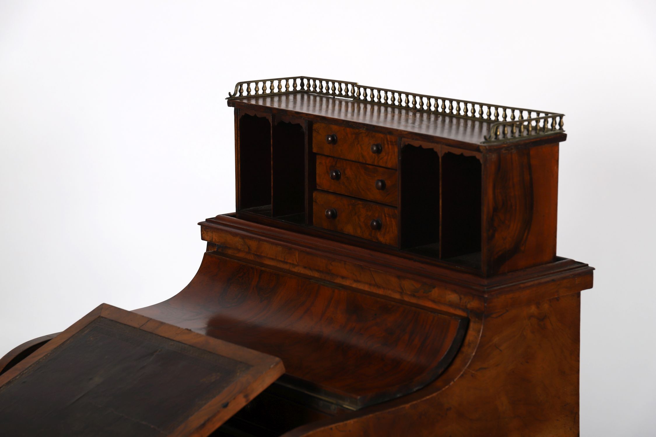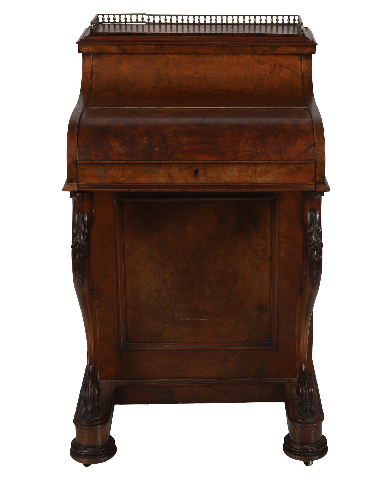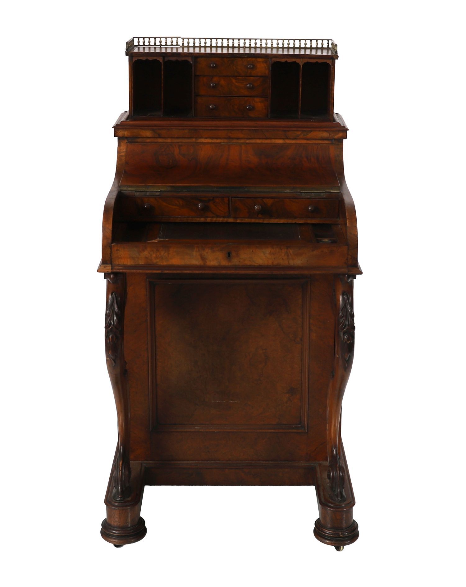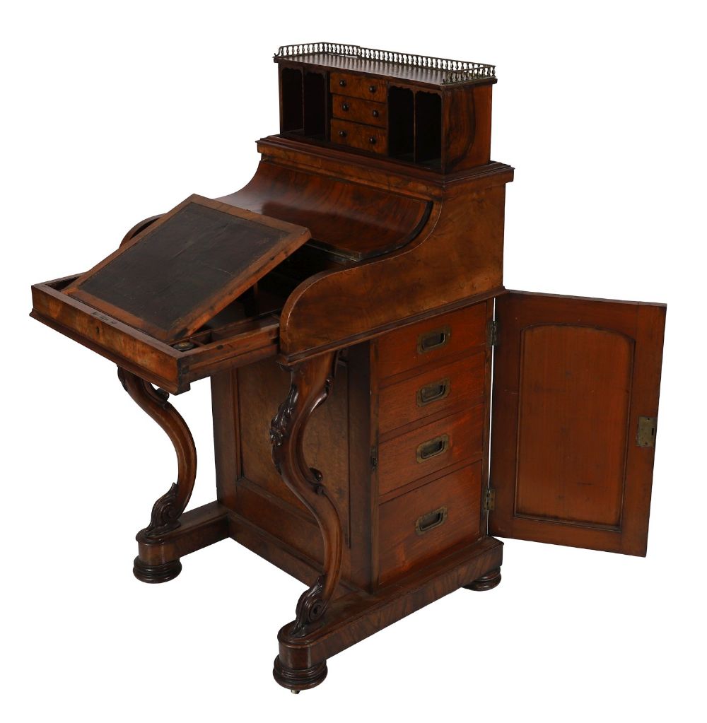 A Victorian burr walnut Jumping Jack davenport desk with fitted pop-up stationery compartment, brass gallery top, hinged writing slope, side drawers, and carved cabriole supports.