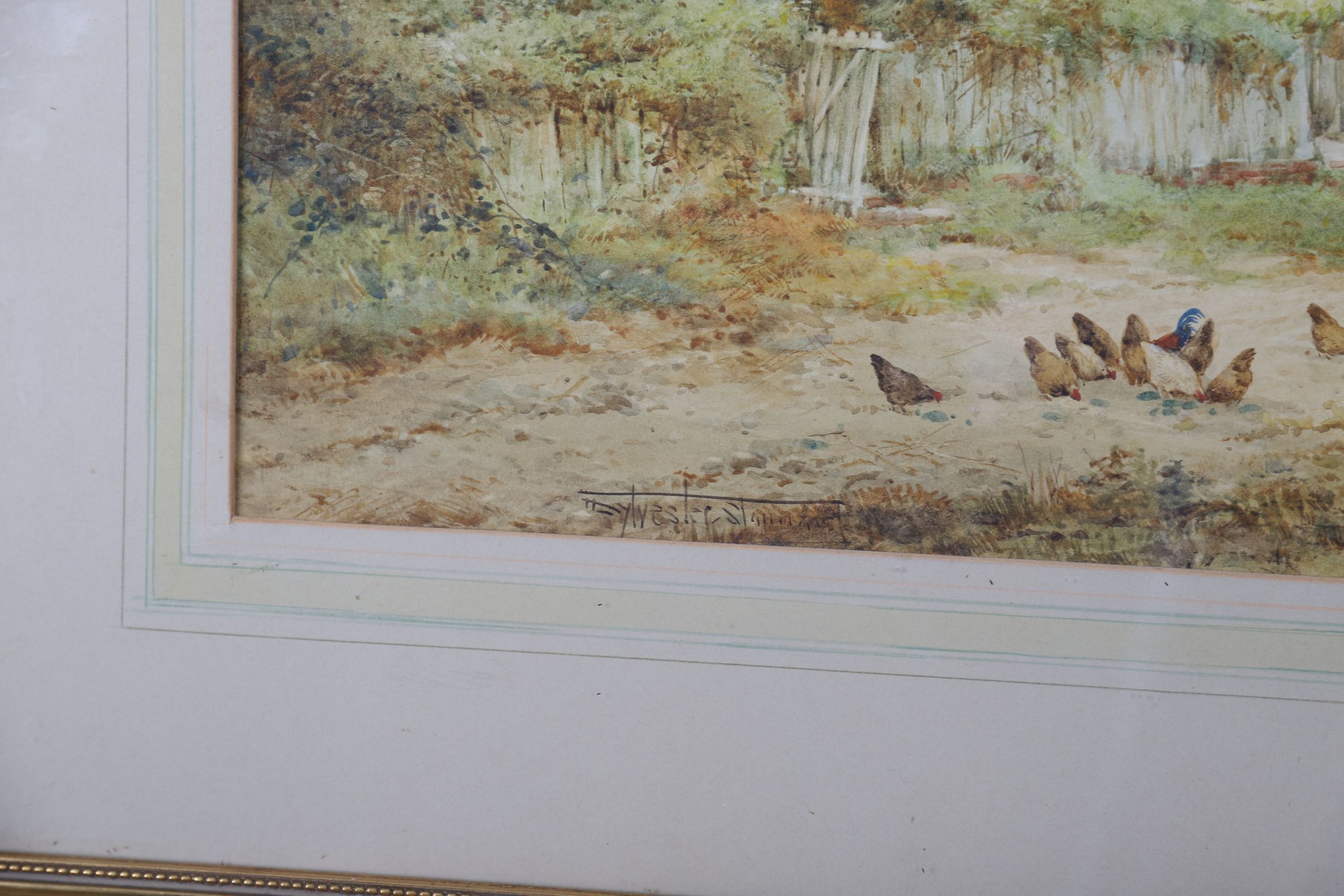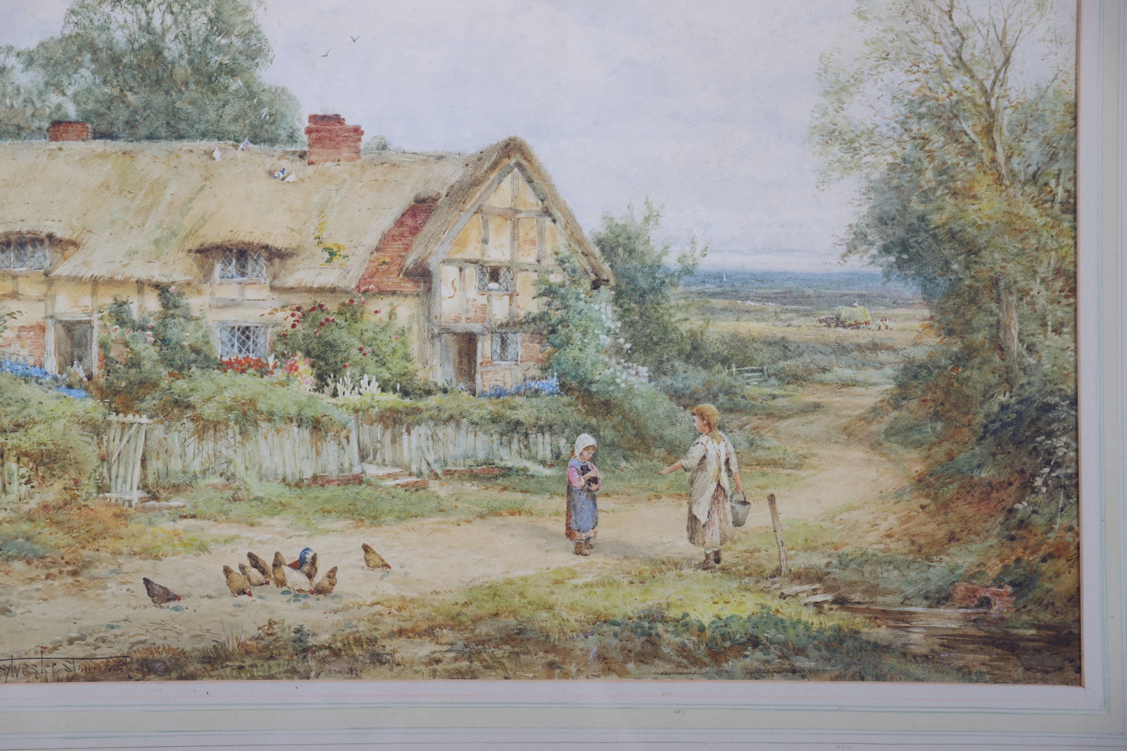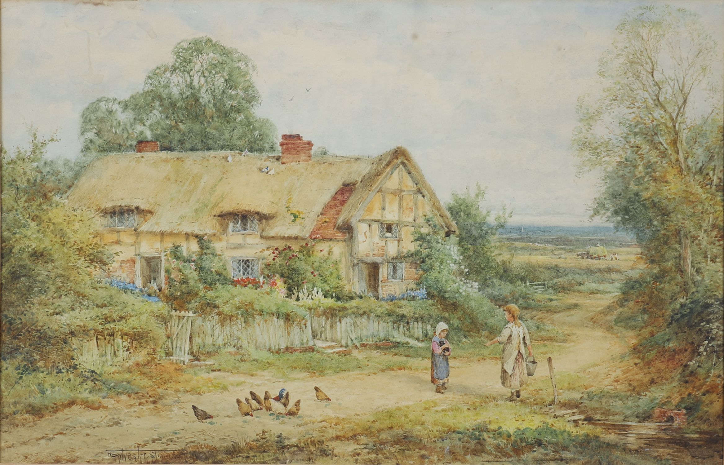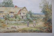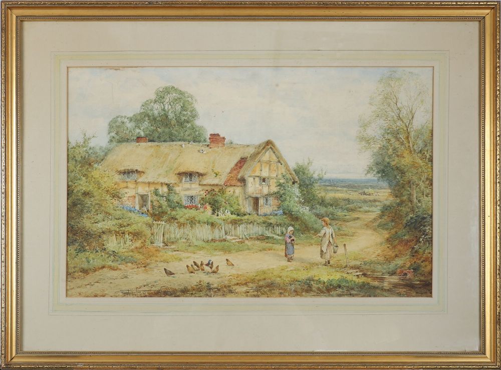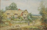 Description: A finely detailed rural watercolour of a thatched English cottage with figures and chickens in the foreground. Signed lower left.