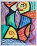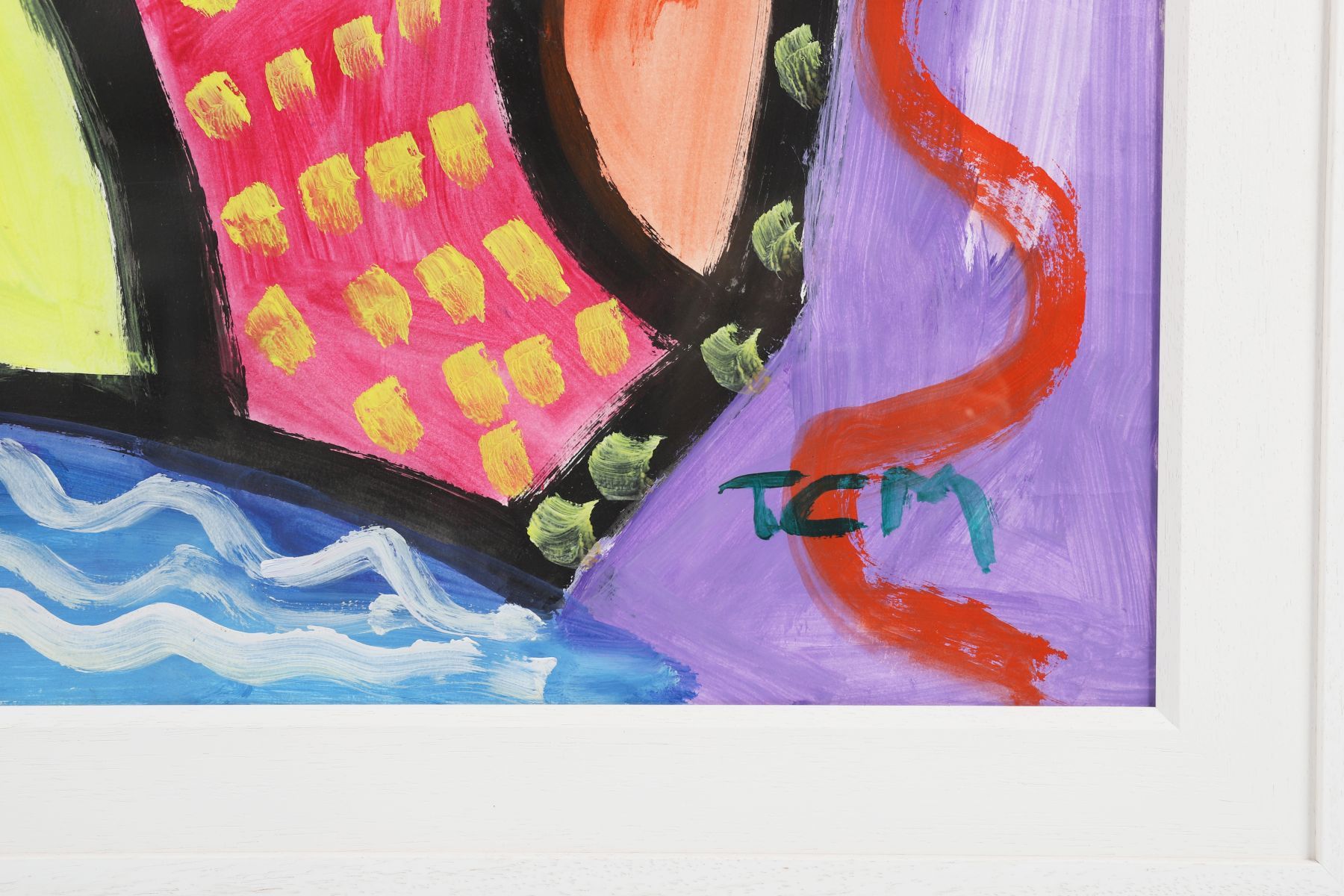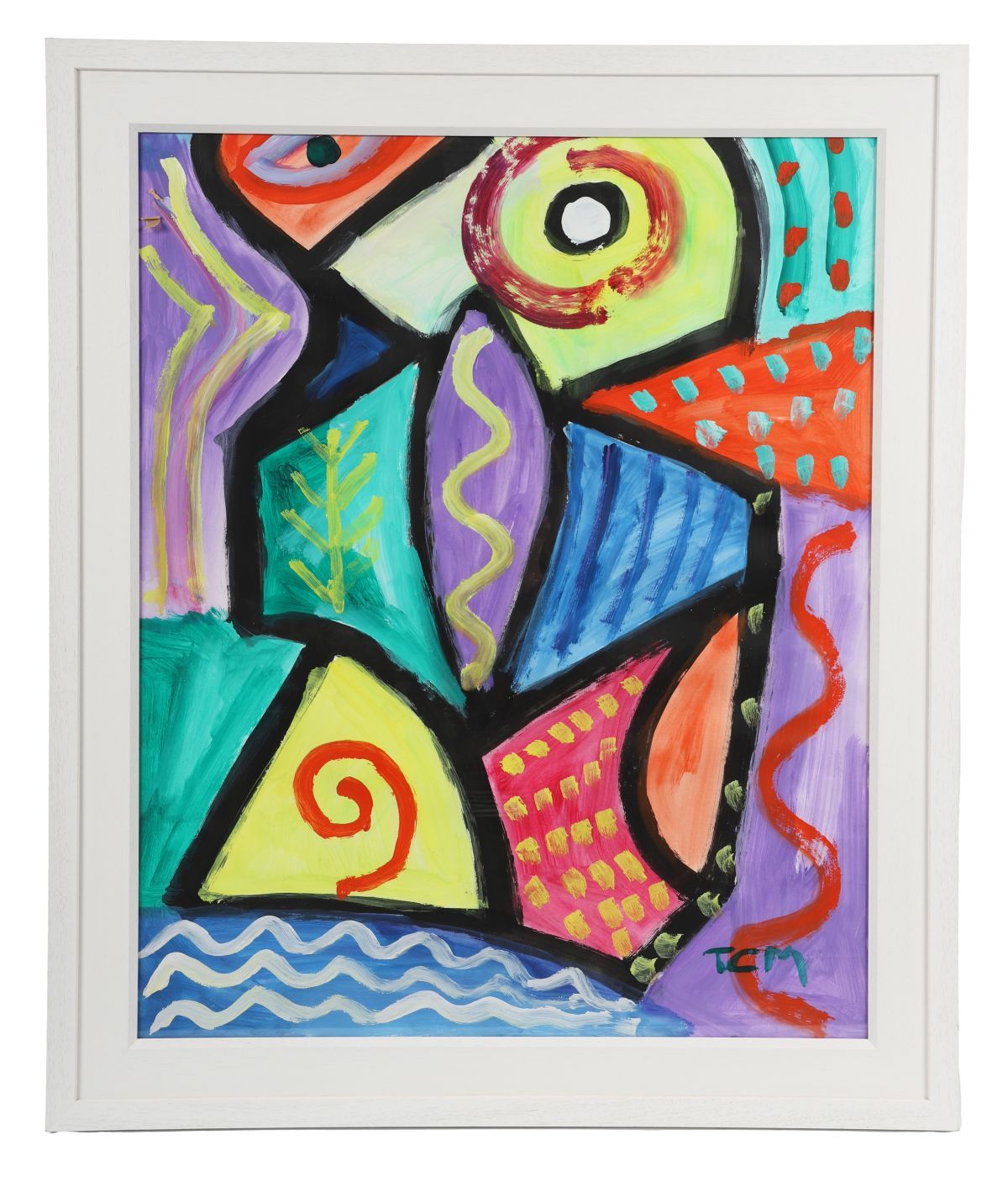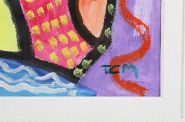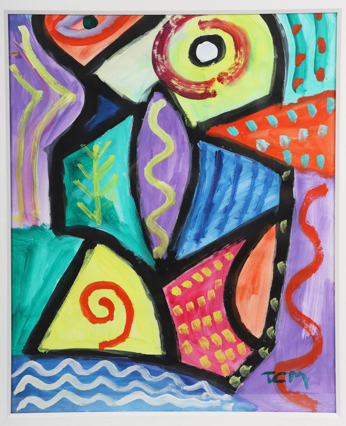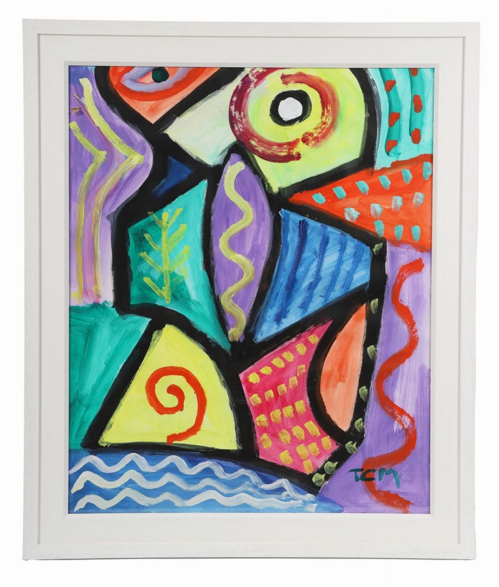 A lively abstract composition in vivid hues of red, yellow, green, and purple, incorporating rhythmic line and geometric form. The work’s playful structure and free brushwork display Murphy’s distinctive energetic modern style
