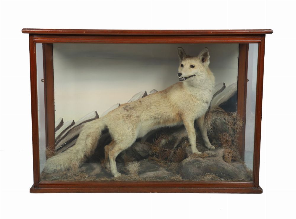 A cased taxidermy specimen of a fox posed alert within a glazed mahogany case against a naturalistic groundwork setting.