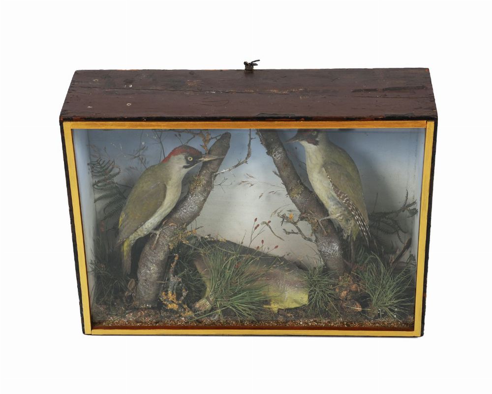 Lot 302 TAXIDERMY: CASED PAIR OF GREEN WOODPECKERS