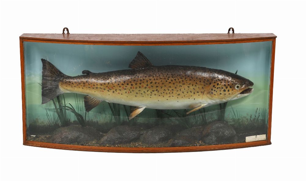 A taxidermy display of a large brown trout, mounted within a glazed bow-fronted case with painted aquatic background and groundwork base.