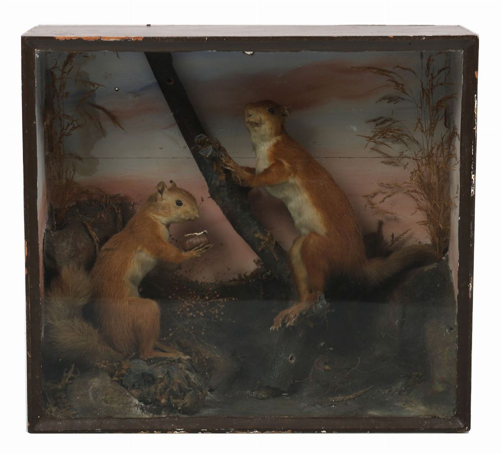 A late 19th-century taxidermy display of two red squirrels in a naturalistic setting, presented within a glazed case.