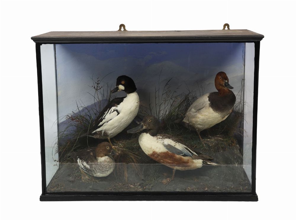 A glazed case containing four mounted ducks, including pochard and goldeneye species, displayed in a naturalistic marsh setting.