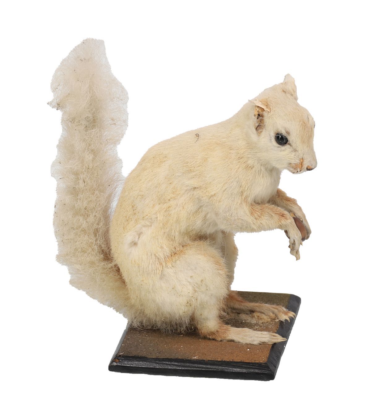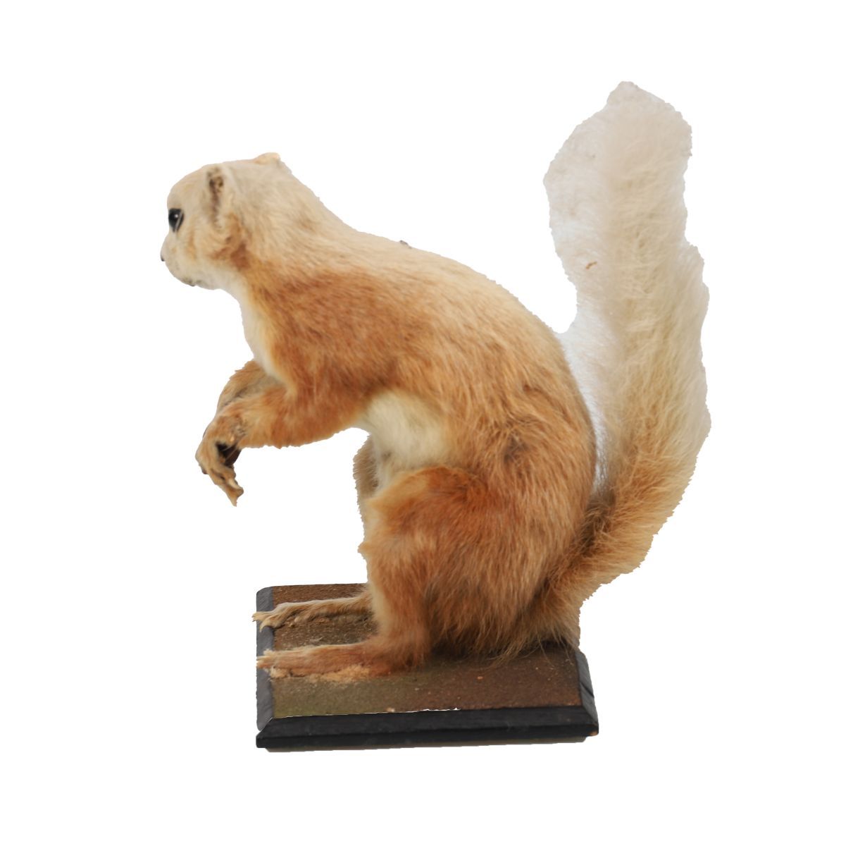 A single mounted red squirrel, posed upright on a rectangular base holding a nut.