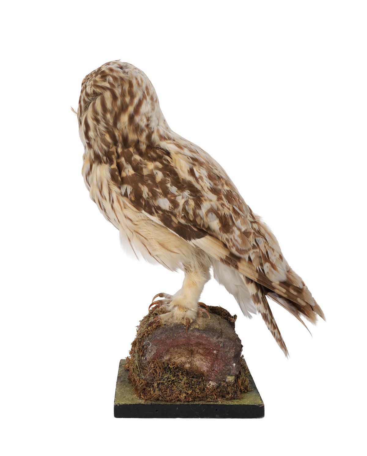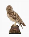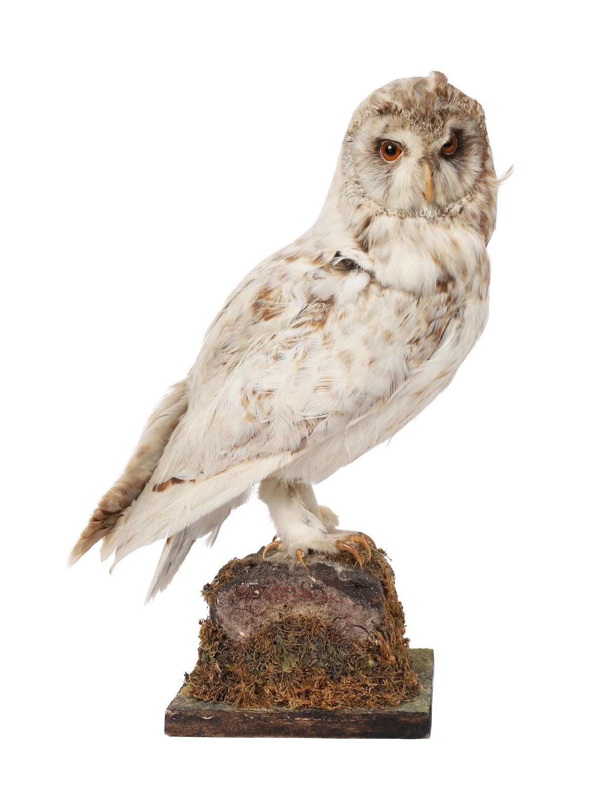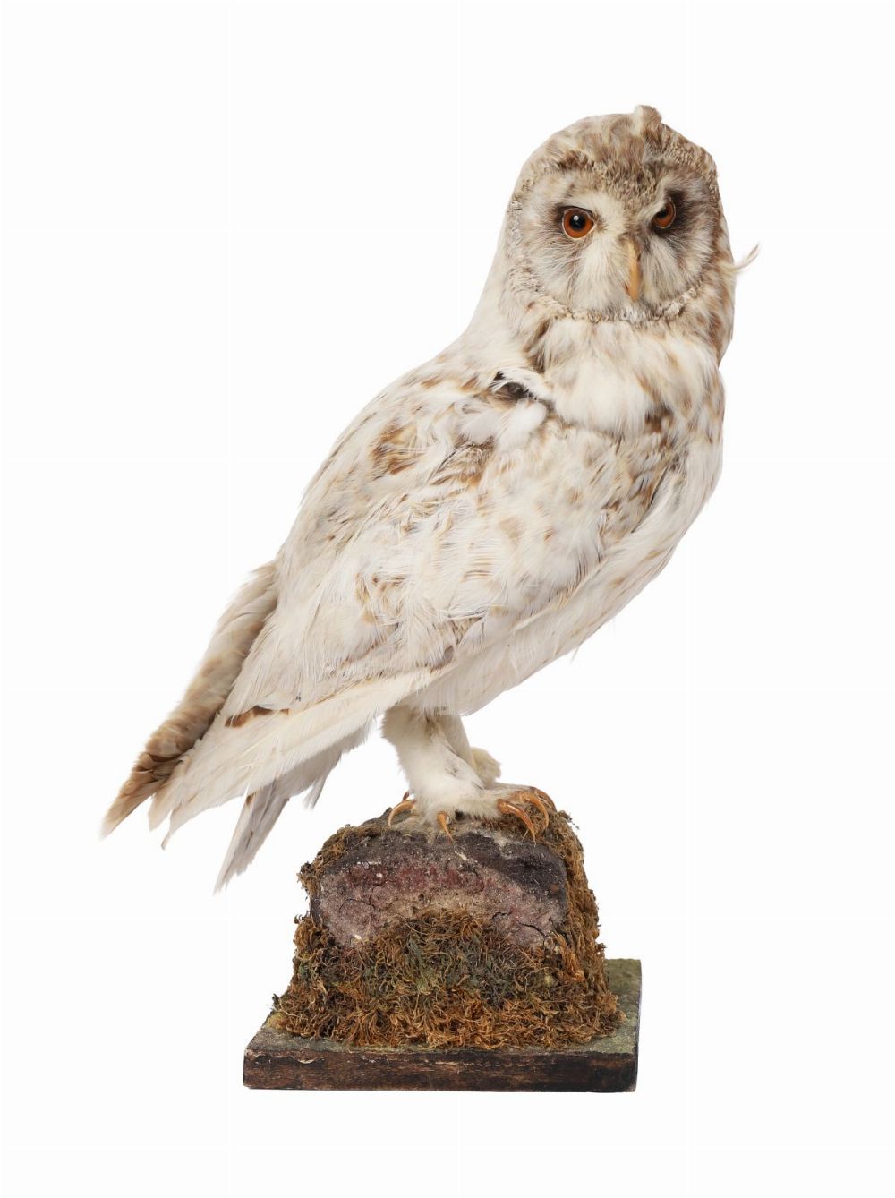 A mounted and preserved owl with naturalistic colouring, displayed on a wooden plinth with moss base. 20th century.