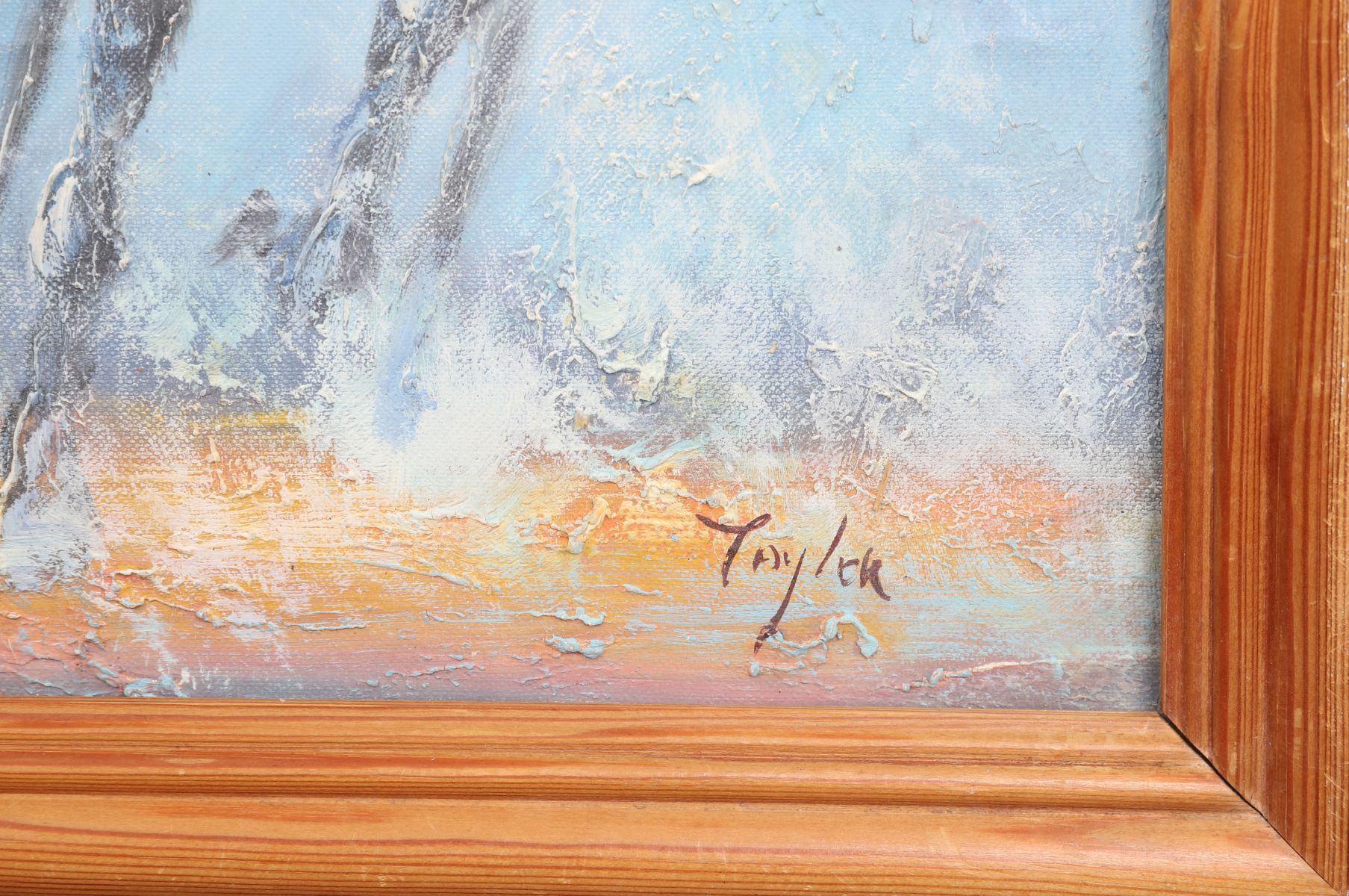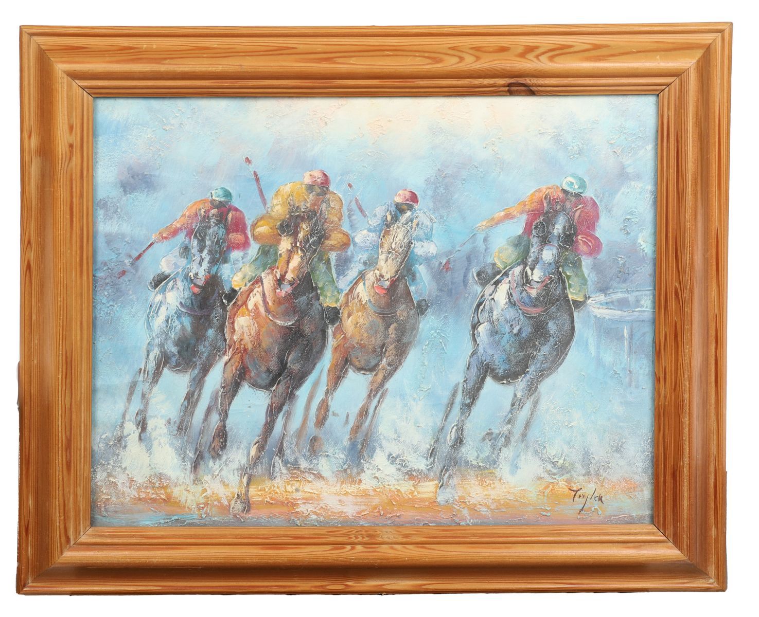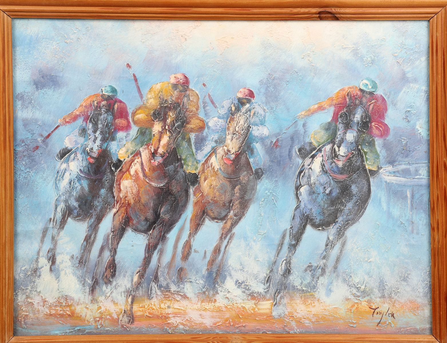 Horse racing scene. Oil on canvas. Signed bottom right. Framed.