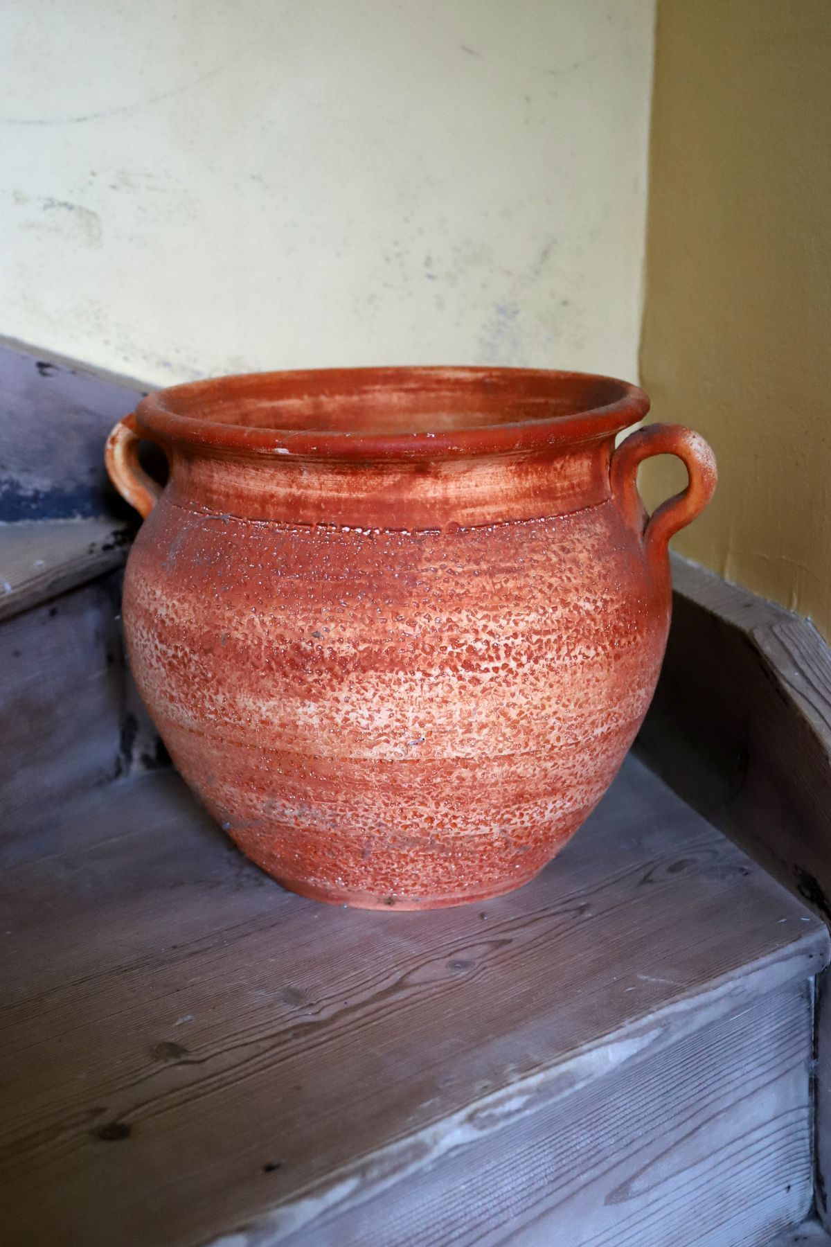 A terracotta pot of rounded form with everted rim and twin loop handles, the surface showing natural firing tones and textured glaze effects.