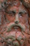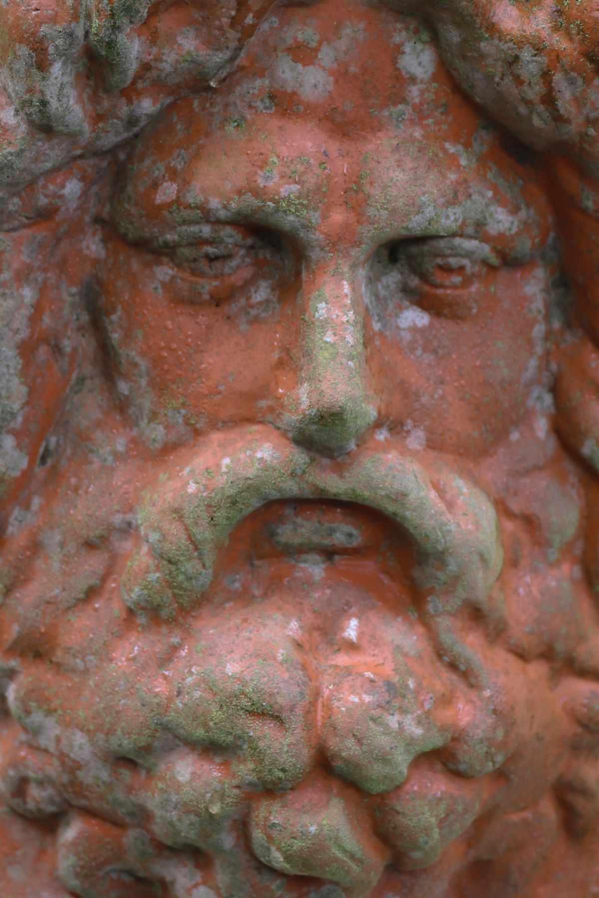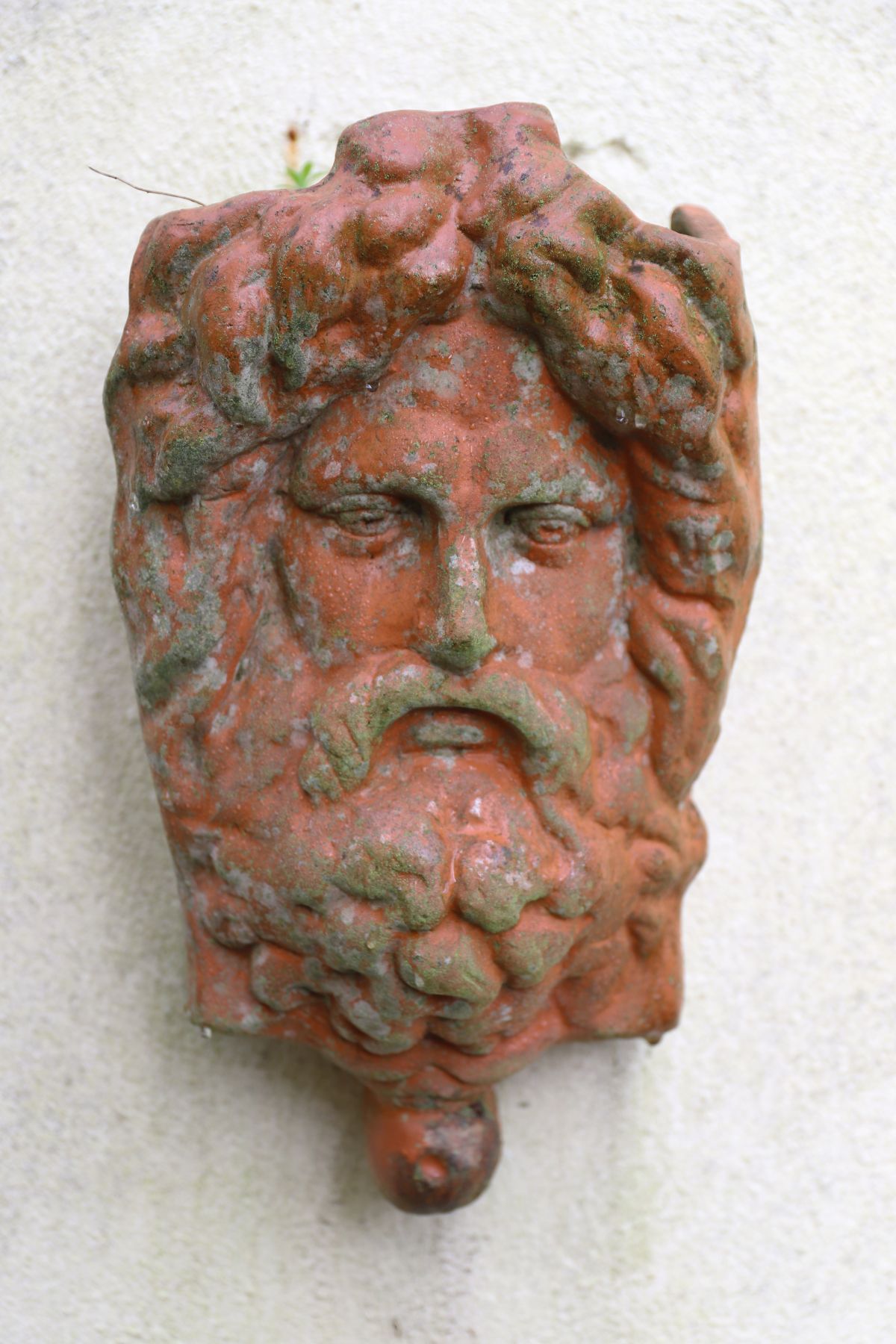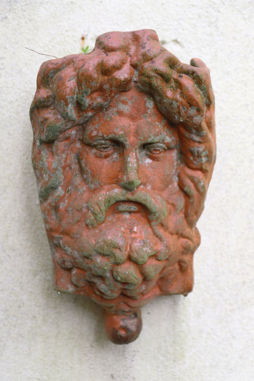 A moulded terracotta wall mask modelled as a classical bearded male head, with deeply worked hair and beard, intended as an architectural or garden wall ornament.