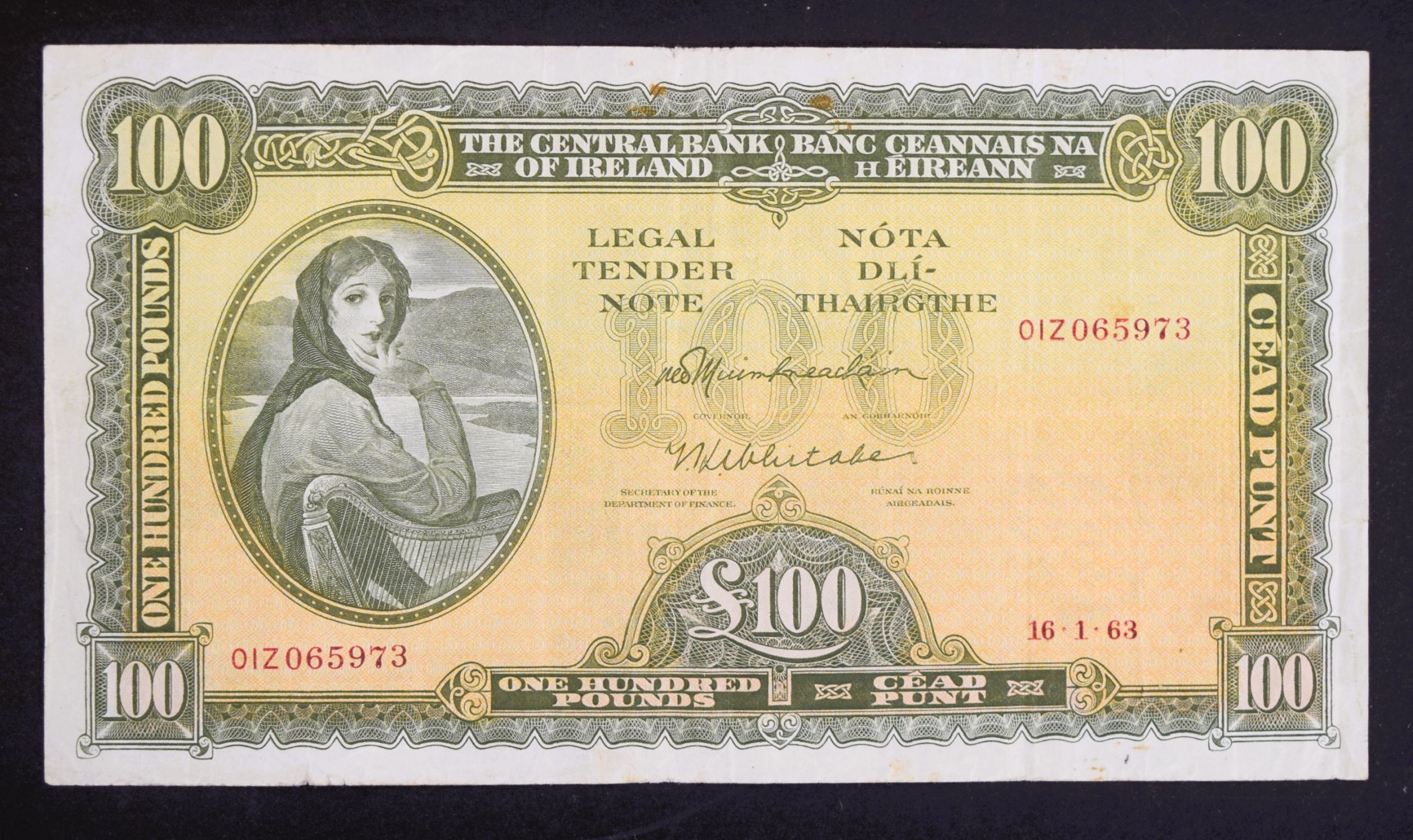 A high-denomination Lady Lavery note, one hundred pounds, dated 16 January 1963, serial 0IZ065973.