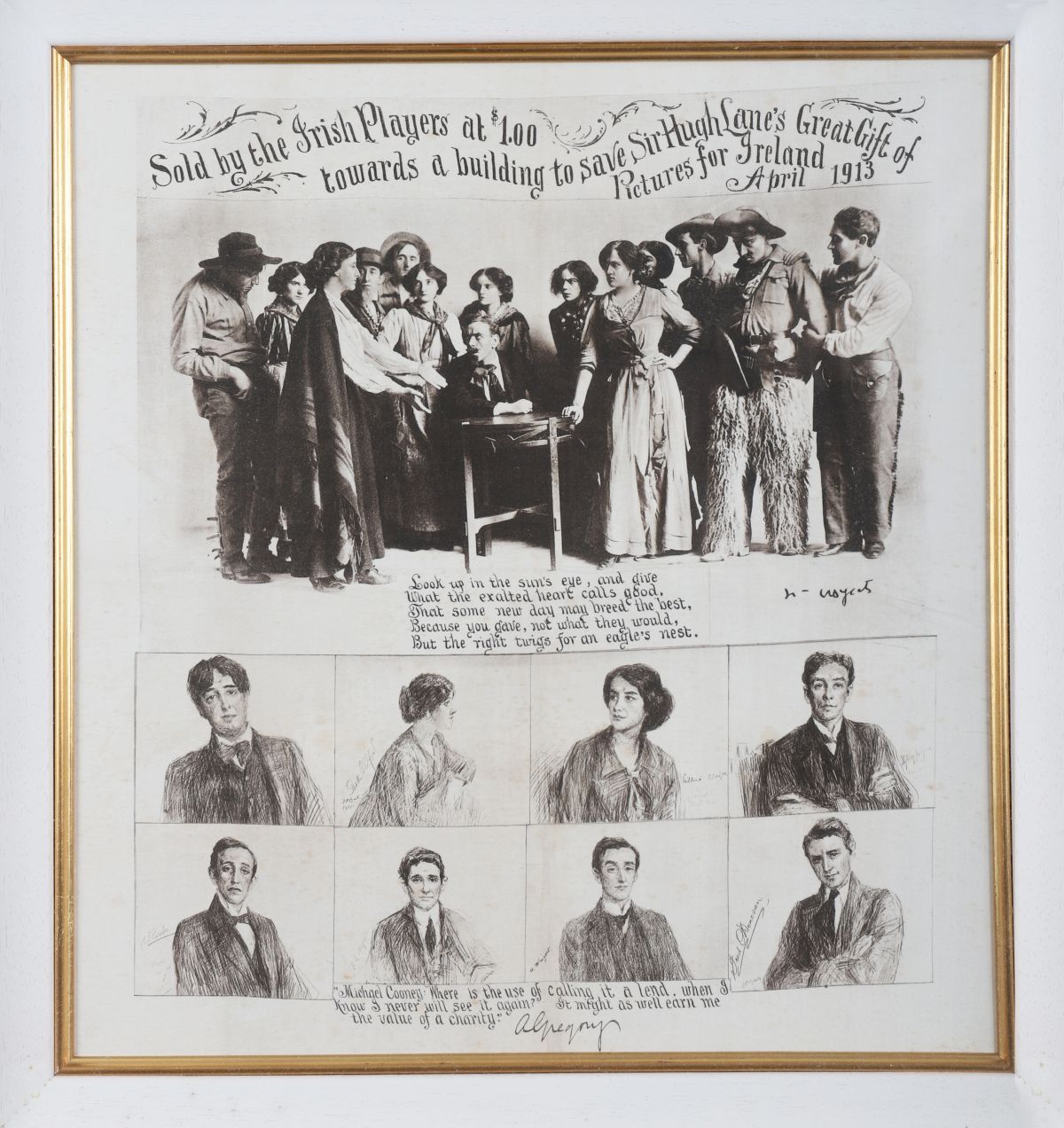 Lithographic print issued by The Irish Players in April 1913 to raise funds for a permanent home for Hugh Lane’s “Great Gift of Pictures for Ireland.” Featuring portraits and signatures of the players.