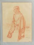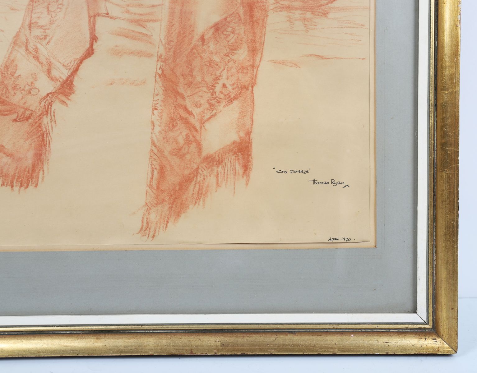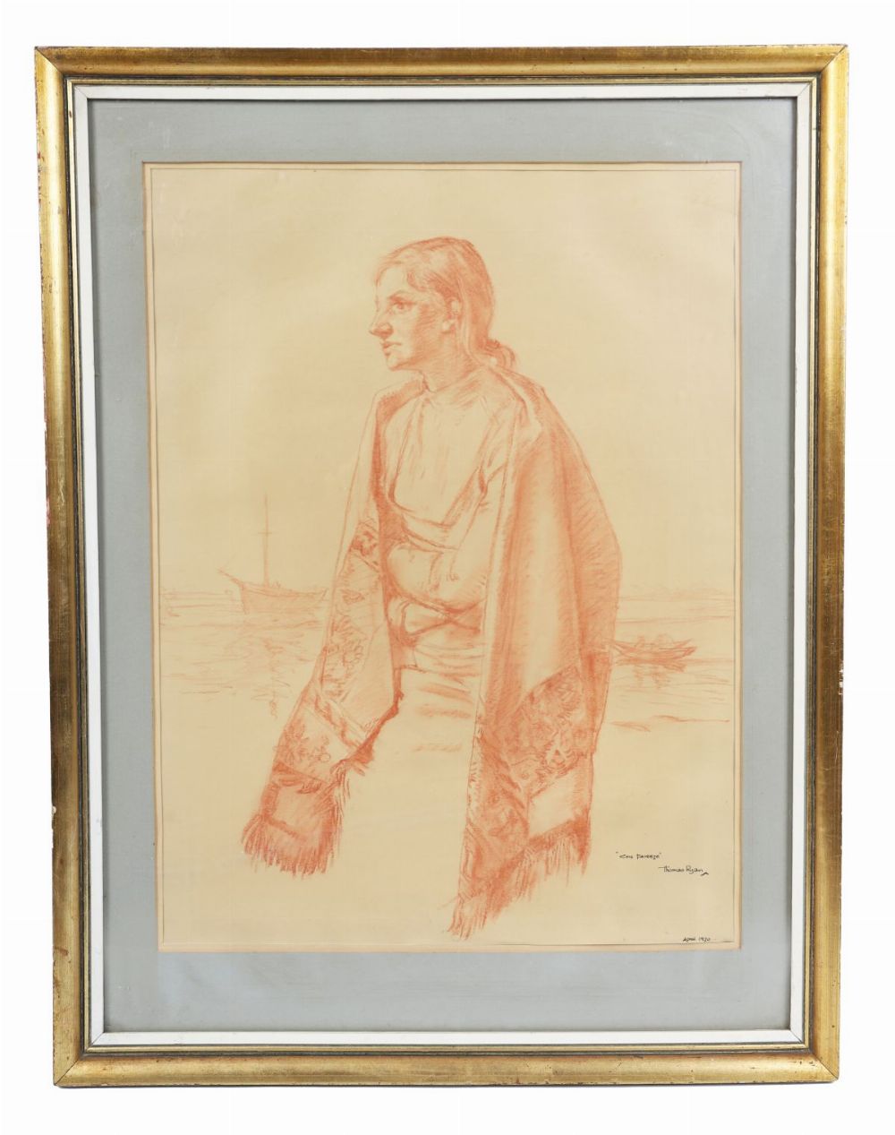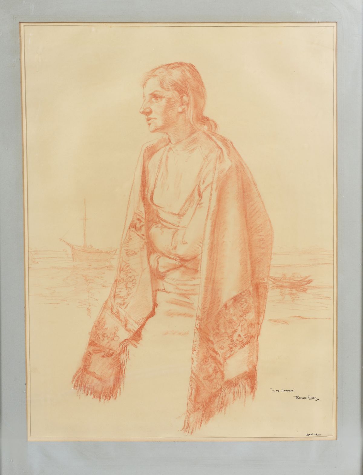 Red chalk drawing of a young woman in profile, seated near the sea with a fringed shawl draped around her shoulders. Signed lower right Thomas Ryan, dated April 1970, and inscribed Cois Fairraige.