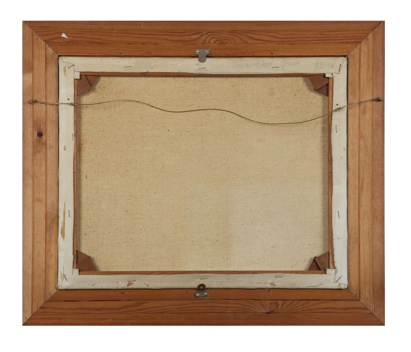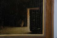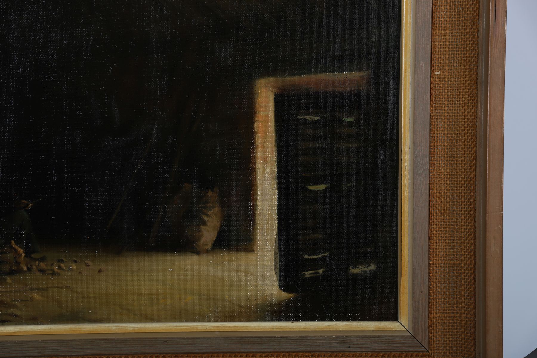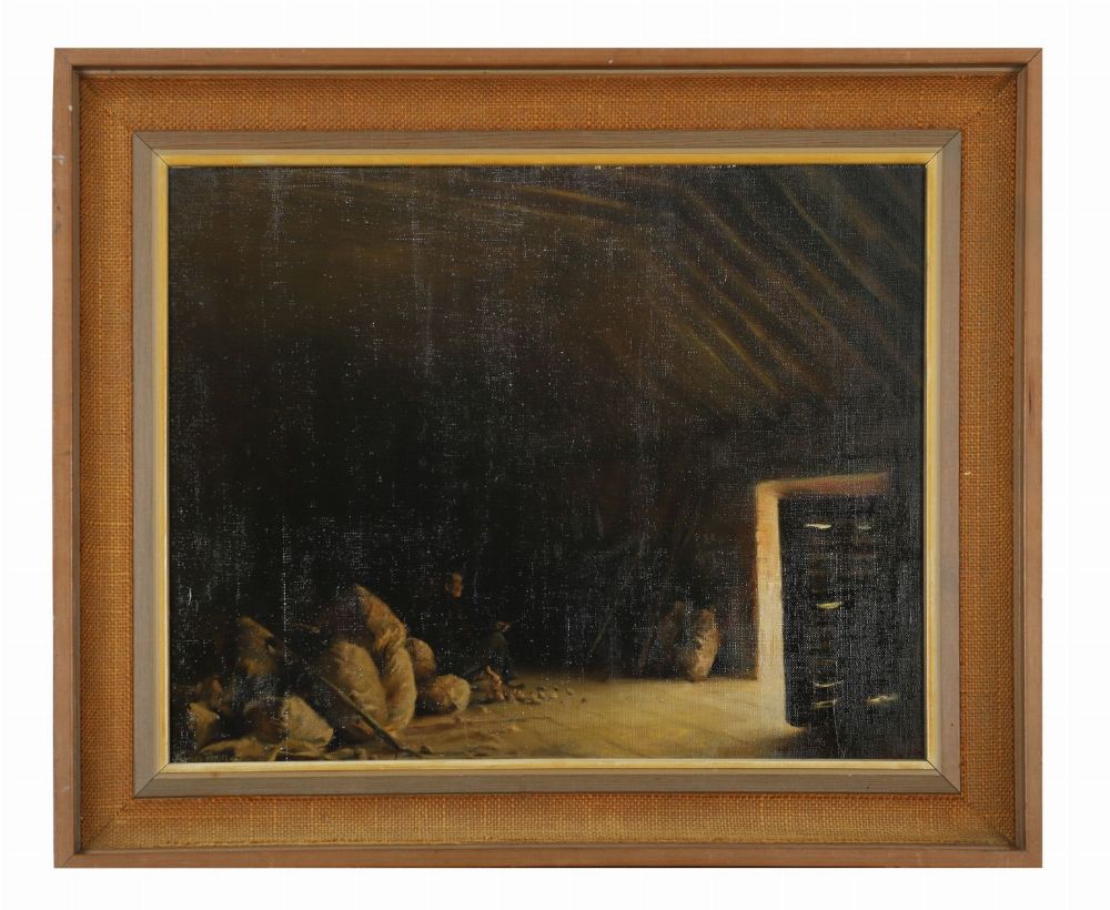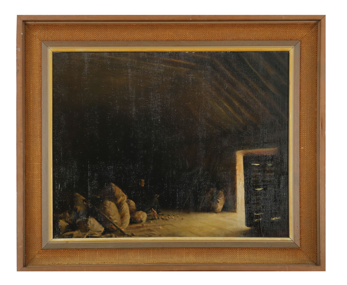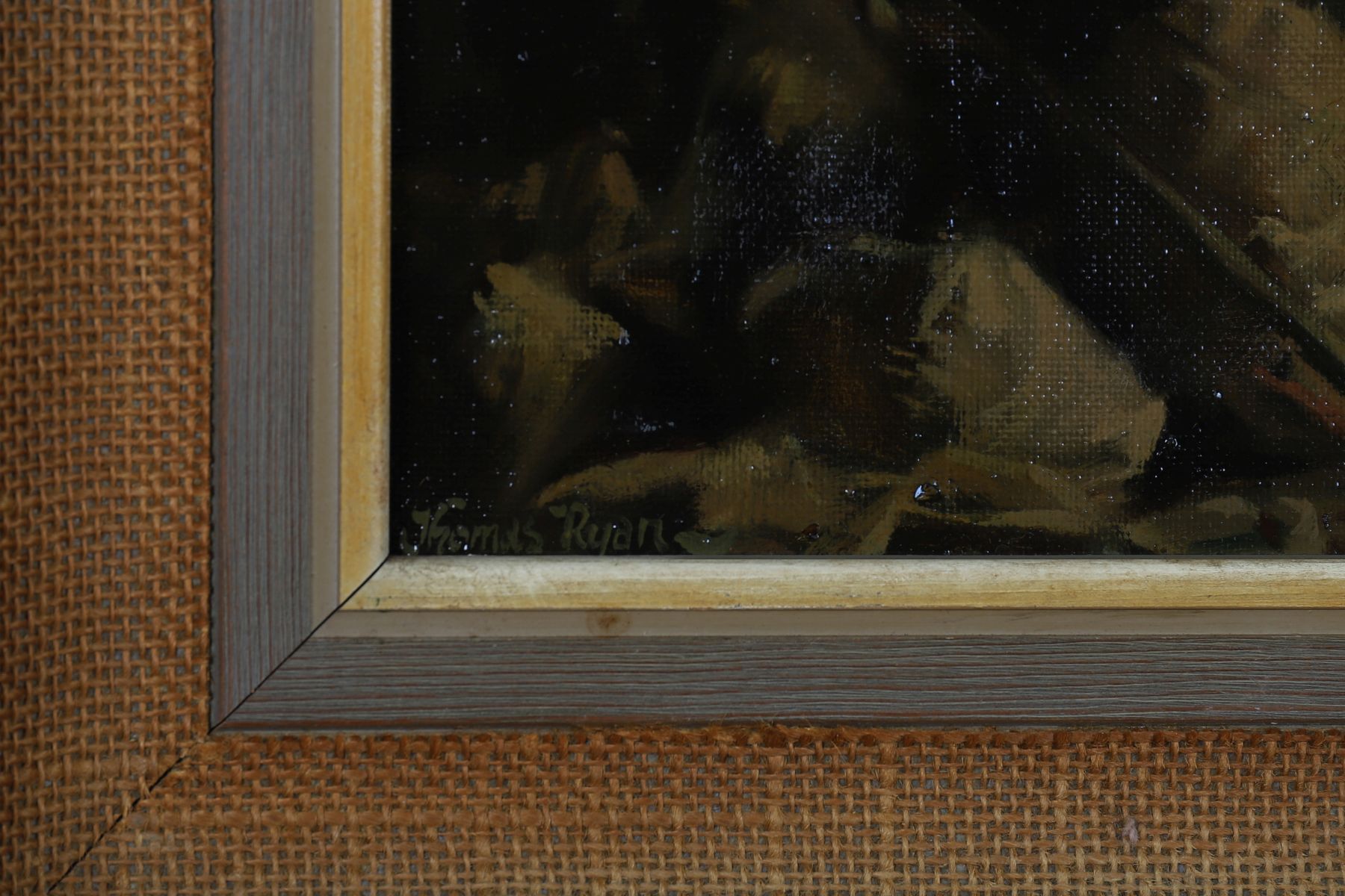 A powerful oil on canvas by Thomas Ryan depicting the interior of Joe Clarke’s loft, rendered with dramatic chiaroscuro and rich tonal contrast. The dimly lit scene evokes the quiet resilience and atmosphere of post-revolutionary Dublin, reflecting Ryan’s characteristic narrative realism and sense of place. Signed lower left. Presented in a textured gilt and hessian-lined frame.