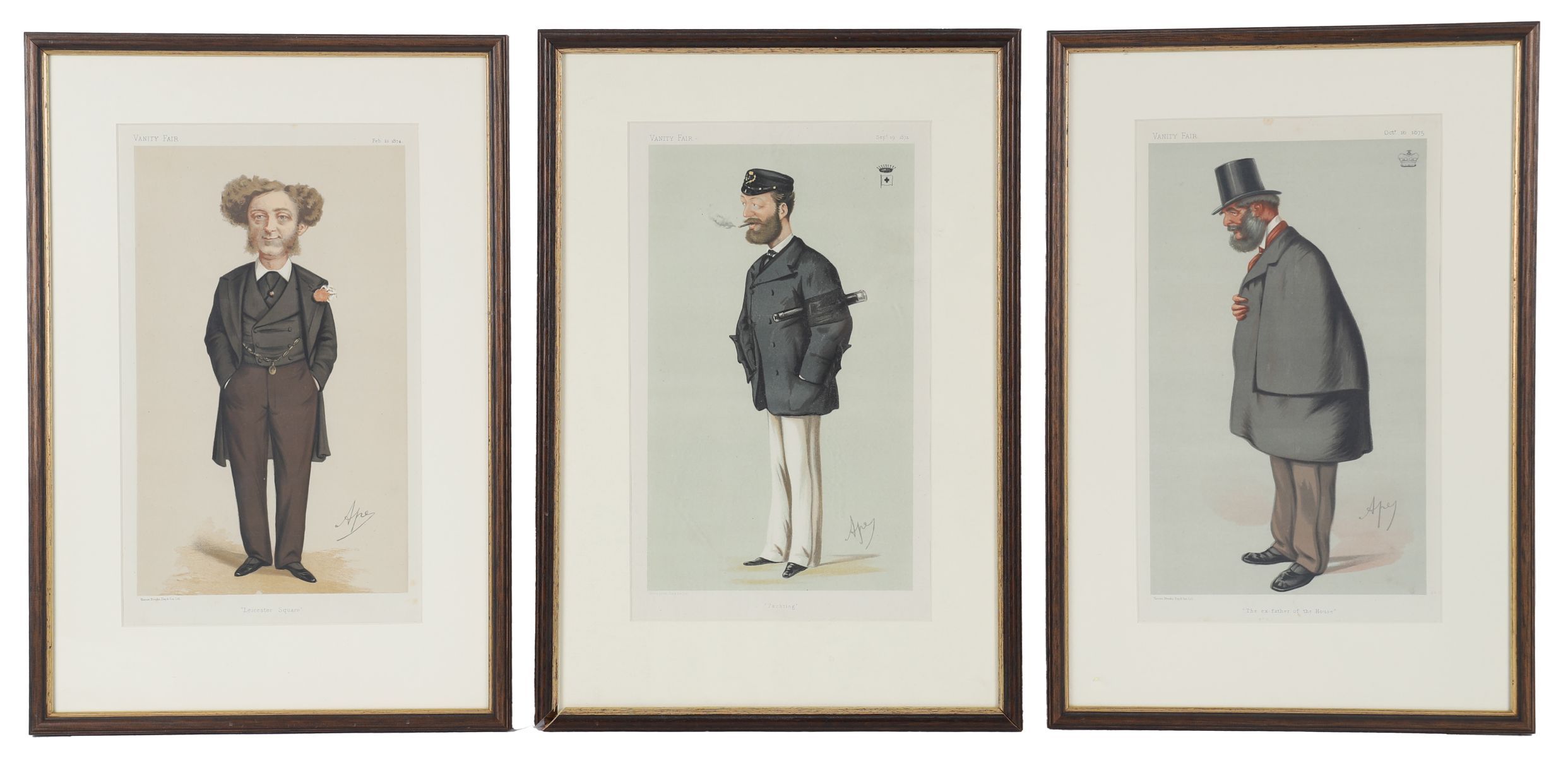 Signed by APE, titled “THE EX-FATHER OF THE HOUSE,” “LEICESTER SQUARE,” and “YACHTING,”.