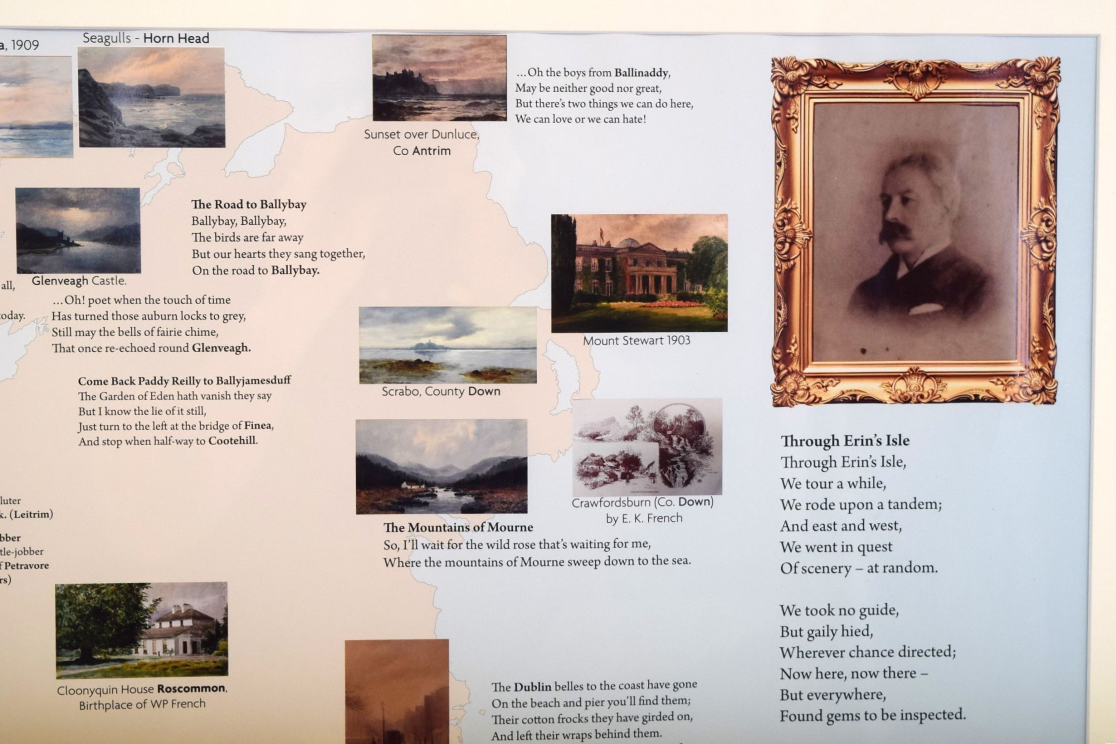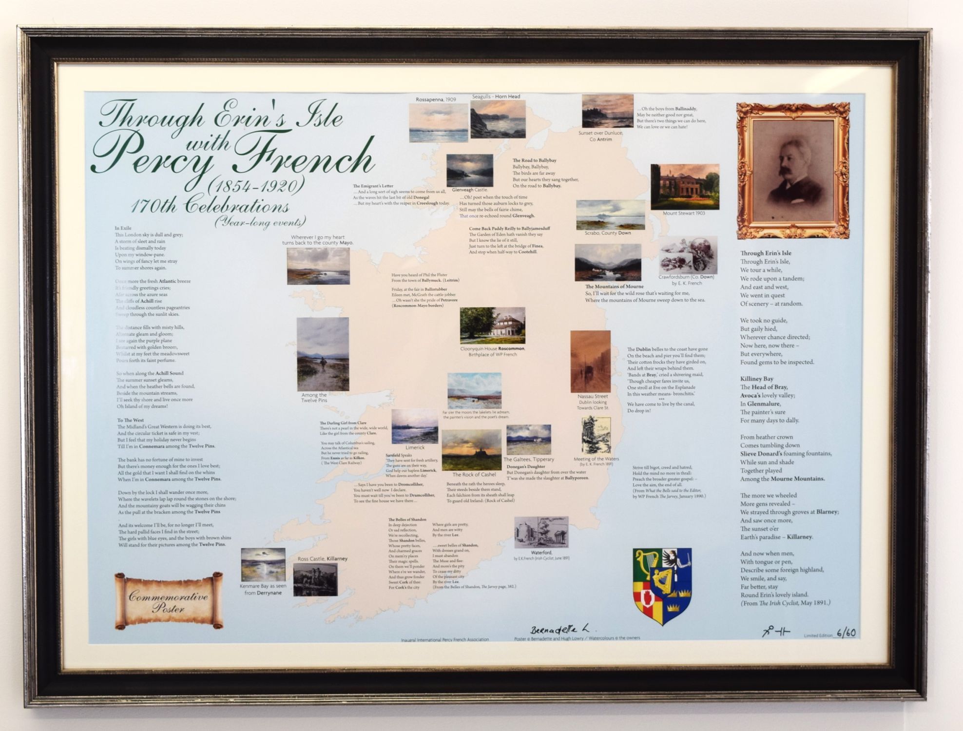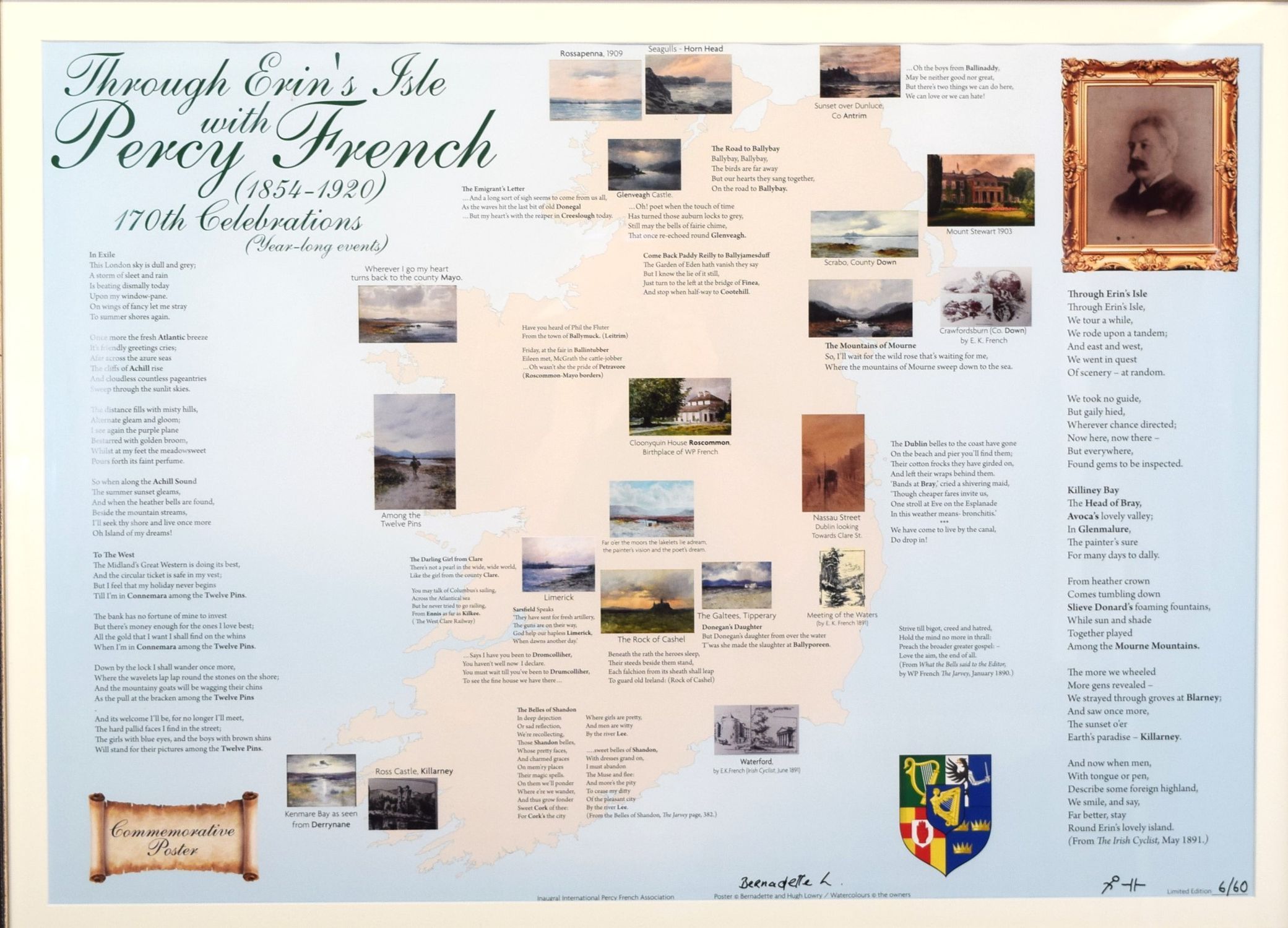 A limited edition commemorative poster (no. 6/60), celebrating the 170th anniversary of Irish artist and songwriter Percy French, 1854-1920. The pictorial work includes map imagery, verse, and reproductions of French's watercolours. Framed and signed in the margin.